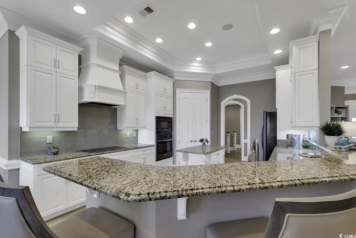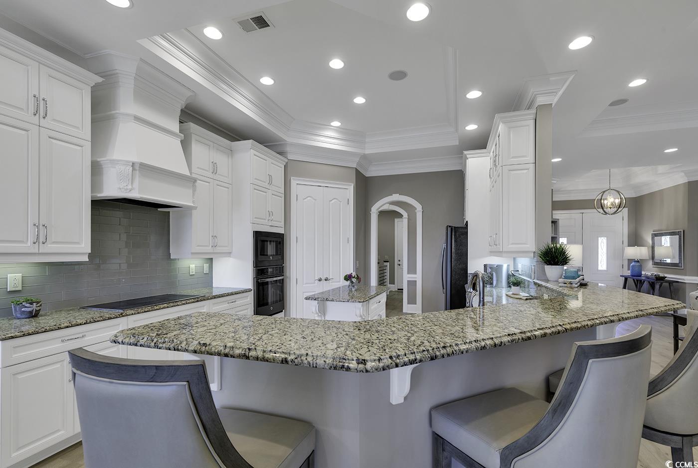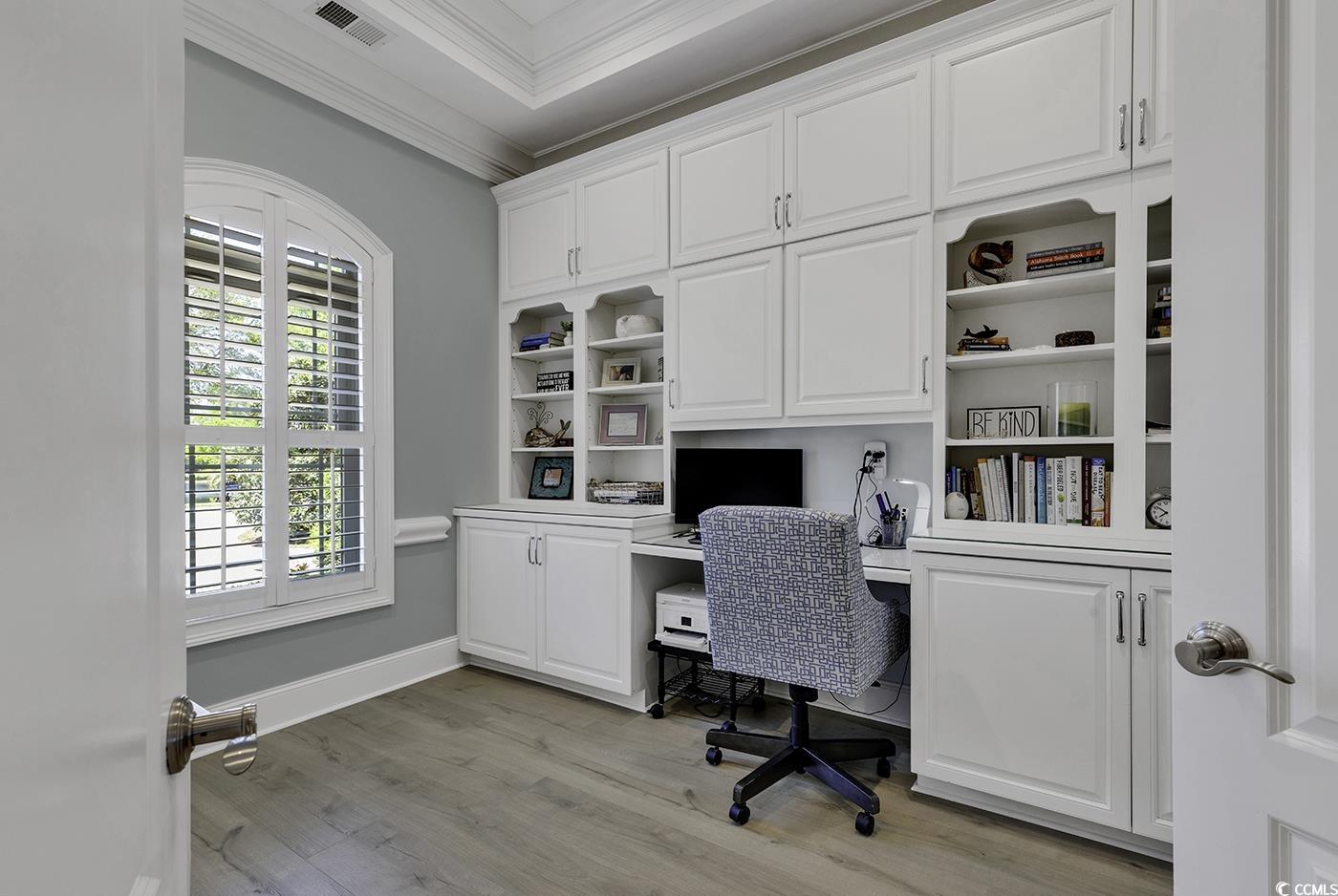 Impressive Custom Home. Welcome to your dream home in the highly desirable Surf Estates of North Myrtle Beach. This stunning custom-built residence offers exceptional craftsmanship, thoughtful design, and a serene lakefront setting. Step into a spacious open-concept family room with expansive views of the lake, perfect for relaxing or entertaining. The adjacent Carolina room invites you to enjoy gentle afternoon breezes and abundant natural light year-round. The beautifully appointed kitchen features premium finishes and flows seamlessly into the family room and large dining area—ideal for gatherings both casual and formal. The main level includes a luxurious primary suite, plus a second master suite for added flexibility. A private office on the main floor provides the perfect space for working from home. Throughout the home, you’ll find gorgeous hardwood floors and classic plantation shutters that add timeless elegance. The lower level offers a generous recreation room, a dedicated craft room, expansive storage, and a spacious guest bedroom and bath with direct backyard access and a separate living area—ideal for multigenerational living or long-term guests. Set in a peaceful and private location, this home truly has it all—space, style, and sought-after amenities—all just minutes from the beach, golf, shopping and dining.