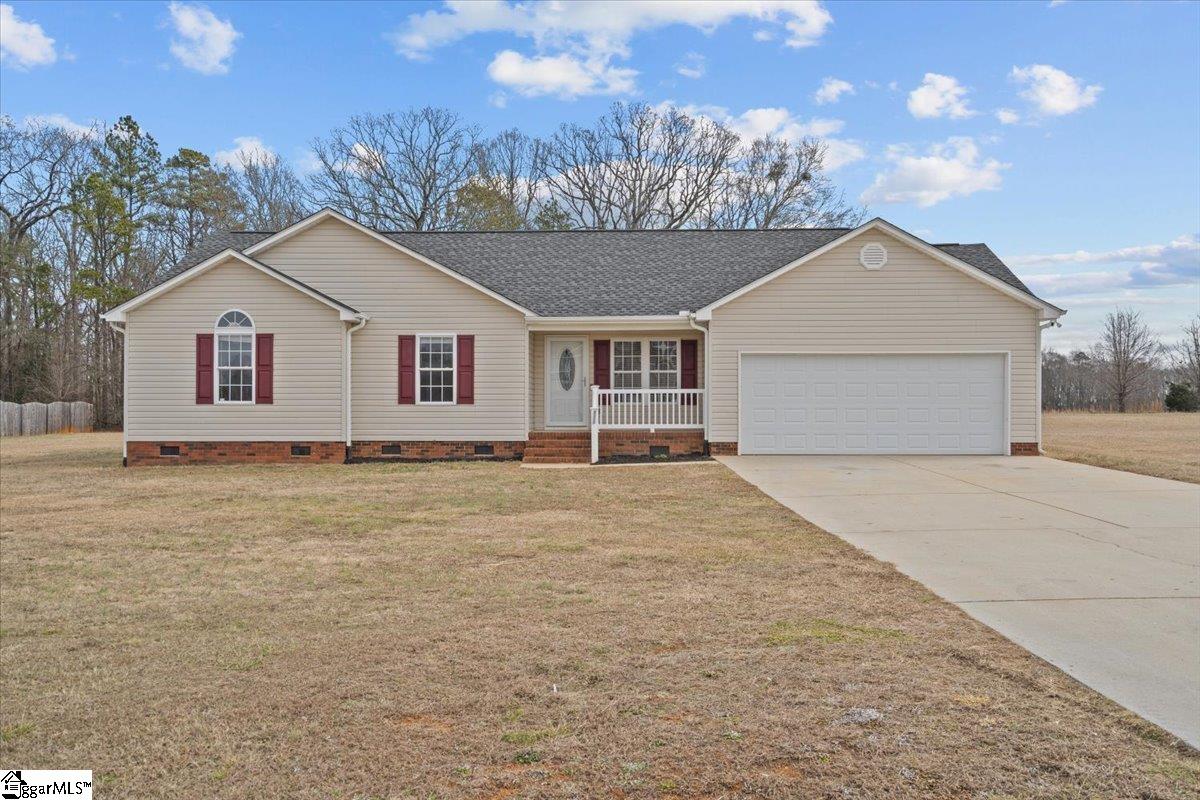 Move-in ready and perfectly positioned for peaceful living with everyday convenience. This charming 3 bedroom, 2 bath ranch sits on a generous .74 acre lot. From the moment you arrive, you’ll appreciate the home’s classic curb appeal. A welcoming front porch, clean landscaping, concrete driveway, and attached two car garage gives perfect home vibes with timeless style, while the expansive front and backyard create a true sense of space and privacy. Inside you'll find a bright, freshly maintained interior featuring warm flooring, neutral paint tones, and a comfortable, flowing layout. The living area is inviting with vaulted ceilings and natural light, creating space to relax or entertain. The kitchen offers abundant cabinetry, plenty of counter space, and an easy connection between the garage and main living area for everyday functionality. Just down the hall are two bedrooms, bath and the primary bedroom which features an ensuite bathroom and walk in closet. Located in an area known for great schools and offering an easy drive to nearby job centers, this home delivers the best of both worlds quiet charm with practical access to amenities. A storage building provides added convenience, and with no HOA, you have the freedom to use the property your way. If you’ve been searching for space, privacy, and move-in ready comfort without sacrificing convenience, this is the one.