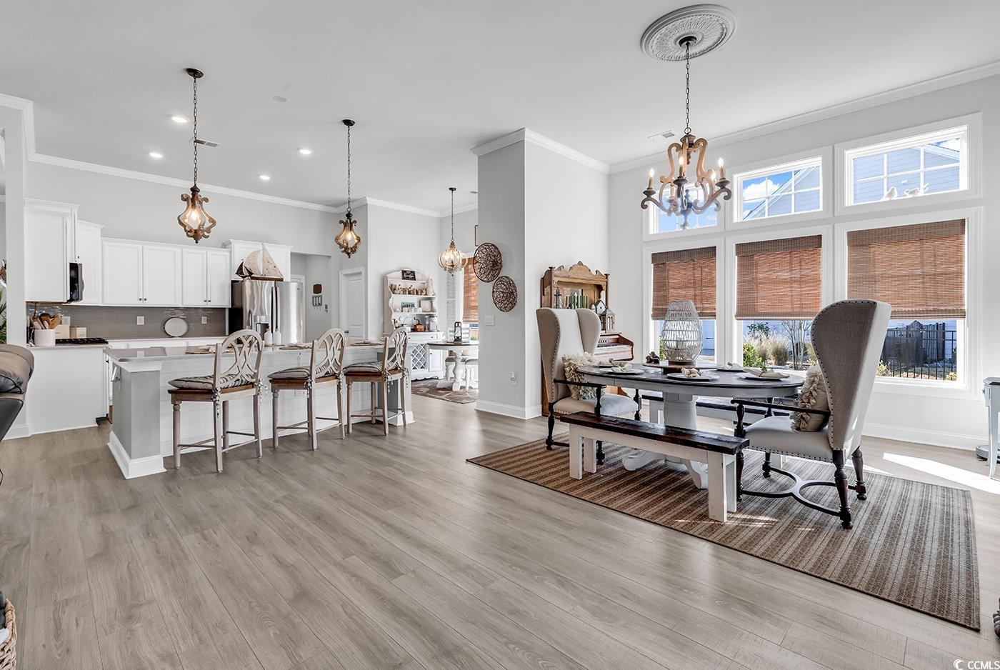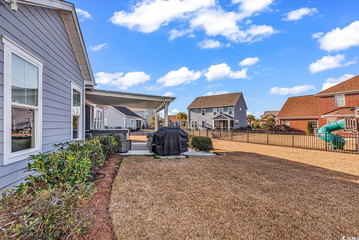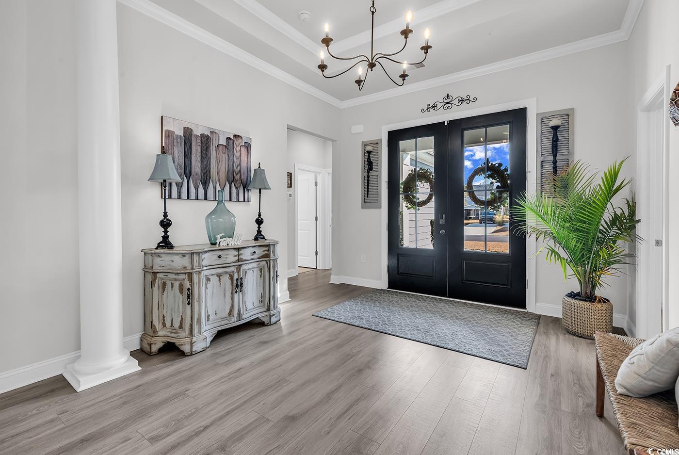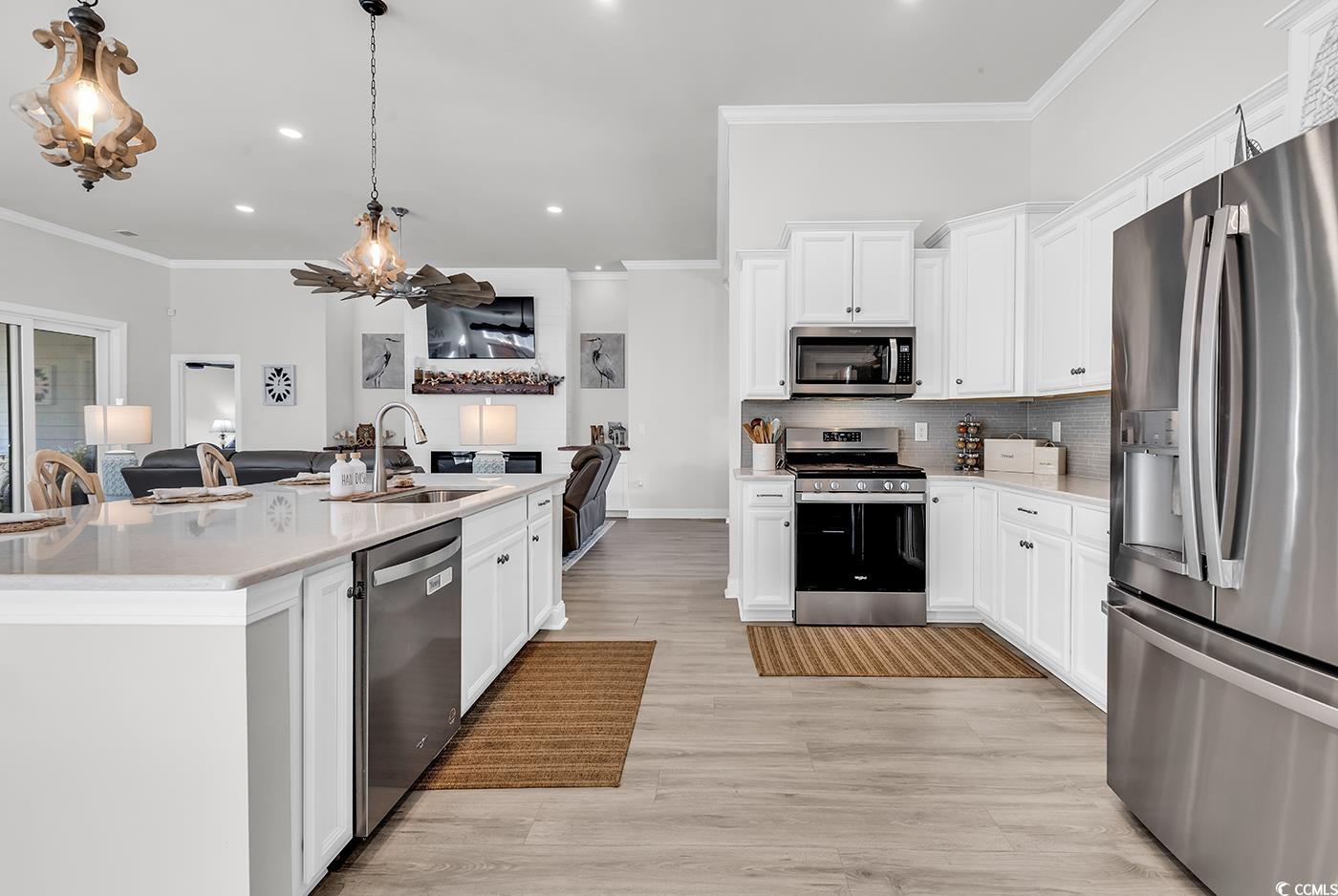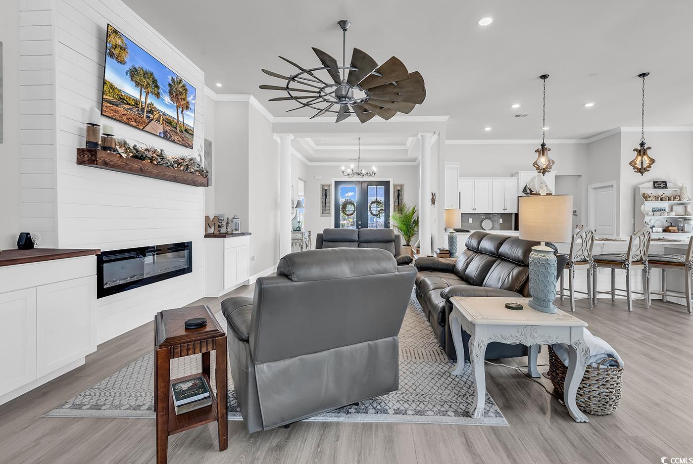 Welcome to Brighton Lakes, a gated natural gas community in the heart of Carolina Forest. This single-level Smart Home offers an open, modern layout with upscale finishes throughout, perfect for families or those who work from home. Features include double glass entry doors, custom lighting, Luxury Vinyl Plank flooring, and a sleek fireplace with interchangeable lighting and shiplap surround. The chef-inspired kitchen boasts quartz countertops, tiled backsplash, and an oversized island. A bright flex space provides ideal home office or bonus room options. The split floor plan places the primary suite privately at the rear, featuring tray ceilings, a spacious walk-in closet, and an oversized tiled shower. Enjoy outdoor living on the screened porch leading to a covered patio and grilling area. Side-load garage with extended driveway offers excellent curb appeal and ample parking. Community amenities include a large center, pool, and kids park. Convenient to shopping, dining, hospitals, and miles of walking paths.
