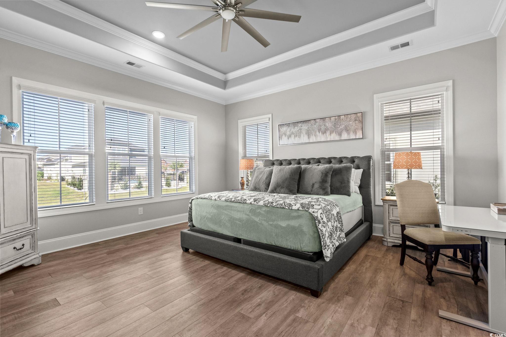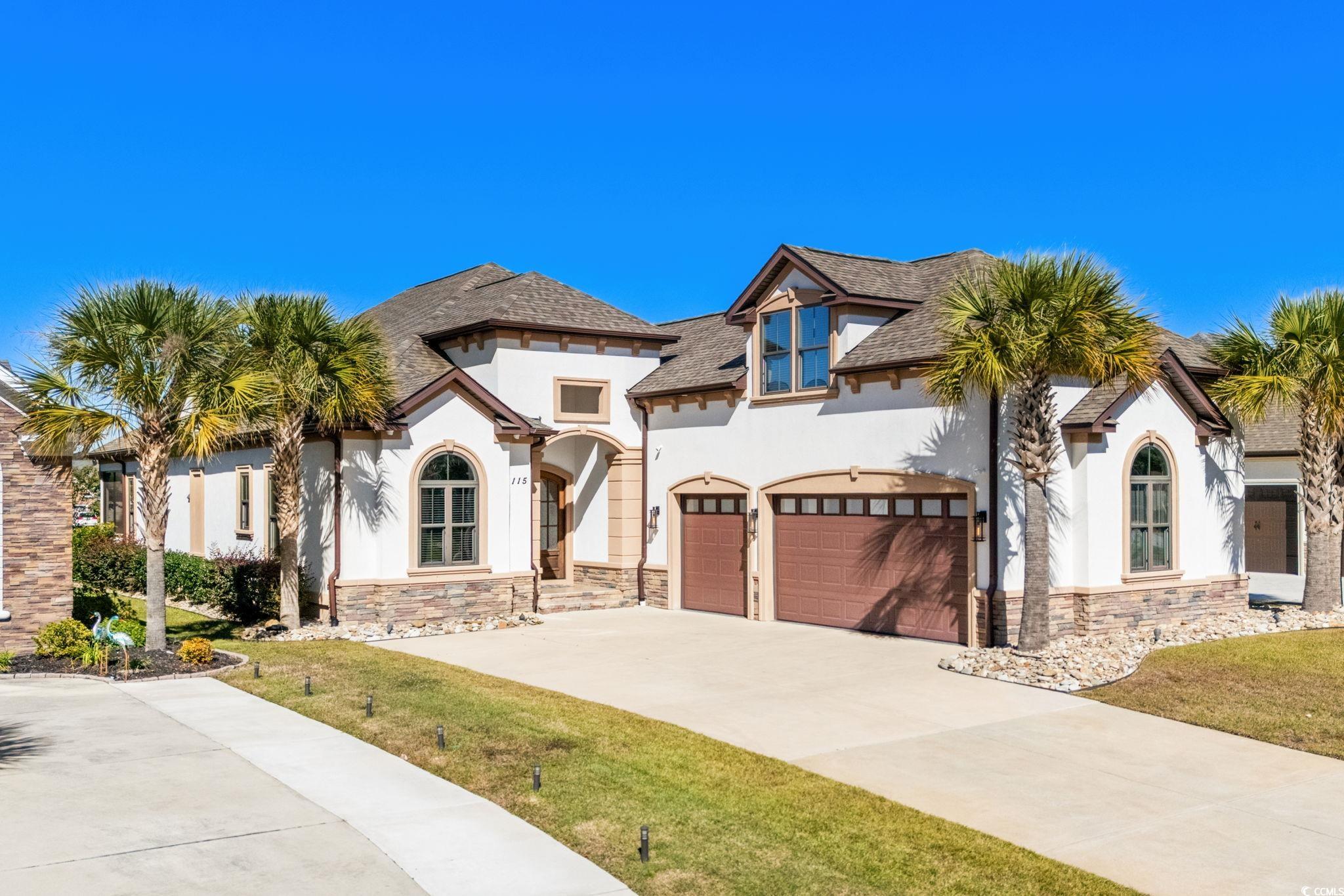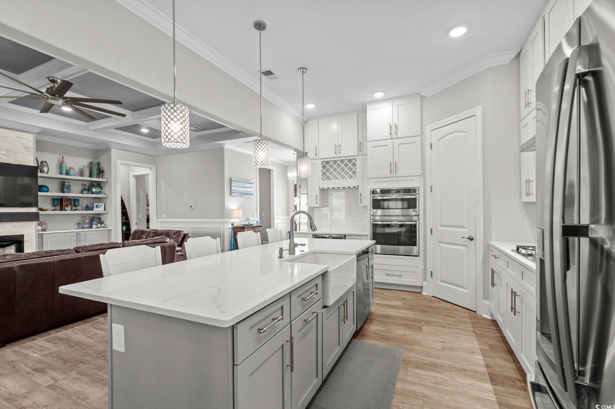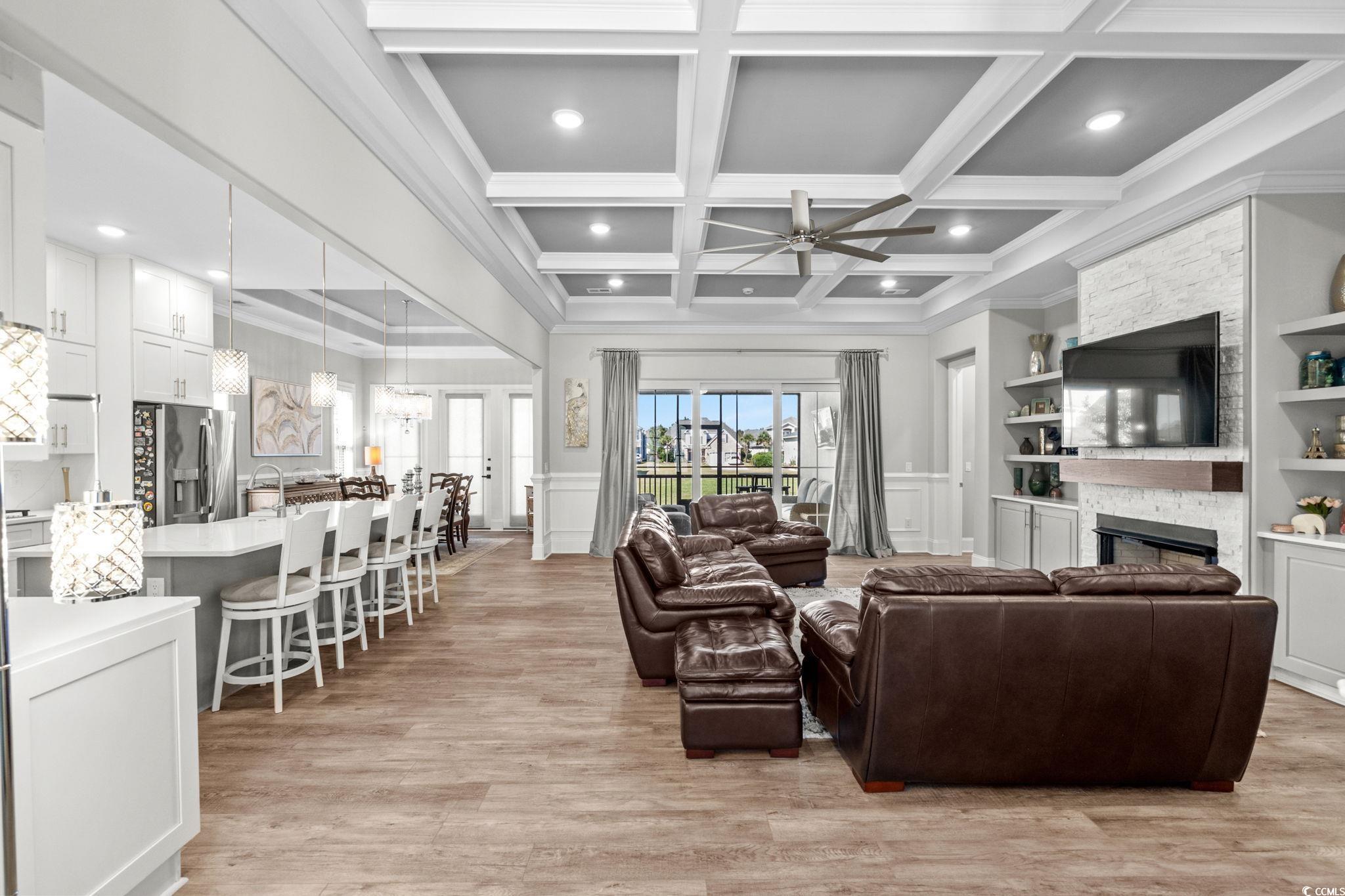 This stunning 4-bedroom, 4.5-bath Contemporary Craftsman home perfectly blends elegance, comfort, and modern design. This home offers an effortless flow and thoughtful layout for everyday living and entertaining. Inside, you'll find beautiful crown moldings, tray ceilings, bullnose corners, and luxury flooring throughout. The inviting living area features a cozy fireplace and abundant natural light from custom windows designed to capture serene pond and fountain views. The gourmet kitchen is a true showpiece featuring distinctive quartz countertops that extend seamlessly as a backsplash for a clean, modern look. Stainless-steel appliances include a gas cooktop, built-in wall oven and microwave. A large center island with breakfast bar, extended dining area, and solid wood cabinetry running to the ceiling complete this elegant culinary space. The spacious primary suite includes dual closets plus a separate shoe closet. The spa-like bath offers a stand-alone tub, an oversized shower with a built-in bench, and sophisticated finishes. Upstairs, a large bonus room with a full bath can serve as a second master suite, guest space, or media room. Outdoor living shines here with a covered porch featuring a ceiling fan, a summer kitchen, and relaxing pond views. Additional highlights include seamless gutters, raised slab foundation, and energy-efficient certification. Located in the gated community of Carolina Waterway Plantation, residents enjoy access to a furnished clubhouse with kitchen and banquet room, outdoor grill area, pool, playground, gazebo, tennis courts, walking trails, boat ramp, and RV/boat storage. Experience modern craftsmanship and luxury coastal living. Schedule your private tour today!