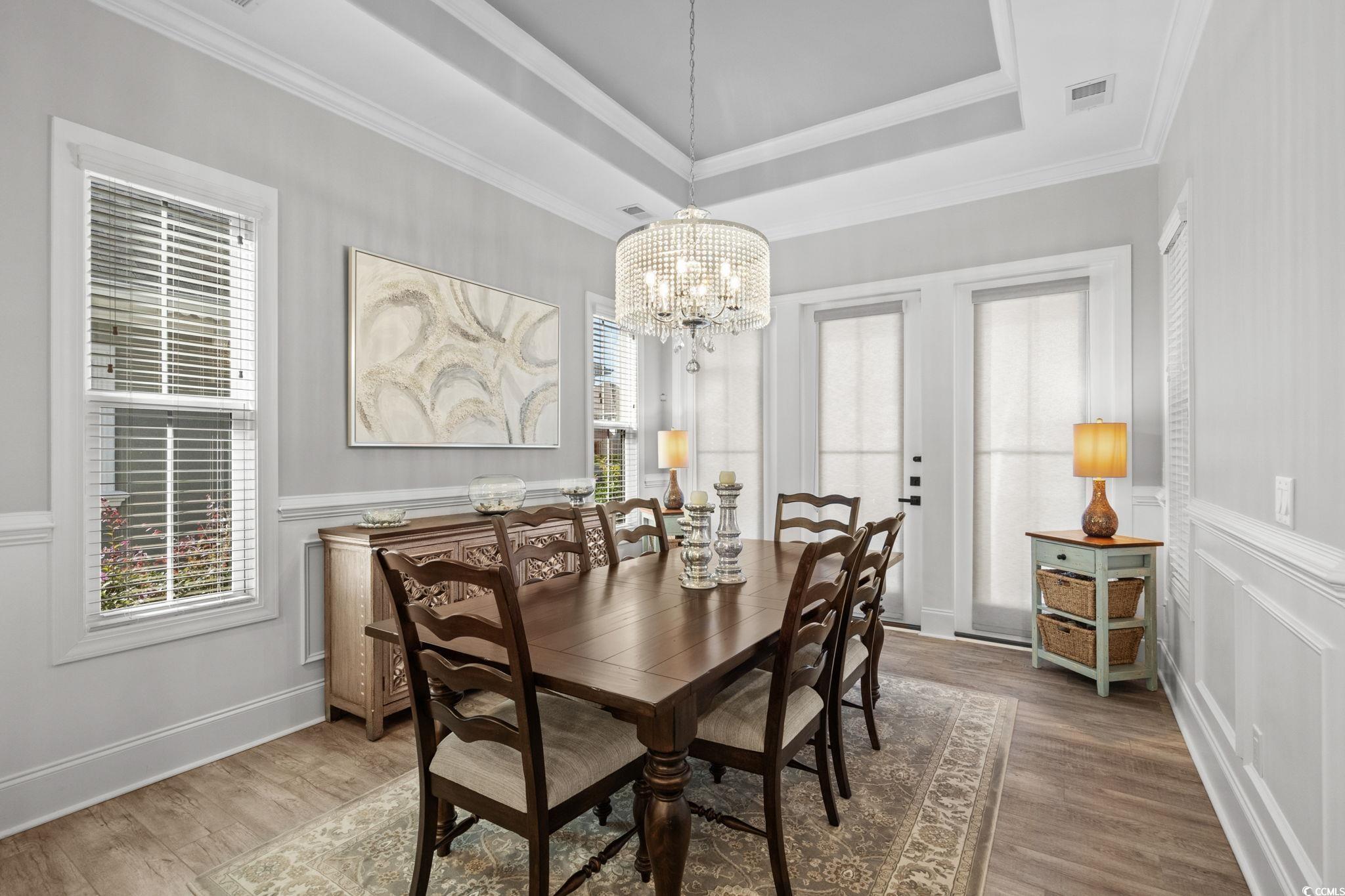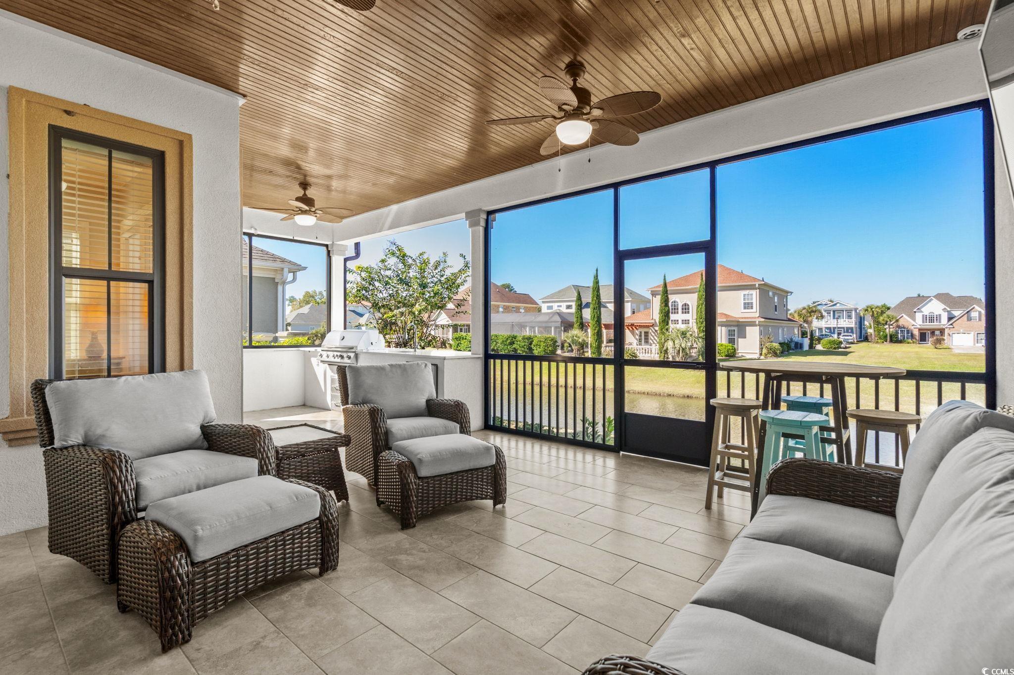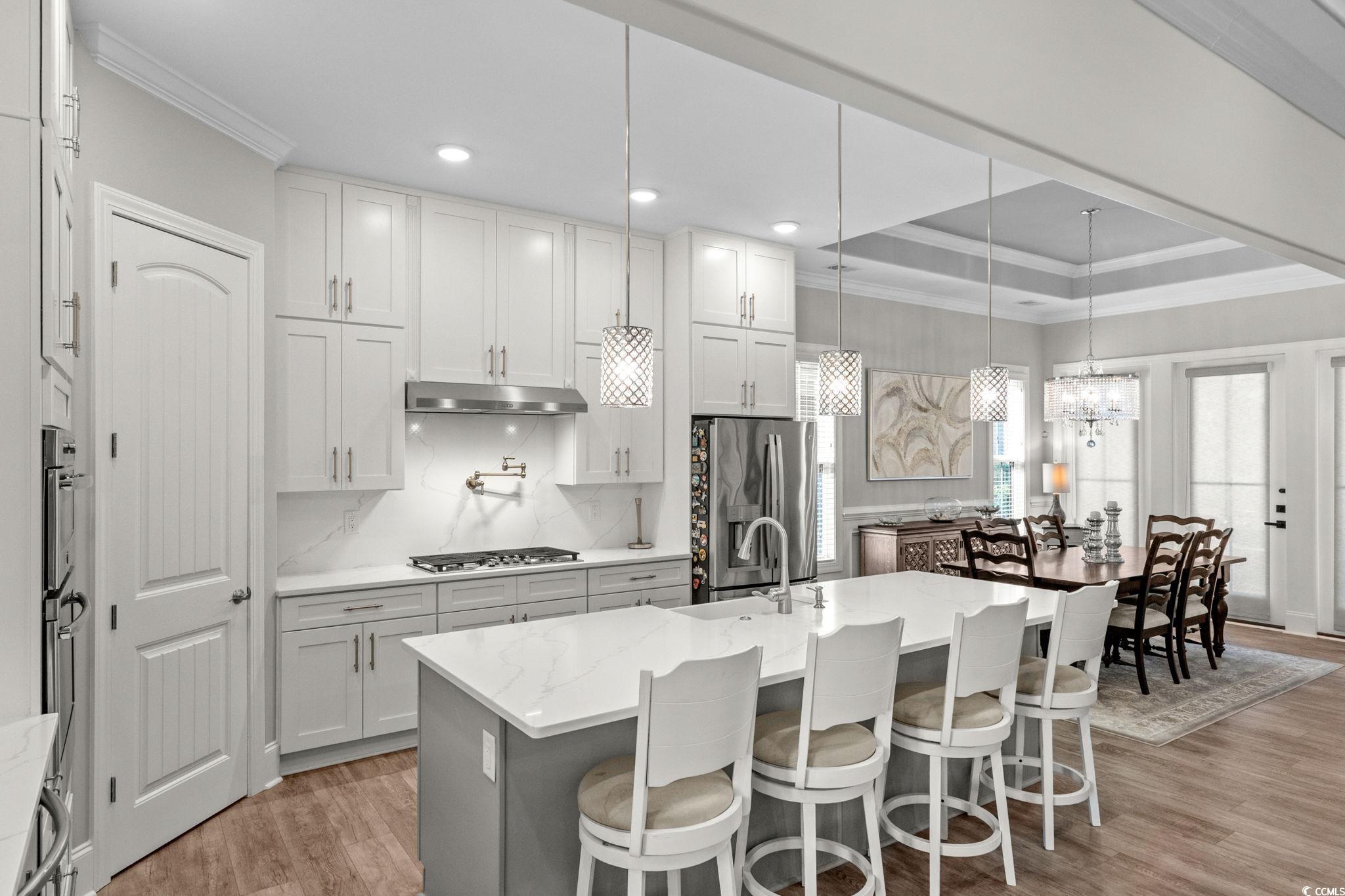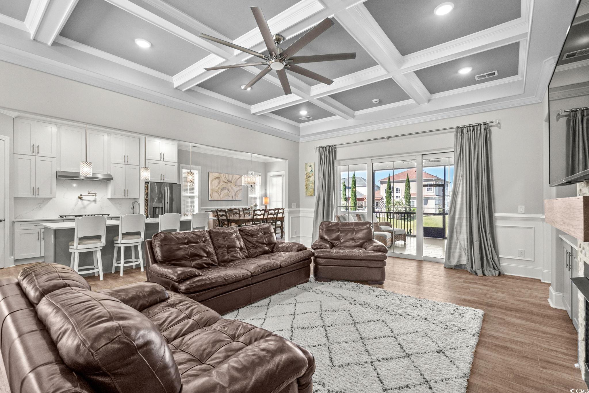 This stunning 4-bedroom, 4.5-bath Contemporary Craftsman home perfectly blends elegance, comfort, and modern design. This home offers an effortless flow and thoughtful layout for everyday living and entertaining. Inside, you'll find beautiful crown moldings, tray ceilings, bullnose corners, and luxury flooring throughout. The inviting living area features a cozy fireplace and abundant natural light from custom windows designed to capture serene pond and fountain views. The gourmet kitchen is a true showpiece featuring distinctive quartz countertops that extend seamlessly as a backsplash for a clean, modern look. Stainless-steel appliances include a gas cooktop, built-in wall oven and microwave. A large center island with breakfast bar, extended dining area, and solid wood cabinetry running to the ceiling complete this elegant culinary space. The spacious primary suite includes dual closets plus a separate shoe closet. The spa-like bath offers a stand-alone tub, an oversized shower with a built-in bench, and sophisticated finishes. Upstairs, a large bonus room with a full bath can serve as a second master suite, guest space, or media room. Outdoor living shines here with a covered porch featuring a ceiling fan, a summer kitchen, and relaxing pond views. Additional highlights include seamless gutters, raised slab foundation, and energy-efficient certification. Located in the gated community of Carolina Waterway Plantation, residents enjoy access to a furnished clubhouse with kitchen and banquet room, outdoor grill area, pool, playground, gazebo, tennis courts, walking trails, boat ramp, and RV/boat storage. Experience modern craftsmanship and luxury coastal living. Schedule your private tour today!