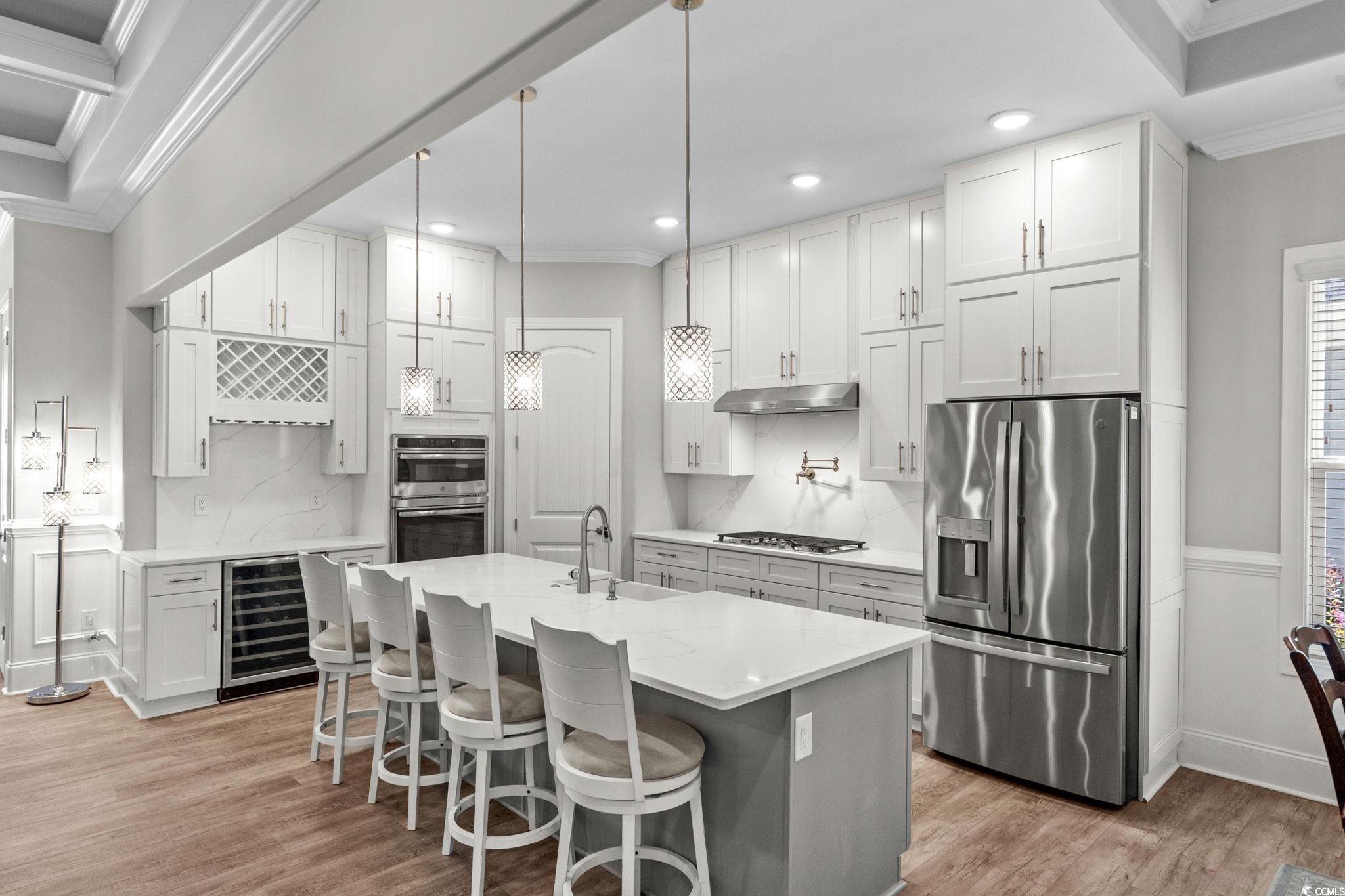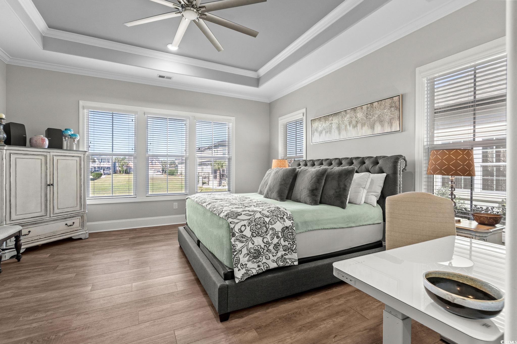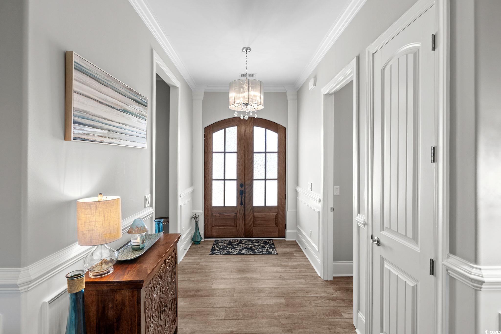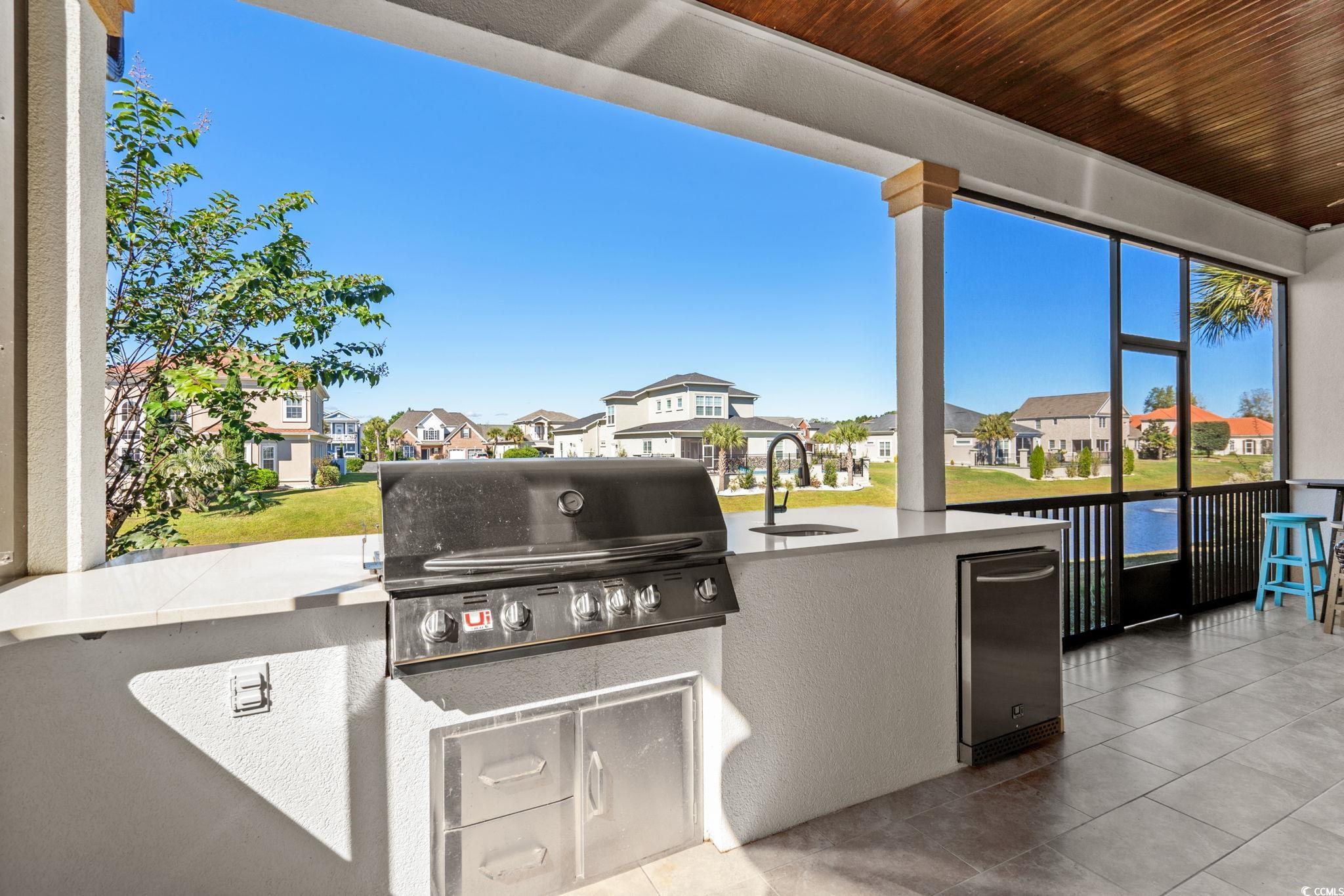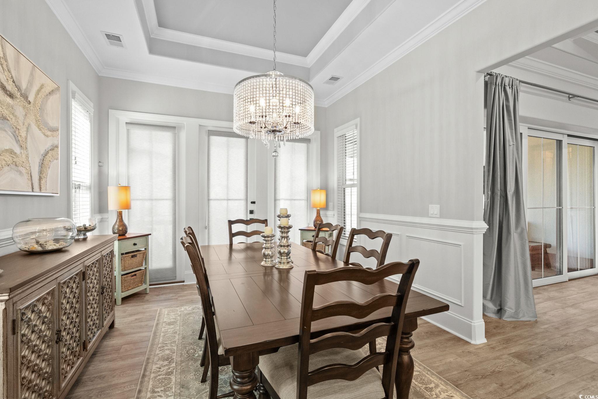 This stunning 4-bedroom, 4.5-bath Contemporary Craftsman home perfectly blends elegance, comfort, and modern design. This home offers an effortless flow and thoughtful layout for everyday living and entertaining. Inside, you'll find beautiful crown moldings, tray ceilings, bullnose corners, and luxury flooring throughout. The inviting living area features a cozy fireplace and abundant natural light from custom windows designed to capture serene pond and fountain views. The gourmet kitchen is a true showpiece featuring distinctive quartz countertops that extend seamlessly as a backsplash for a clean, modern look. Stainless-steel appliances include a gas cooktop, built-in wall oven and microwave. A large center island with breakfast bar, extended dining area, and solid wood cabinetry running to the ceiling complete this elegant culinary space. The spacious primary suite includes dual closets plus a separate shoe closet. The spa-like bath offers a stand-alone tub, an oversized shower with a built-in bench, and sophisticated finishes. Upstairs, a large bonus room with a full bath can serve as a second master suite, guest space, or media room. Outdoor living shines here with a covered porch featuring a ceiling fan, a summer kitchen, and relaxing pond views. Additional highlights include seamless gutters, raised slab foundation, and energy-efficient certification. Located in the gated community of Carolina Waterway Plantation, residents enjoy access to a furnished clubhouse with kitchen and banquet room, outdoor grill area, pool, playground, gazebo, tennis courts, walking trails, boat ramp, and RV/boat storage. Experience modern craftsmanship and luxury coastal living. Schedule your private tour today!