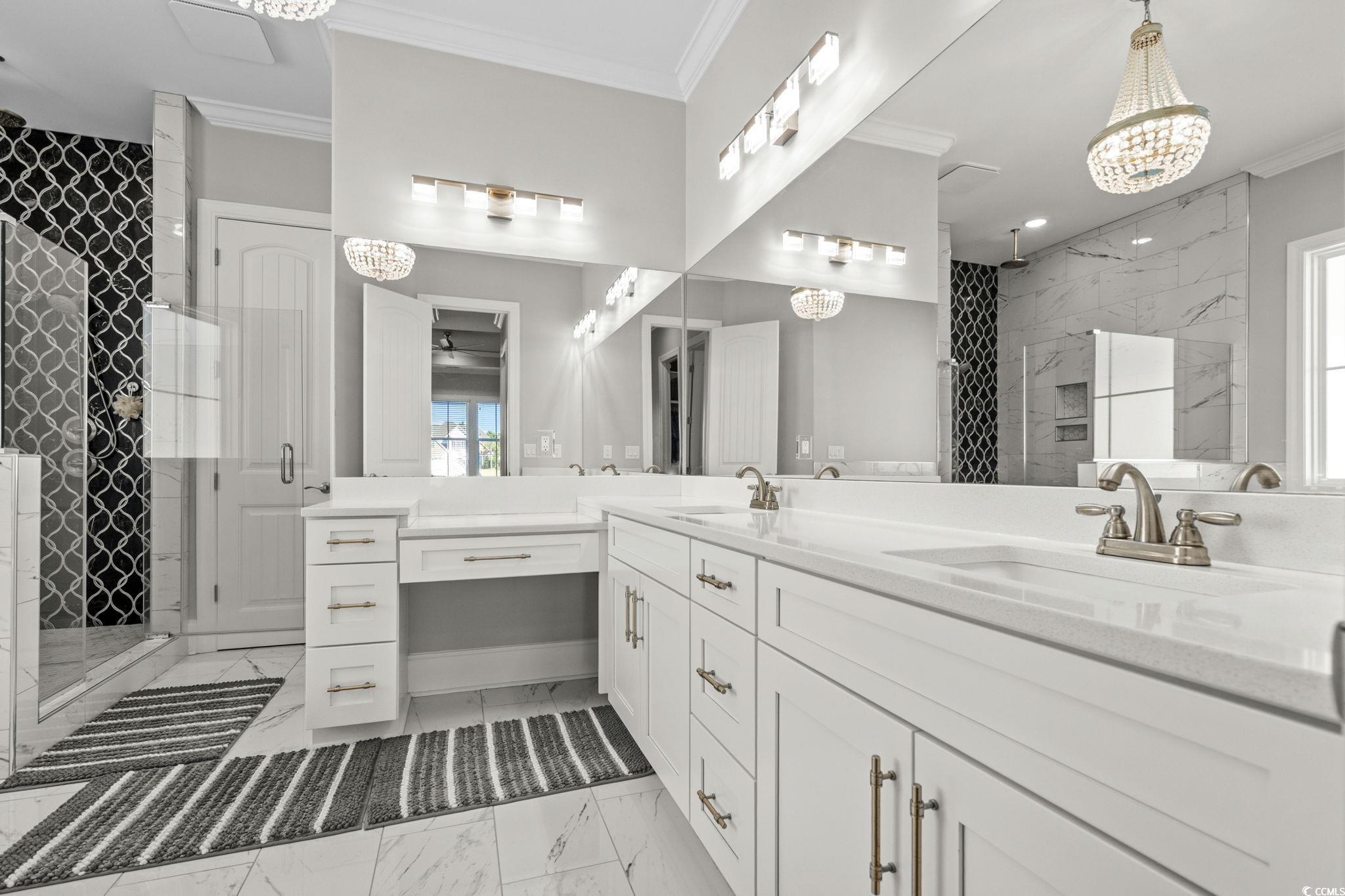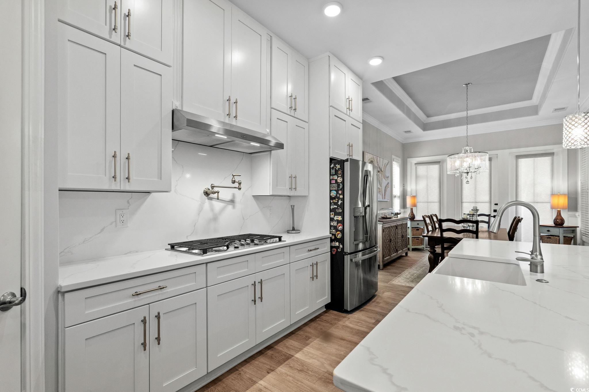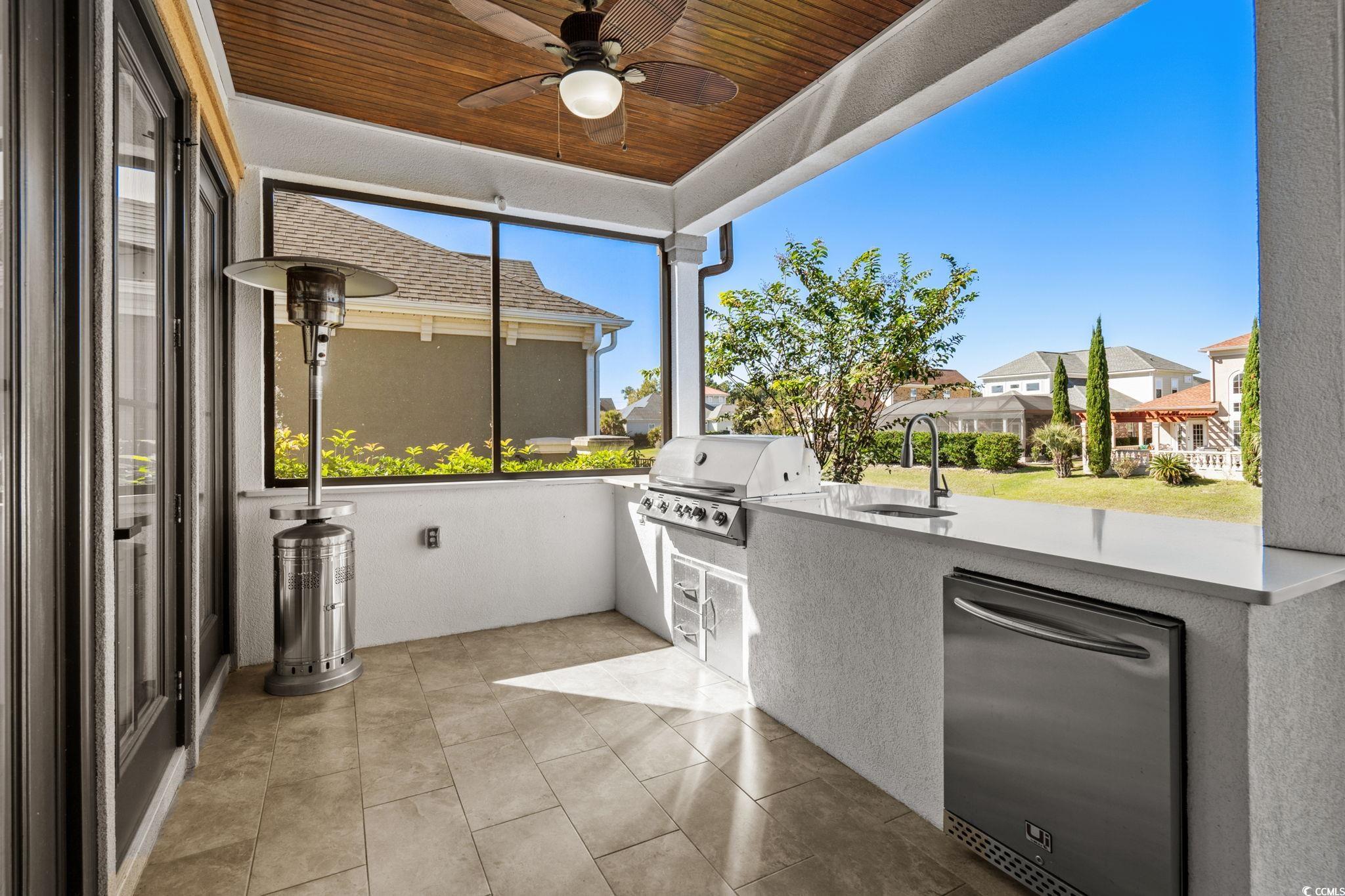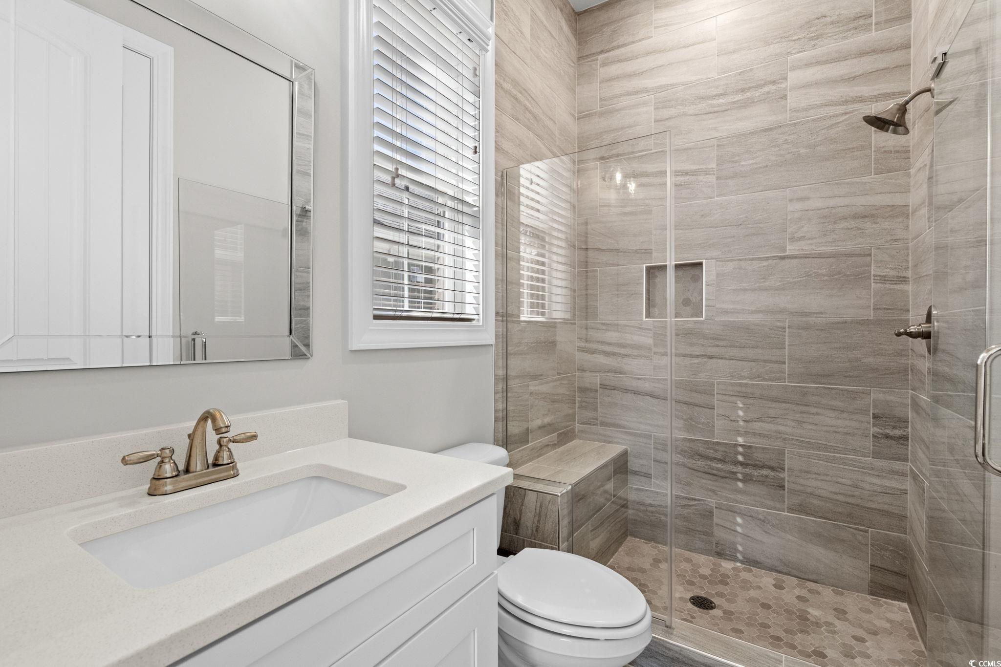 This stunning 4-bedroom, 4.5-bath Contemporary Craftsman home perfectly blends elegance, comfort, and modern design. This home offers an effortless flow and thoughtful layout for everyday living and entertaining. Inside, you'll find beautiful crown moldings, tray ceilings, bullnose corners, and luxury flooring throughout. The inviting living area features a cozy fireplace and abundant natural light from custom windows designed to capture serene pond and fountain views. The gourmet kitchen is a true showpiece featuring distinctive quartz countertops that extend seamlessly as a backsplash for a clean, modern look. Stainless-steel appliances include a gas cooktop, built-in wall oven and microwave. A large center island with breakfast bar, extended dining area, and solid wood cabinetry running to the ceiling complete this elegant culinary space. The spacious primary suite includes dual closets plus a separate shoe closet. The spa-like bath offers a stand-alone tub, an oversized shower with a built-in bench, and sophisticated finishes. Upstairs, a large bonus room with a full bath can serve as a second master suite, guest space, or media room. Outdoor living shines here with a covered porch featuring a ceiling fan, a summer kitchen, and relaxing pond views. Additional highlights include seamless gutters, raised slab foundation, and energy-efficient certification. Located in the gated community of Carolina Waterway Plantation, residents enjoy access to a furnished clubhouse with kitchen and banquet room, outdoor grill area, pool, playground, gazebo, tennis courts, walking trails, boat ramp, and RV/boat storage. Experience modern craftsmanship and luxury coastal living. Schedule your private tour today!