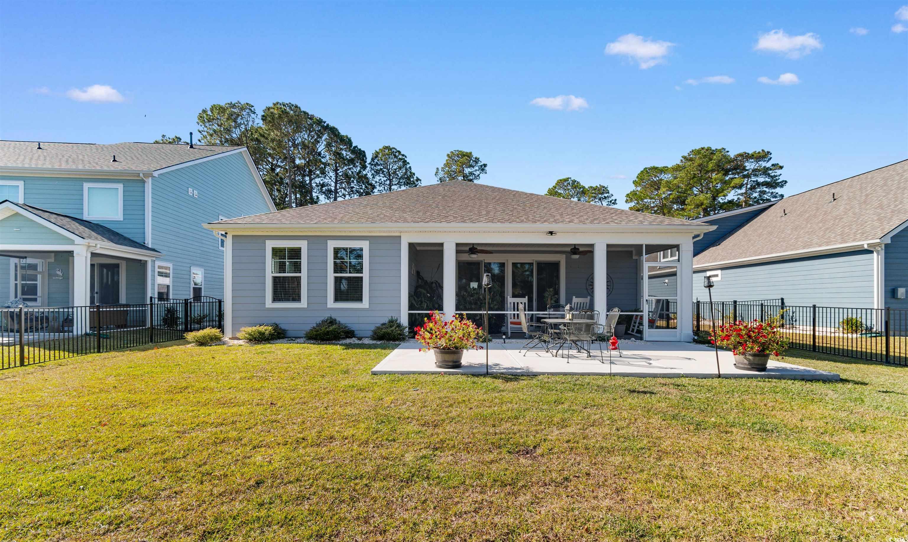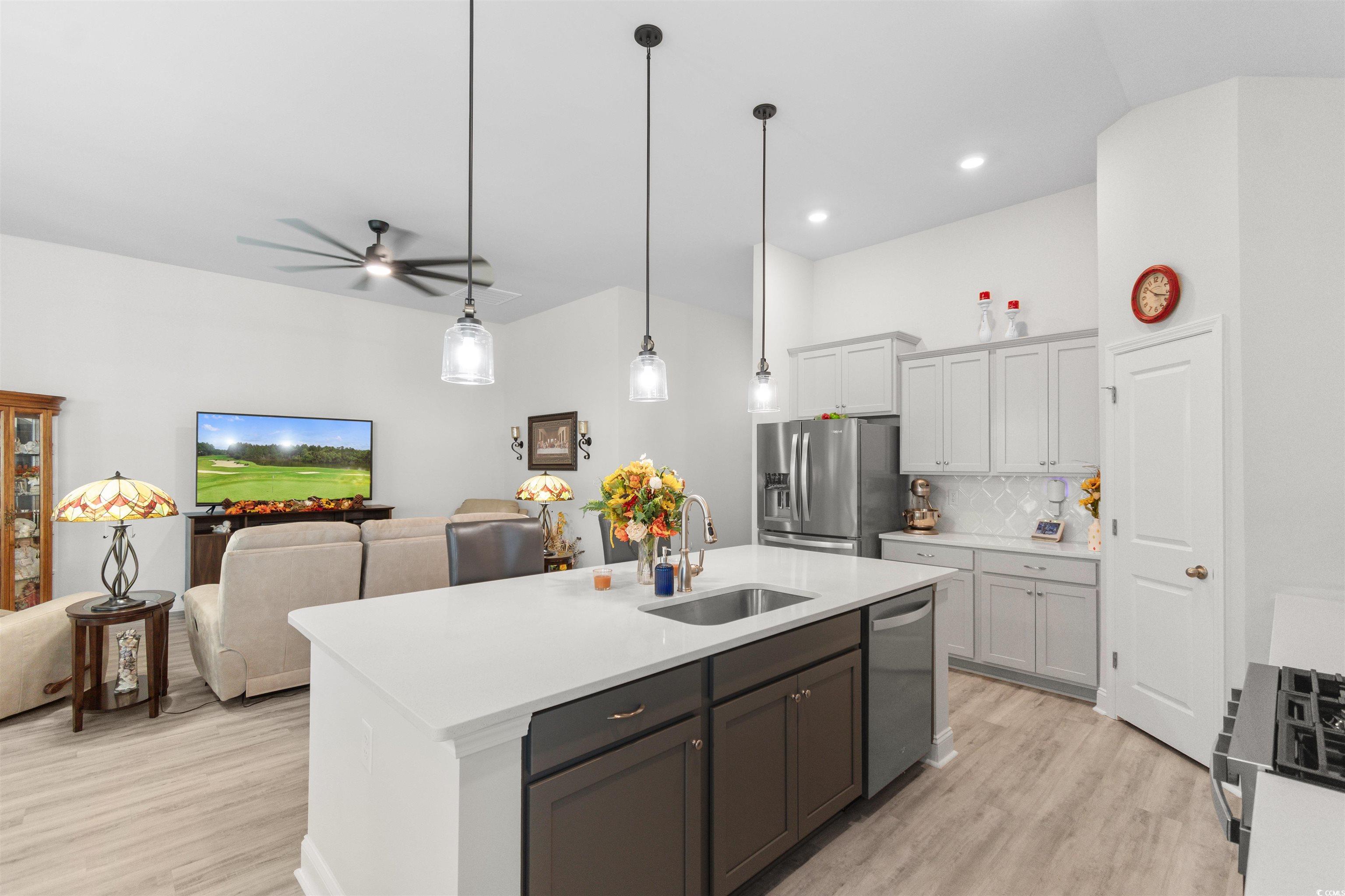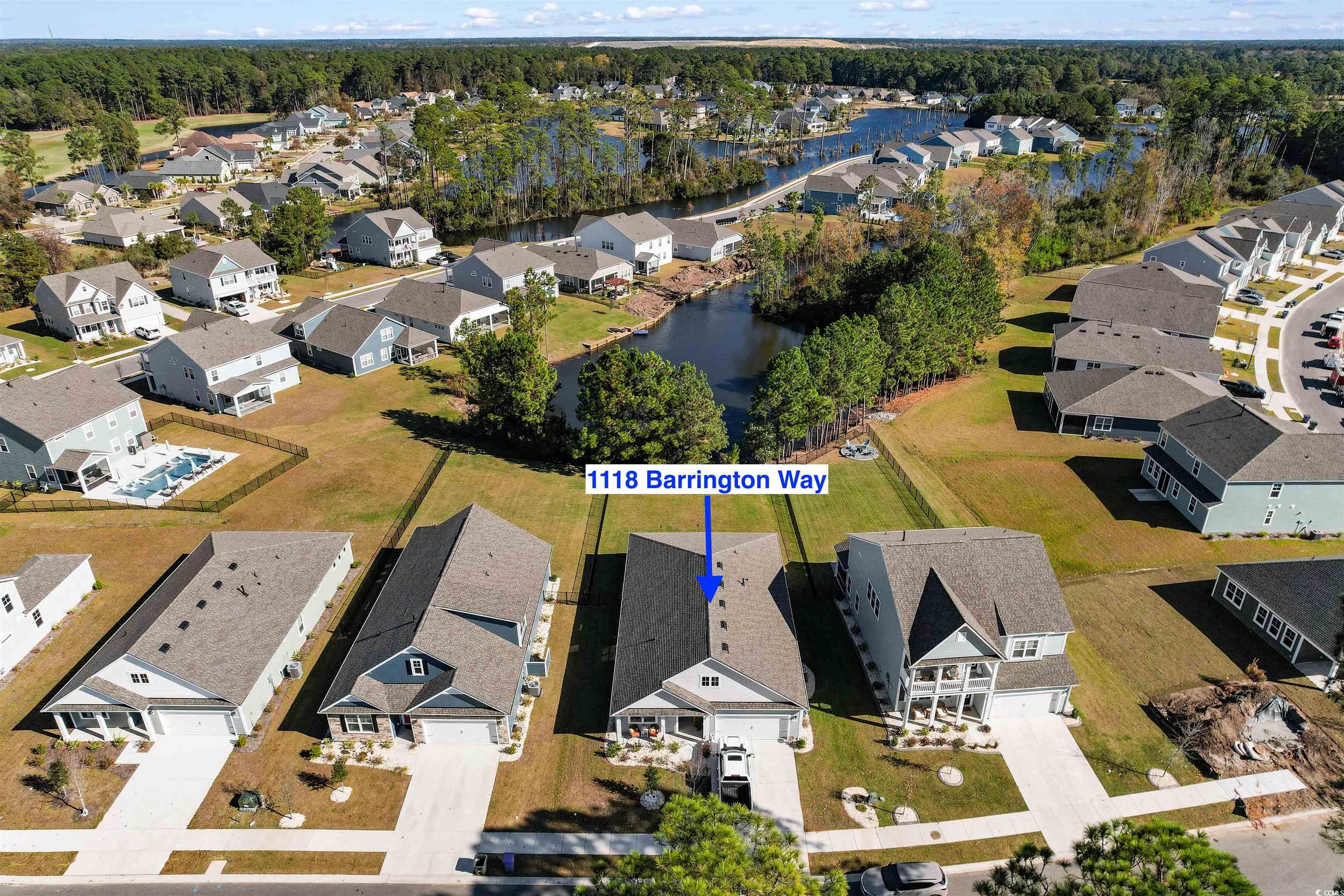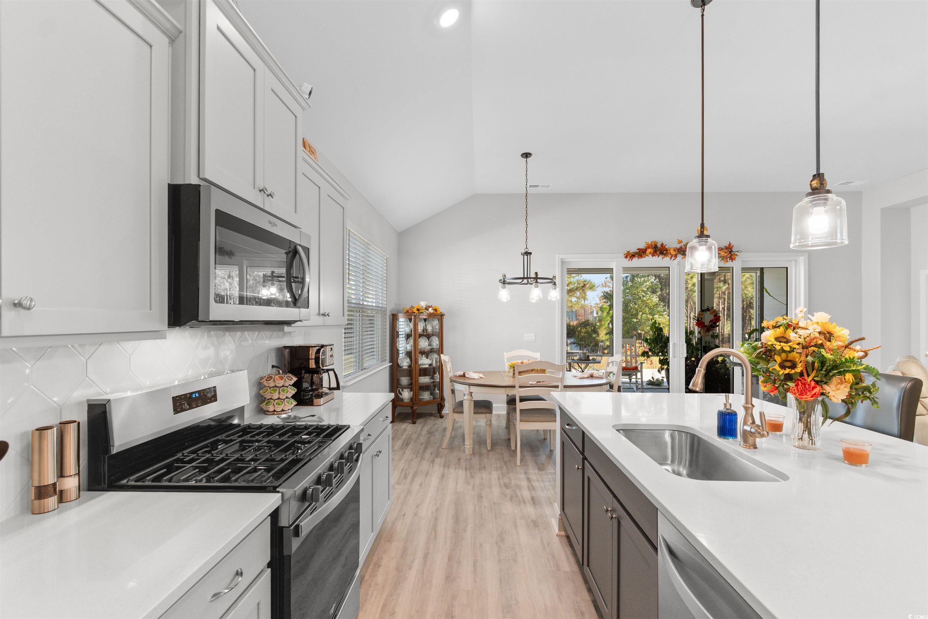 Experience modern, one-level living in this bright 4-bedroom, 2-bathroom home with a 2-car garage, built for comfort and everyday ease. High ceilings, updated lighting, and durable LVP flooring create a fresh, inviting atmosphere throughout. The heart of the home is the open living, dining, and kitchen area, seamlessly blending spaces for cooking, dining, and relaxing. The kitchen features classic cabinetry, quartz countertops, a large island, stainless steel appliances, gas range, an oversized single-bowl sink, lots of storage, and a walk-in pantry. Upgraded finishes give the space a polished, timeless look that enhances both everyday routines and entertaining. Three bedrooms extend from the main living area, each with modern ceiling fans and flexible layouts for guests, work, or hobbies. The primary bedroom is privately positioned and offers a peaceful retreat with a tray ceiling, sleek ceiling fan, and smooth LVT flooring. Its attached bathroom includes dual sinks, a walk-in shower, a vanity, and a generous walk-in closet for effortless organization. A dedicated laundry room and a convenient drop zone near the garage add practical functionality to the home’s layout. Step through a wide sliding door from the great room onto the screened porch and extra-large patio overlooking the tranquil pond. The fenced backyard feels private, with neighboring homes only on the sides and no homes directly behind, creating an open, serene setting. Beautiful landscaping surrounds the yard, providing a perfect backdrop for outdoor dining, morning coffee, or quiet evenings. Located just minutes from Conway Medical Center, Coastal Carolina University, Tanger Outlets, and a variety of grocery stores and restaurants, this home offers an ideal blend of comfort, convenience, and community living. Built in 2025 and better than new, this home combines thoughtful upgrades, a functional layout, and an exceptional outdoor setting! Imagine your life here and schedule your private showing today!