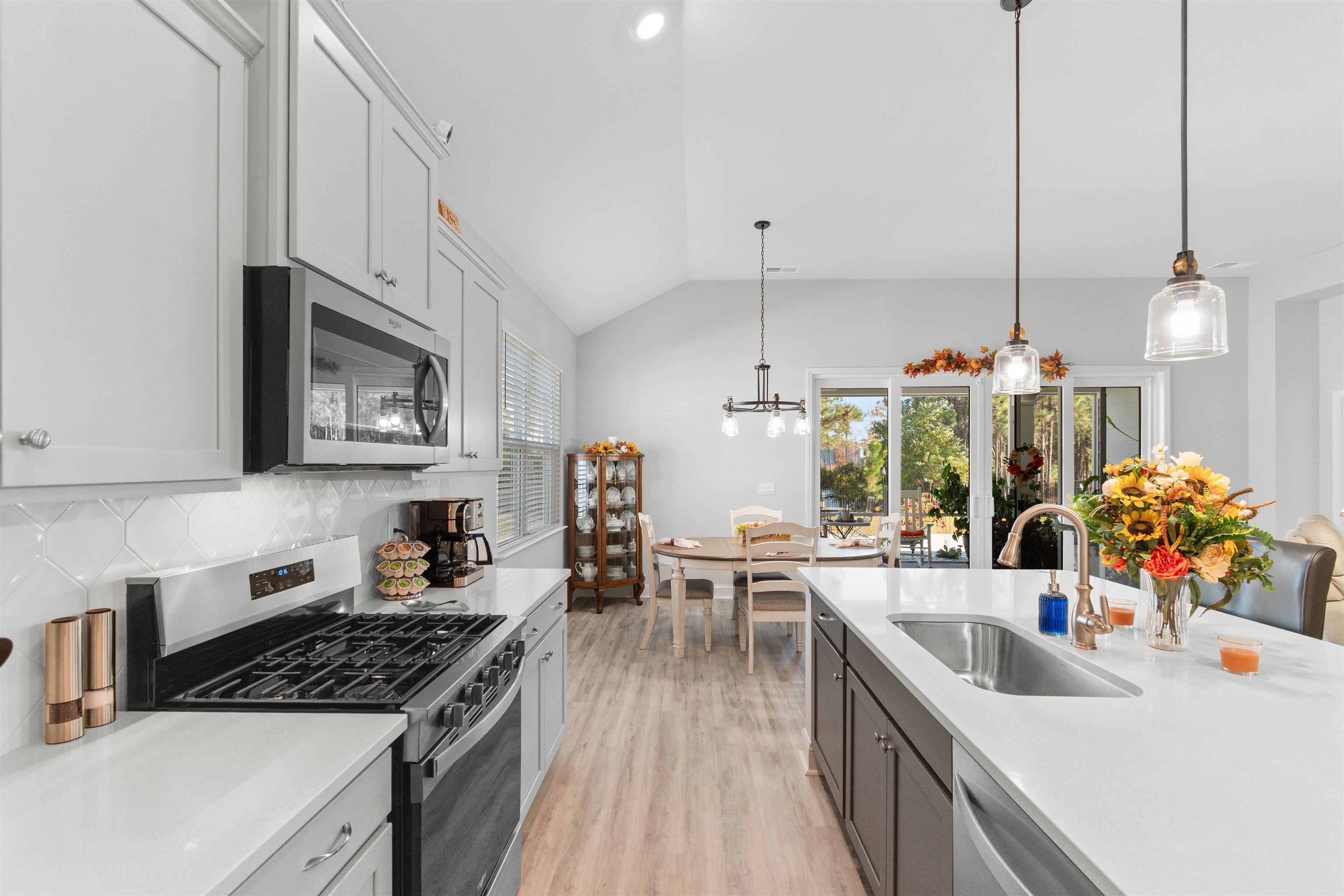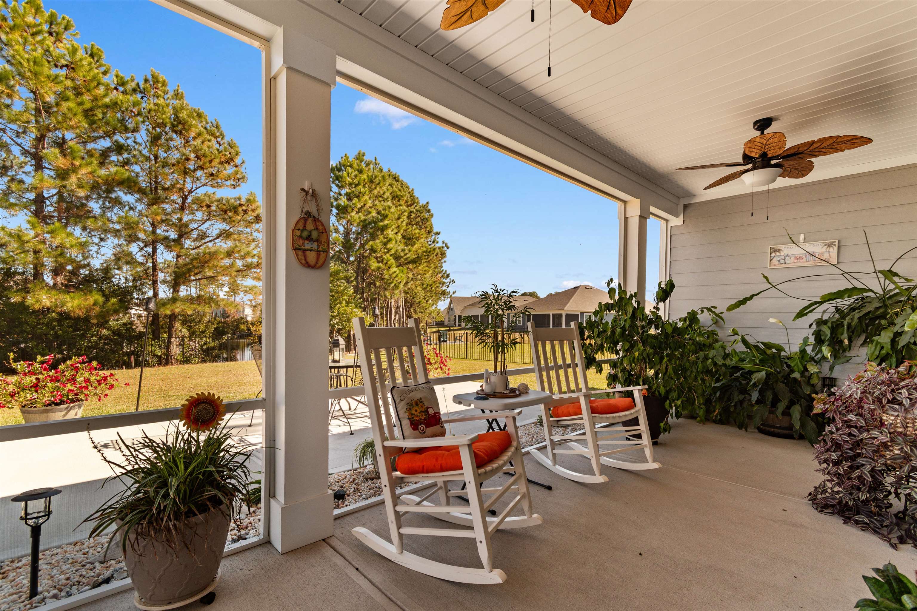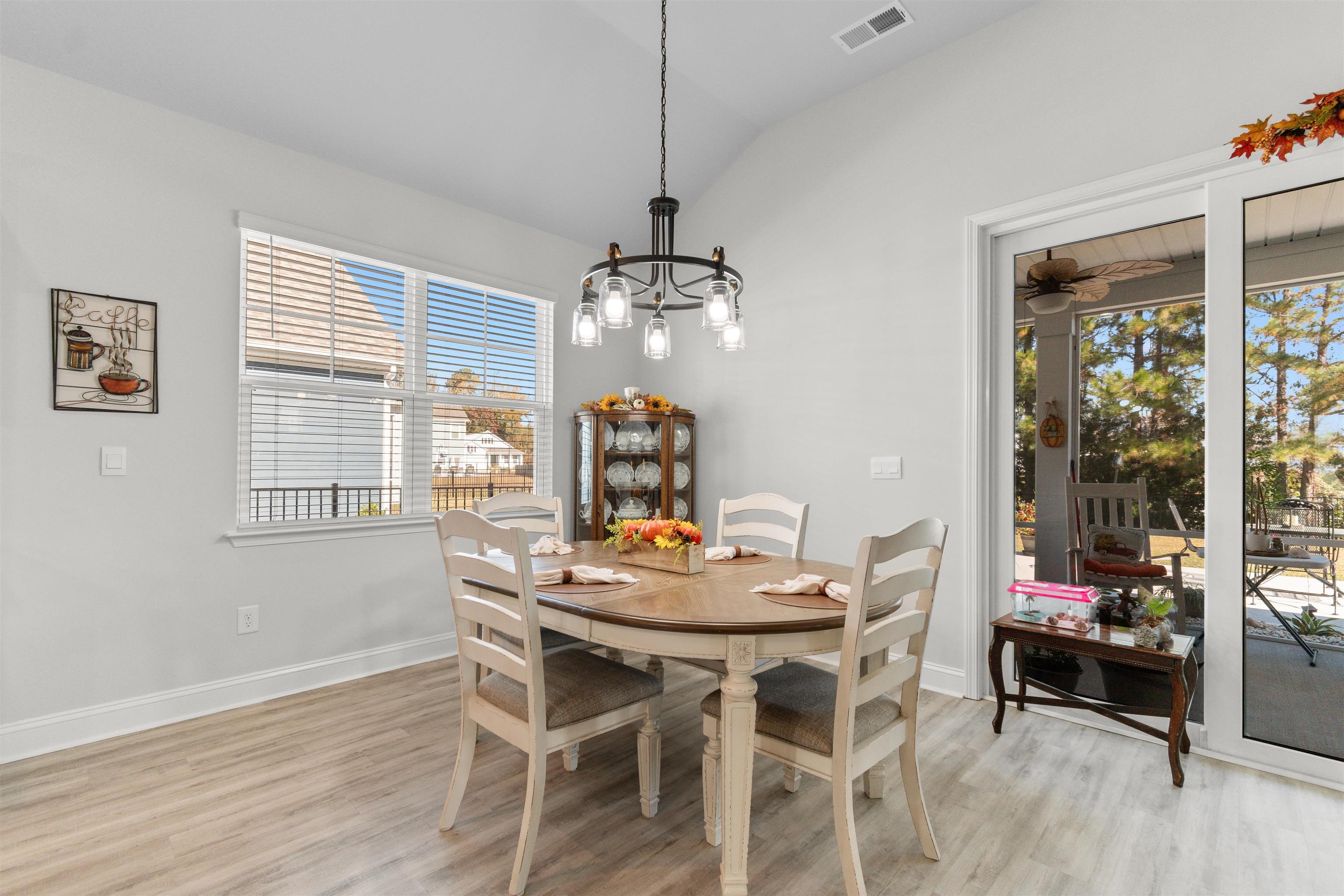 Experience modern one-level living in this bright 4-bedroom, 2-bath home with a 2-car garage, designed for comfort and everyday ease. High ceilings, updated lighting, and durable LVP flooring create a fresh, inviting feel throughout. The open living, dining, and kitchen area flows seamlessly, featuring quartz countertops, a large island, stainless steel appliances, gas range, walk-in pantry, and abundant storage. The privately positioned primary suite offers a tray ceiling, walk-in closet, and a well-appointed bath with dual sinks and walk-in shower. Three additional bedrooms provide flexible space for guests, work, or hobbies, while a dedicated laundry room and drop zone add everyday functionality. The true standout is the backyard. A wide sliding glass door fills the great room with natural light and frames tranquil pond views. Step onto the spacious screened porch and extended patio overlooking the water. With no homes directly behind and a fenced yard surrounded by beautiful landscaping, the setting feels open, peaceful, and private. Built in 2025 and better than new, this home blends thoughtful upgrades, a functional layout, and an exceptional outdoor retreat, all just minutes from Conway Medical Center, Coastal Carolina University, Tanger Outlets, dining, and shopping.