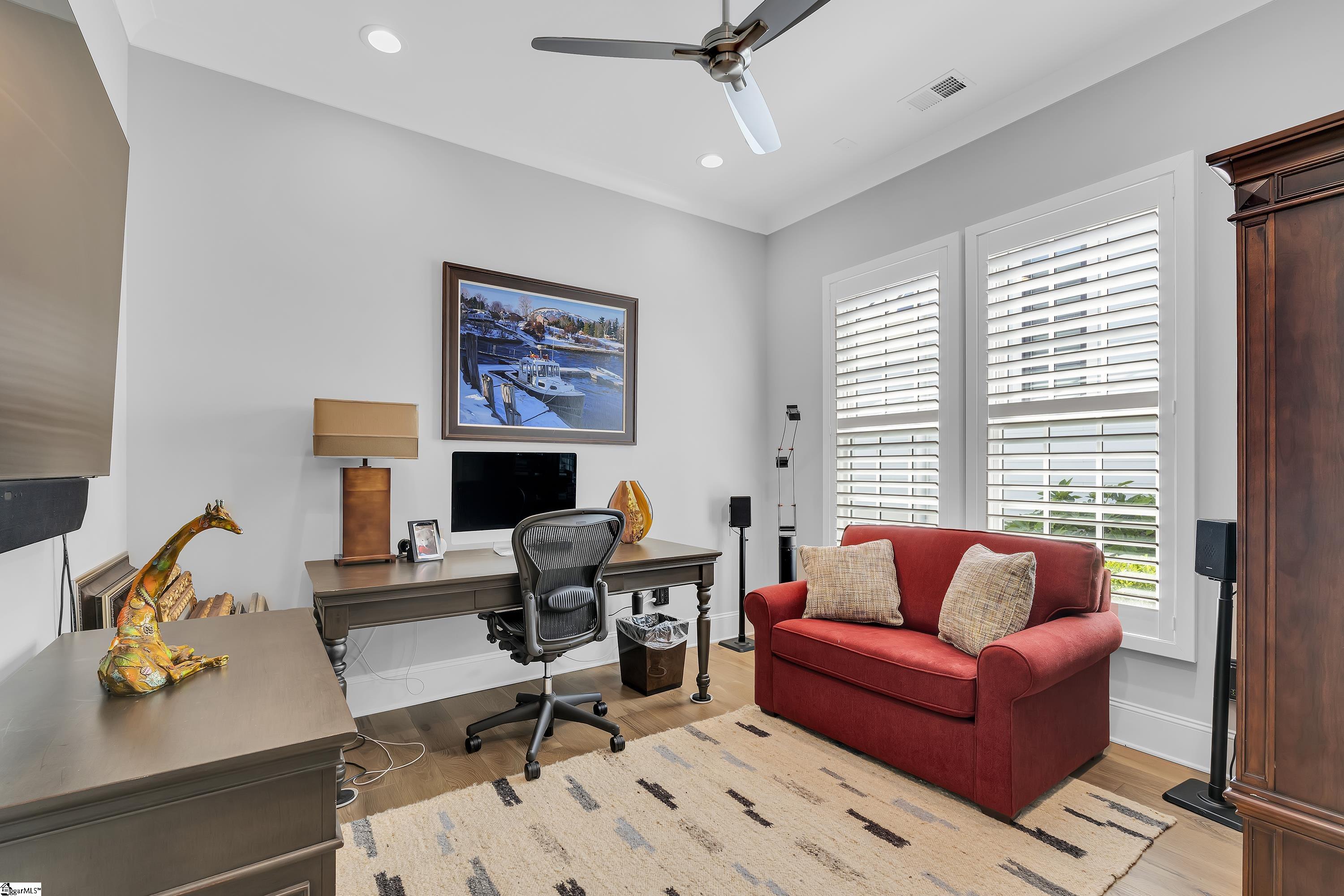 One level living at its finest! Located in the award winning master planned community of Hartness, 112 Burrough Street is convenient to shopping, restaurants, medical facilities, GSP Int. Airport and downtown Greenville, SC. This traditional home is the Bull River Cottage plan which offers a bright, open floor plan with 3 Bedrooms, 2 Baths, a relaxing front porch, an oversized 2 bay garage, a covered grilling patio and a fenced pet run/play area. -- Open and airy, this home was thoughtfully designed and created with luxurious finishes, hardwood flooring, custom cabinetry, 8' solid doors, thoughtfully placed windows and plantation shutters, and 10' ceilings which gather natural light and maximize its footprint. -- The central Kitchen is fully equipped with Thermador stainless steel appliances, ceramic tile back-splash, ample storage, quartz counters, and a large work island with sink, seating, and storage. -- The private Primary Suite includes a custom designed walk-in closet, a large En Suite with tiled floors, dual custom vanities, a walk-in multi-head shower with grab bars, and a water closet. -- Two additional bedrooms (currently used as offices) have large custom closets and plantation shutters. A centrally located full bathroom is near the additional bedrooms and the living areas. -- The laundry room with tiled floor, a sink, window and storage is convenient to the Primary Suite. -- The oversized 2-car garage is near the kitchen creating ease for daily life and grocery runs. Ample storage areas are found in the garage and attic. The recent addition of a full house generator creates comfort and peace of mind in the event of power outage. -- The vibrant urban village of Hartness has sidewalks throughout leading to homes, community amenities, restaurants and green spaces. Hartness village has nature trails, a community garden, ponds, a swimming pool, play ground, basketball court, a wellness center, restaurants, a hotel and spa and more.