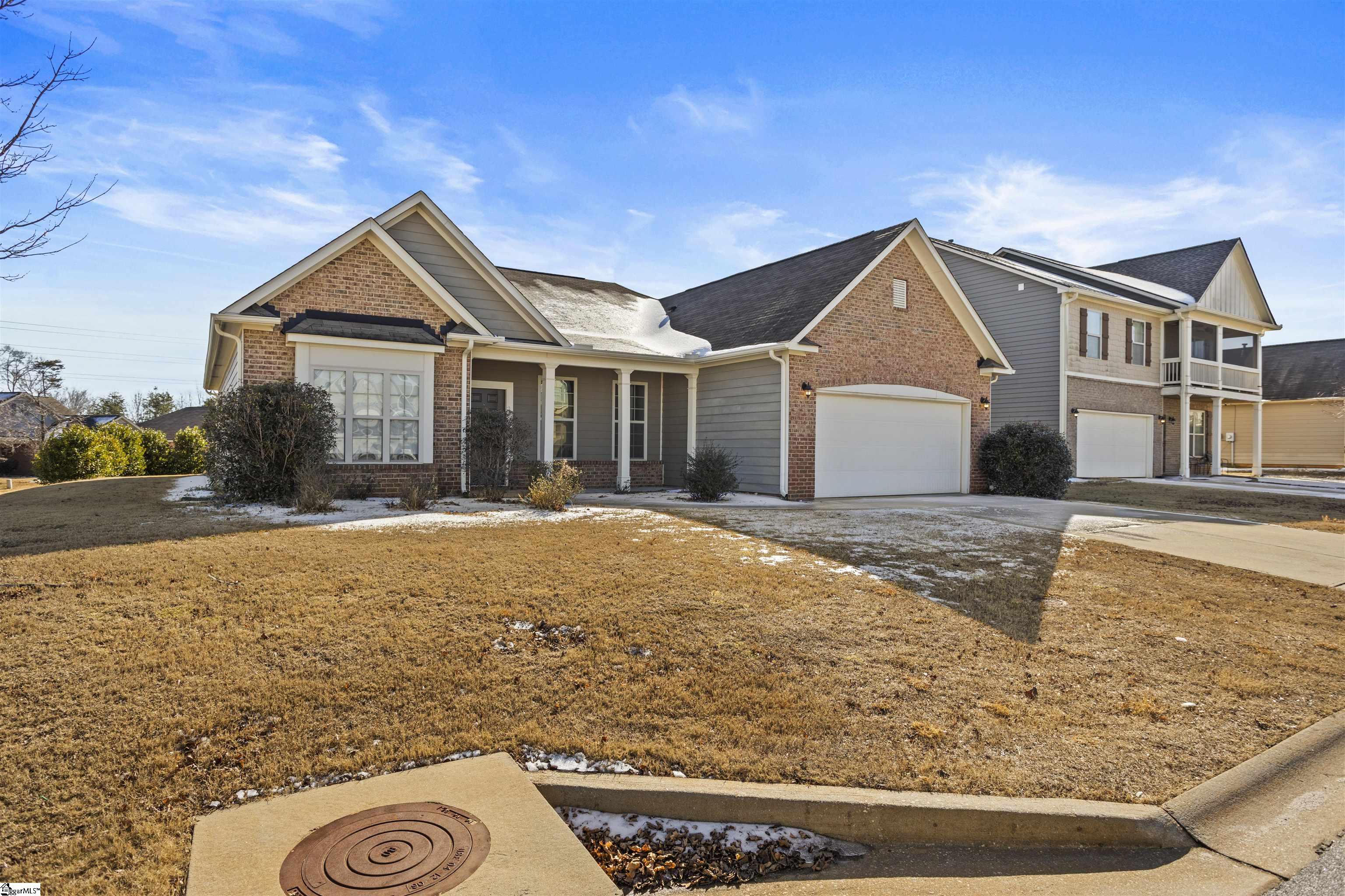 Well-maintained one-level home in Reedy Springs offering 3 bedrooms, 2 full baths, and just over 2,100 sq ft of finished living space on a level corner lot. Traditional brick-and-hardboard exterior with covered front porch, and patio for outdoor enjoyment. Inside, the floor plan features a spacious living room with gas log fireplace, vaulted ceilings, and abundant natural light. Kitchen offers granite countertops, ample cabinet space, and included appliances. Separate dining and sitting rooms offer additional living space for entertaining. Split bedroom layout provides privacy, with a primary suite on the main level featuring a walk-in closet, double sinks, separate shower, and garden tub. Additional highlights include walk-in laundry, attic storage, and a 2-car attached garage. Conveniently located to I-185, Mauldin, Simpsonville, and Greenville.
