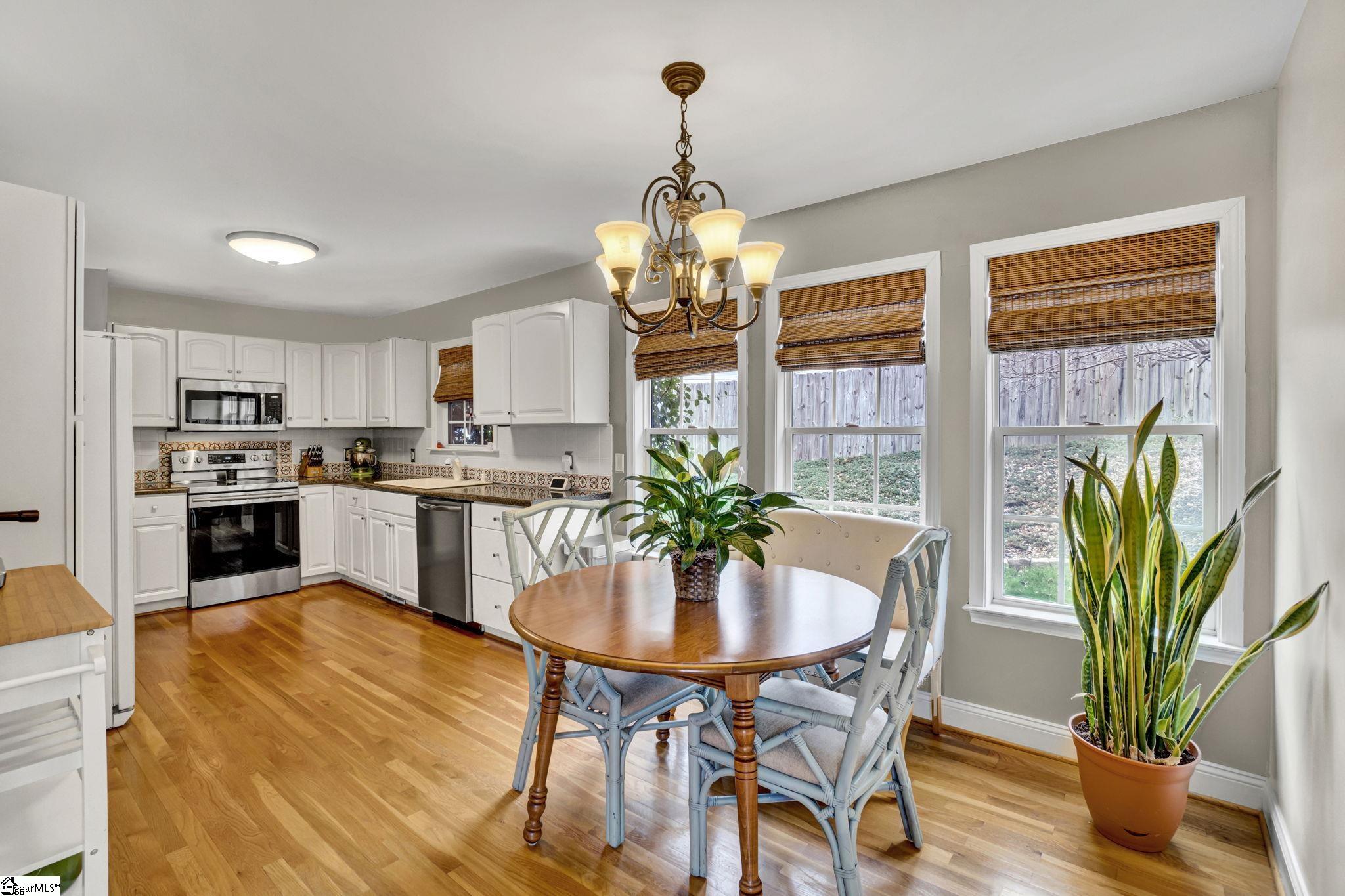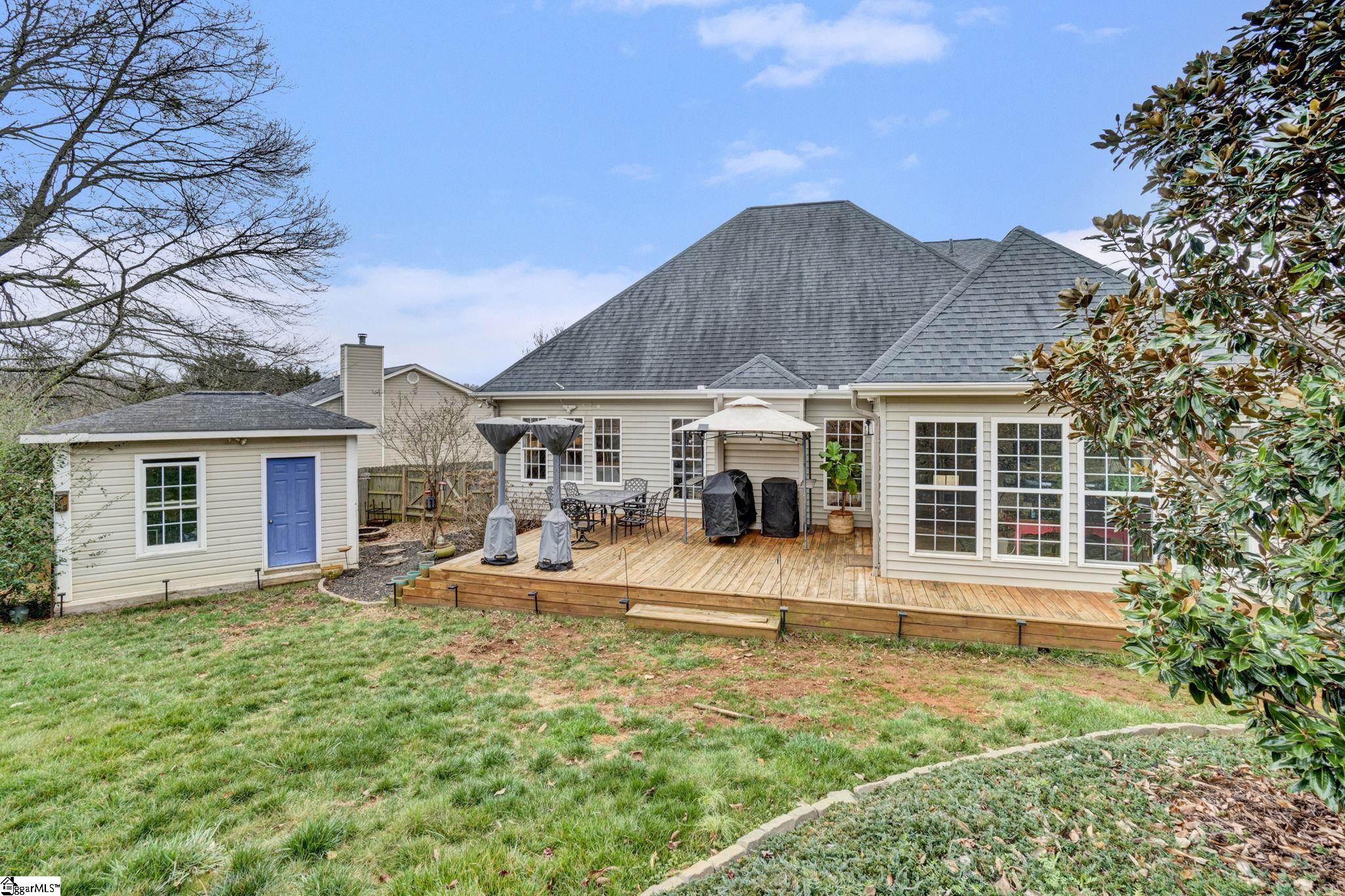 Enjoy the feel of mountain living in this beautiful home, ideally located with lovely mountain views and everyday convenience. Close to Cherrydale and only 10 minutes to downtown Greenville as well as Furman. Beautifully maintained 3-bedroom, 2.5-bath home tucked at the top of a cul-de-sac on a private half-acre lot with a fenced backyard. This inviting home features soaring two-story ceilings in the great room and foyer, a spacious dining room, and newly refinished oak hardwood floors throughout most of the main level. The main-level primary suite offers a spacious on suite bath with a stand-alone tub, separate shower, and an oversized walk-in closet. A large walk-in laundry room with storage adds everyday convenience. Wood stairs lead upstairs to two spacious bedrooms, a large full bath with double sinks, and access from the second bedroom to a versatile bonus area ideal for a playroom, office, or exercise space. Just off the kitchen and breakfast area, the large sunroom overlooks the backyard, where you’ll find an extra-large deck, charming outbuilding for storage or playhouse use, and beautiful mountain views. Conveniently located near Cherrydale shopping and dining and only 10 minutes from downtown Greenville and Furman. Did I mention no HOA?