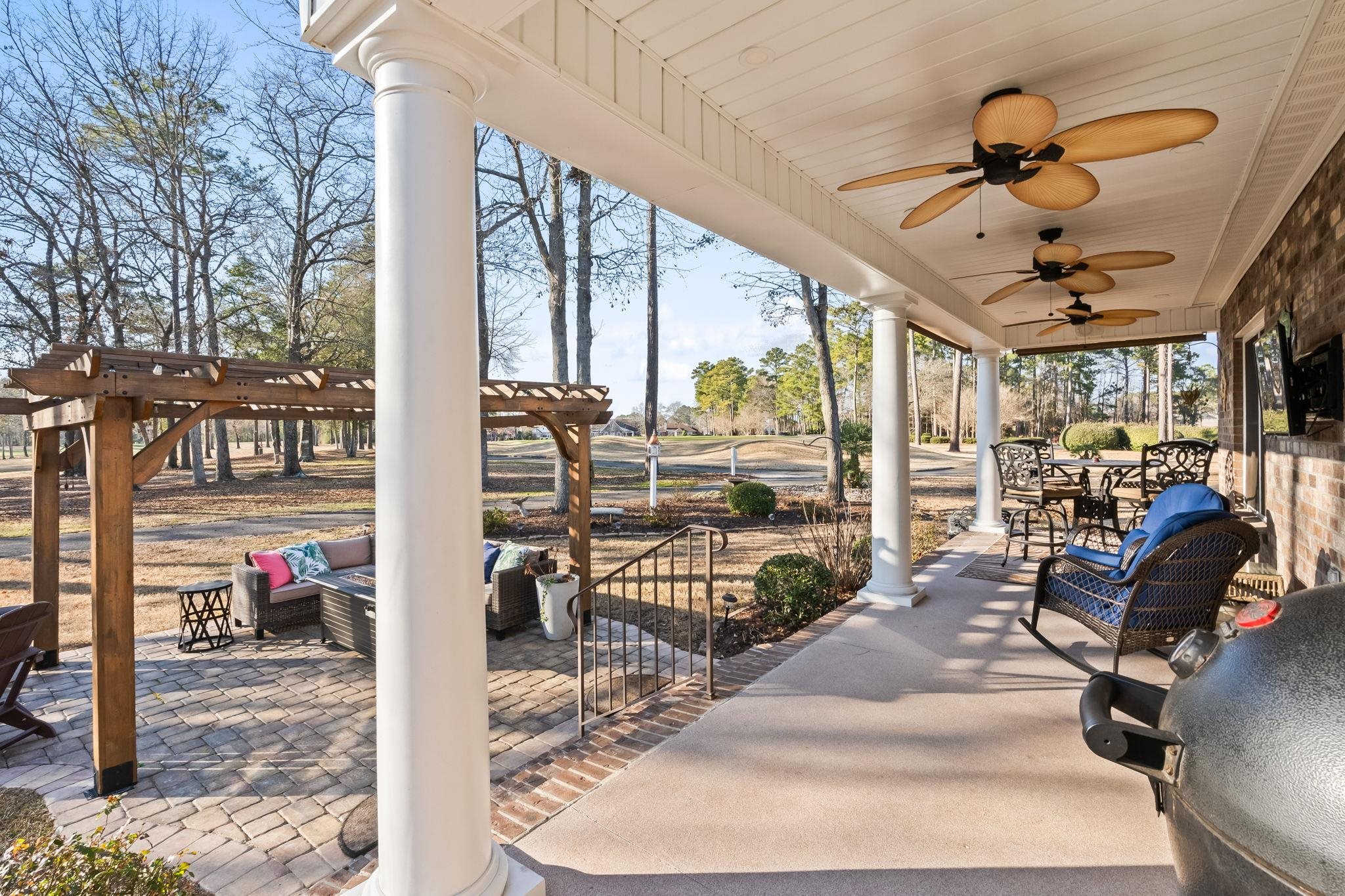 Spectacular views of the 13th tee and 14th fairway set an outstanding backdrop for this impeccably maintained brick beauty, ideally situated within the highly sought after Long Bay Club. From the moment of entry, the home captivates with a striking, versatile floor plan highlighted by soaring ceilings, recessed lighting, and refined architectural details, including elegant mouldings and modern shaker style wainscoting in the great room and main level hallway. The spacious granite eat-in kitchen is thoughtfully designed for both everyday living and entertaining, featuring abundant cabinetry and counter space, a breakfast bar, pot filler, two pantries, and a newly installed wall oven. Just beyond, the sunroom invites you to relax and unwind while enjoying sweeping golf course views from every angle. The privately situated primary suite is a true retreat, offering dual walk-in closets, a well planned bath, and direct access to the sunroom. Bedrooms two and three provide generous closet space and share a convenient Jack-and-Jill bath, while a multi-purpose bonus room offers endless possibilities for a home office, media room or guest space. The great room, complete with a corner fireplace, opens seamlessly to a covered rear porch and paver patio with pergola—perfect for extended outdoor living and entertaining. The interior is beautifully upgraded with wood and tile flooring throughout, fresh interior paint, and classic Plantation Shutters. Additional highlights include an oversized two car garage with a separate golf cart bay featuring new epoxy flooring application, generator hookup, bluetooth enabled speakers on the rear porch as well as motion detector lighting. The beautifully landscaped homesite offers invisible pet fencing and extended driveway parking. Major updates include a new roof and water heater in 2024, along with new HVAC replacements in 2024/2019. Long Bay Club is a Jack Nicklaus Signature golf course community with optional country club amenities. This exceptional property is just minutes from the pristine beaches and conveniences of North Myrtle Beach as well as Hwy 31 for effortless access to all the Grand Strand has to offer. Don't miss this one!