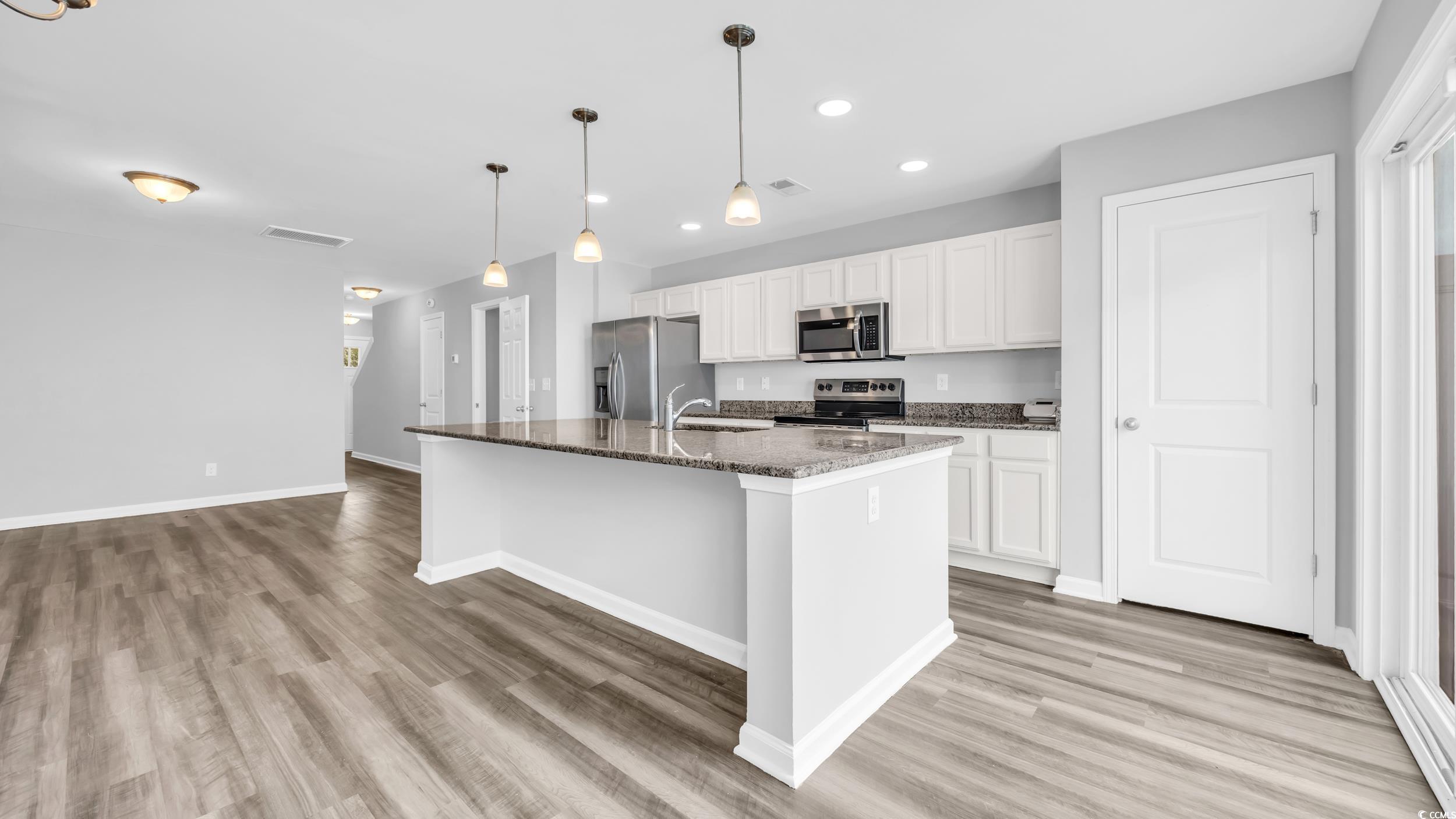 Welcome to Fairways at Wild Wing, a vibrant golf course community. This charming townhouse, ideally situated within close proximity to grocery stores, delightful restaurants, golf courses, Coastal Carolina University, and Tanger Outlets—everything you could possibly need at your fingertips. Spanning 1,450 square feet, this inviting home features a spacious open layout on the main level that includes a convenient half bath and access to the one-car garage. The well-appointed kitchen boasts stainless steel appliances and granite countertops, perfect for entertaining with its large island and combined dining area. Upstairs, discover three comfortable bedrooms alongside a practical laundry room; the primary suite is a true sanctuary with vaulted ceilings that invite natural light, complemented by a generous walk-in closet and an elegant en suite bath with double sinks and a walk-in shower. Whether you're seeking a primary residence or an investment opportunity, this home offers the ideal blend of style and functionality—perfect for enjoying relaxing days by the community pool!