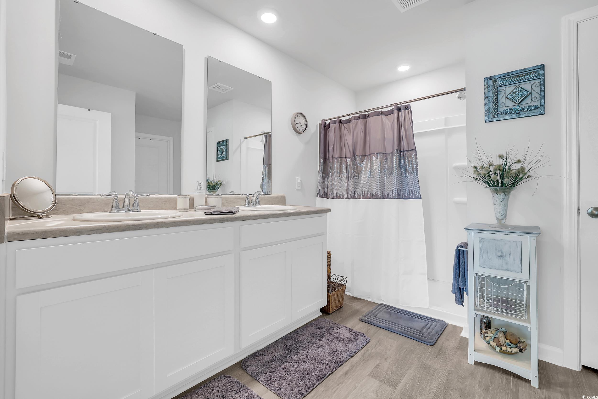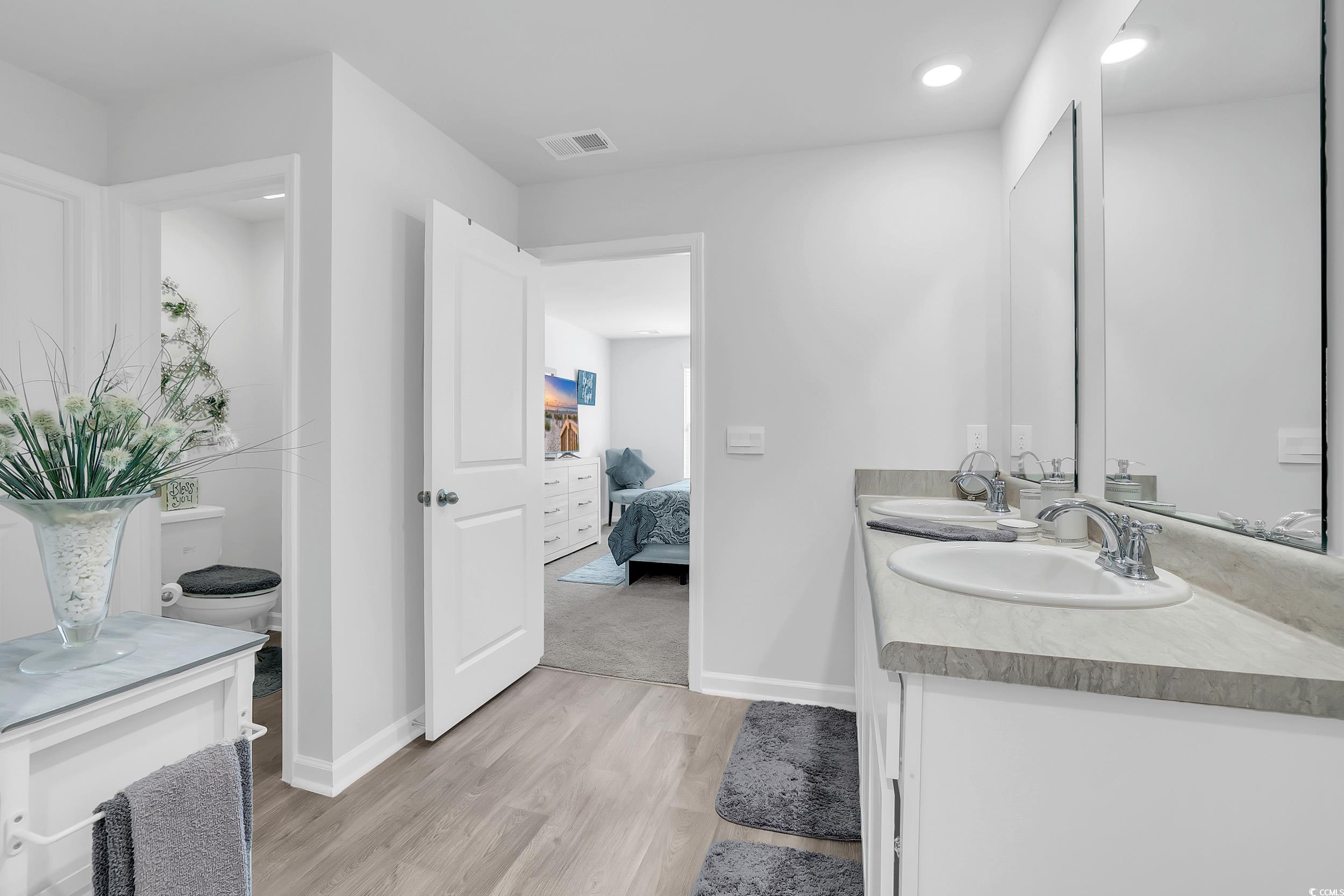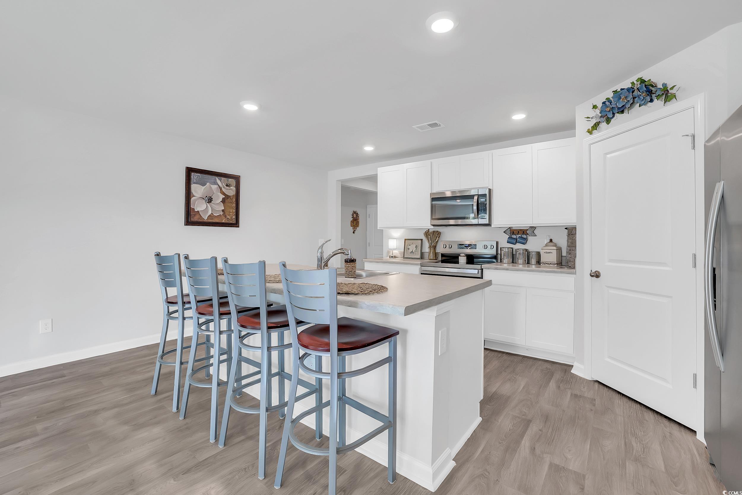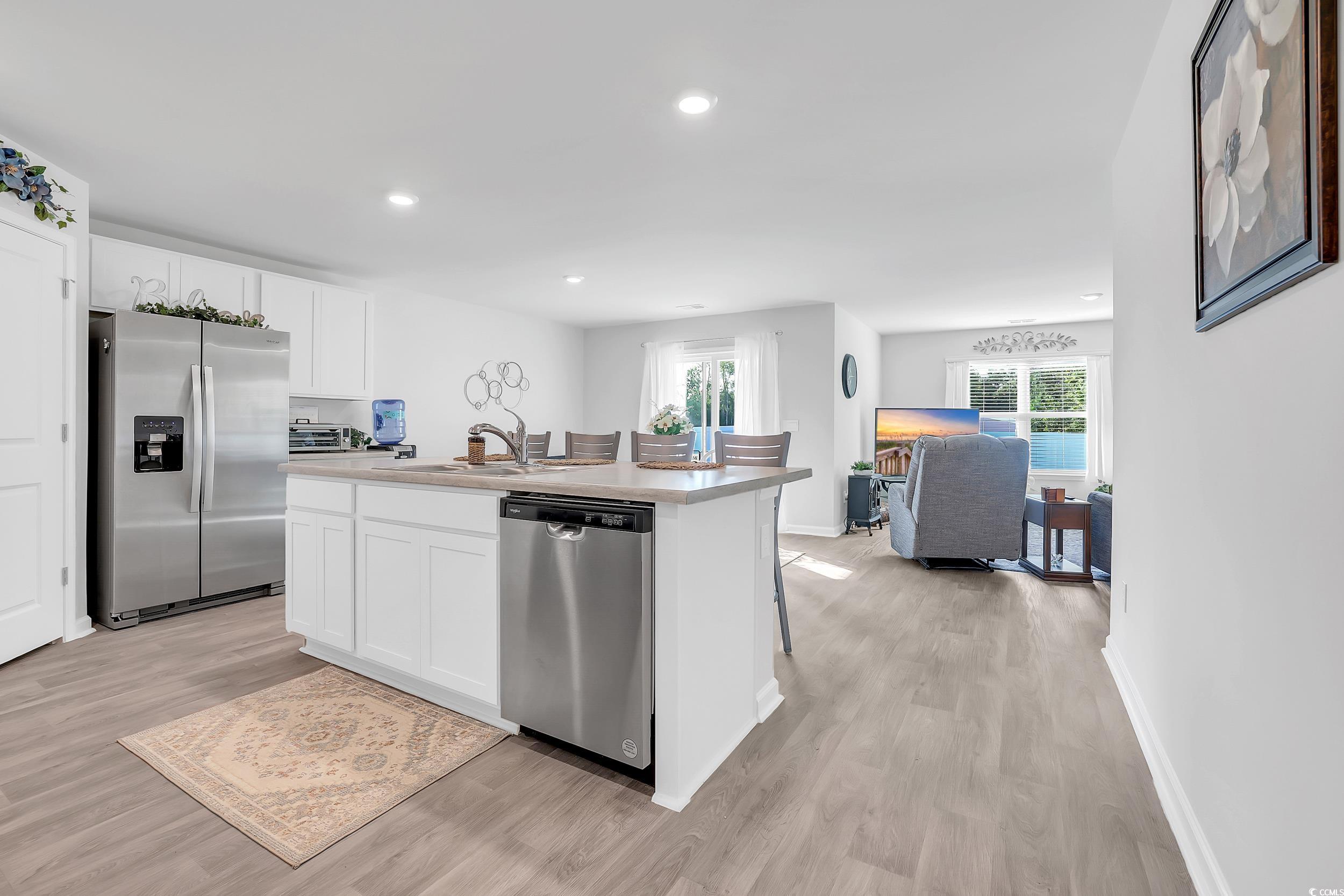 Welcome home! Tucked away in a peaceful cul-de-sac, this home offers privacy, charm, and the perfect location! This beautifully designed residence offers an open-concept layout that seamlessly connects the living room, dining area, and kitchen—perfect for hosting friends and family. The kitchen is a dream with stainless steel appliances, a walk-in pantry, an oversized island, and elegant pendant lighting. Durable and stylish vinyl flooring flows throughout the main living areas, baths, and laundry room. The private owner's suite is thoughtfully tucked away at the back of the home, featuring a spacious walk-in closet and a large bath complete with a double vanity, 5-foot shower, and linen closet. Enjoy the Carolina breeze from your covered back porch, ideal for relaxing afternoons or morning coffee. Blinds on all standard windows. Included are five indoor ceiling fans, an outdoor fan, satin chrome cabinet hardware for the kitchen and both bathrooms, and paint for the garage. Best of all, this is America's Smart Home! Stay connected and in control with an industry-leading smart home package that includes a video doorbell, smart thermostat, door lock, and front porch light—all accessible from your smartphone or with Alexa voice control. This home is ready for you—modern, welcoming, and designed for the way you live today!