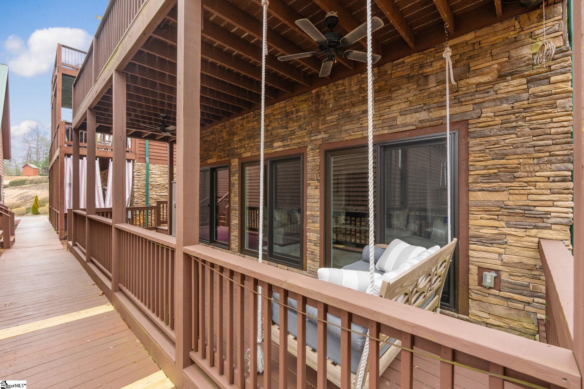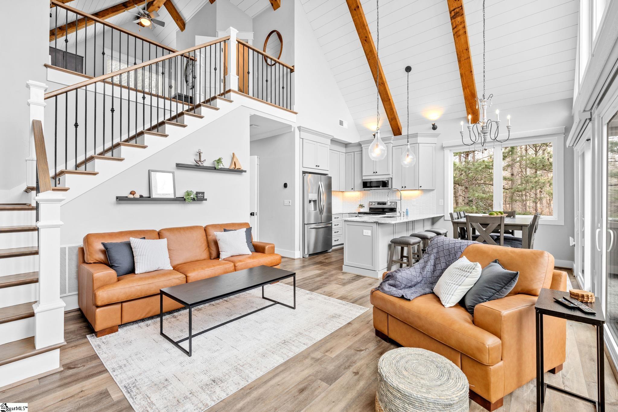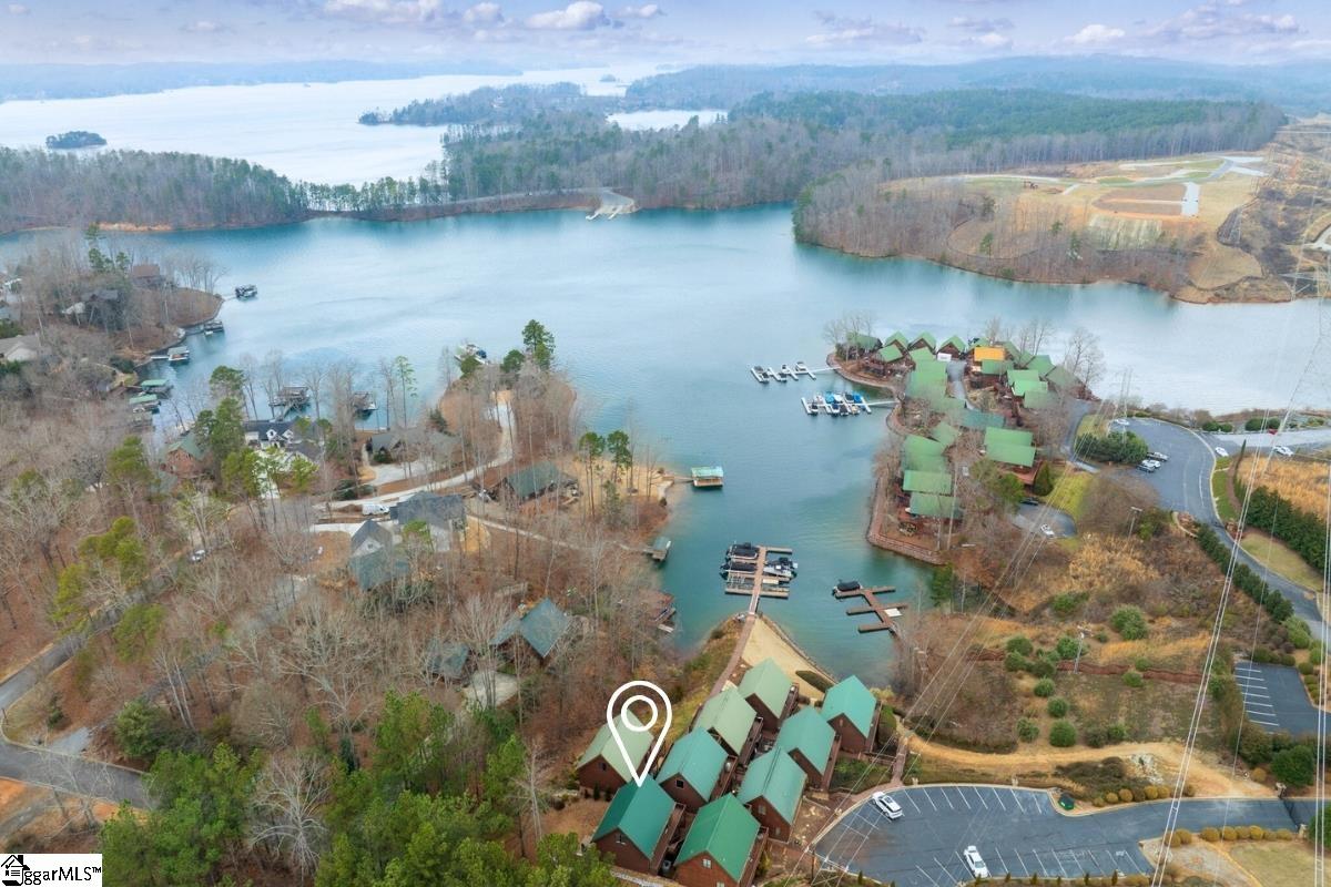 A stunning A-frame waterfront retreat built in 2020, ideally positioned in a deep-water cove on Lake Keowee. The adjacent lot may be available for purchase—either separately or together—offering enhanced privacy and future possibilities. Enjoy pristine emerald waters and beautiful views of the Blue Ridge Mountains, along with a deeded boat slip (#8) featuring a jet ski storage lift already in place just steps from the home. Situated within the gated, sought-after community of Knots Landing, the property is conveniently located just 15 minutes from Clemson and 20 minutes from Seneca. The main level features an open floor plan highlighted by exposed wood beams, soaring cathedral windows, a gas fireplace, luxury LVT flooring, and a kitchen with granite countertops and stainless steel appliances. The spacious primary suite is also located on the main level and includes a private bath, while an upper loft bedroom offers its own full bath. The walk-out lower level provides the perfect space for entertaining, with room for an 85" TV with built-in surround sound, two additional bedrooms, and a shared full bath. Both the main and lower levels feature new Alta motorized blackout shades. Outdoor living is equally impressive, with full-width decks on both levels and a stone patio featuring a brand-new 65" TV and gas fire pit—ideal for relaxing or entertaining. Also included in the price is a buildable lot with deeded boat slip (#7). All furniture and the hot tub are negotiable with purchase. Rentals are not permitted per HOA.
