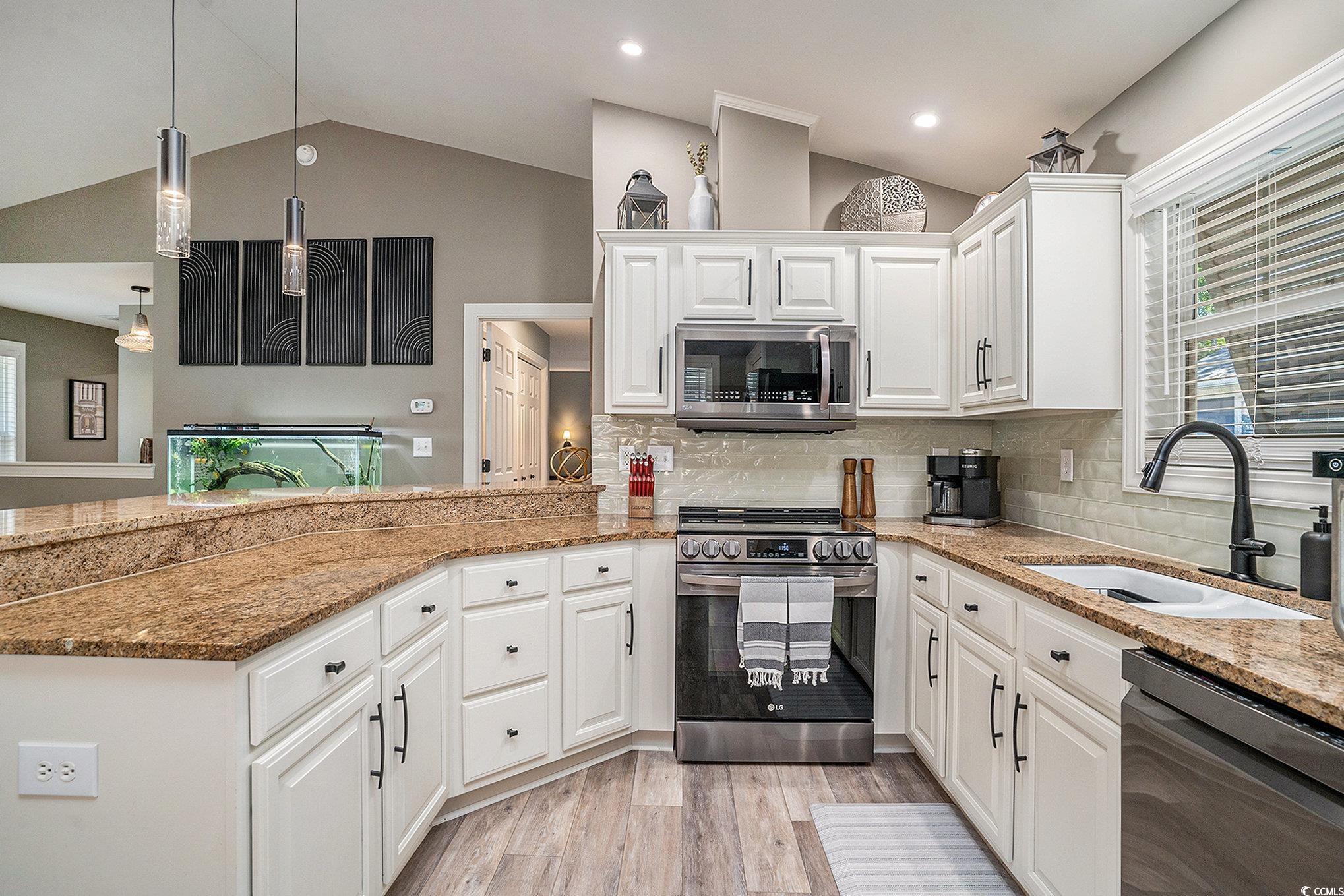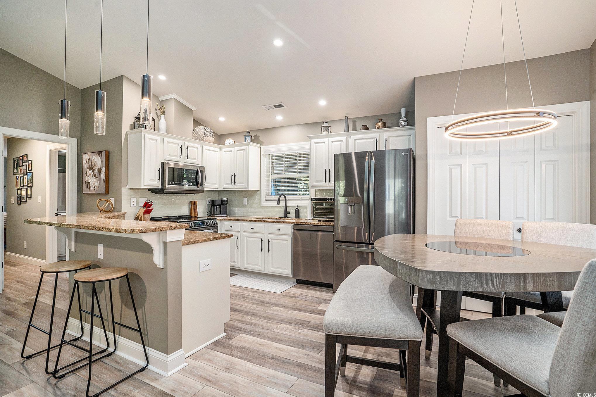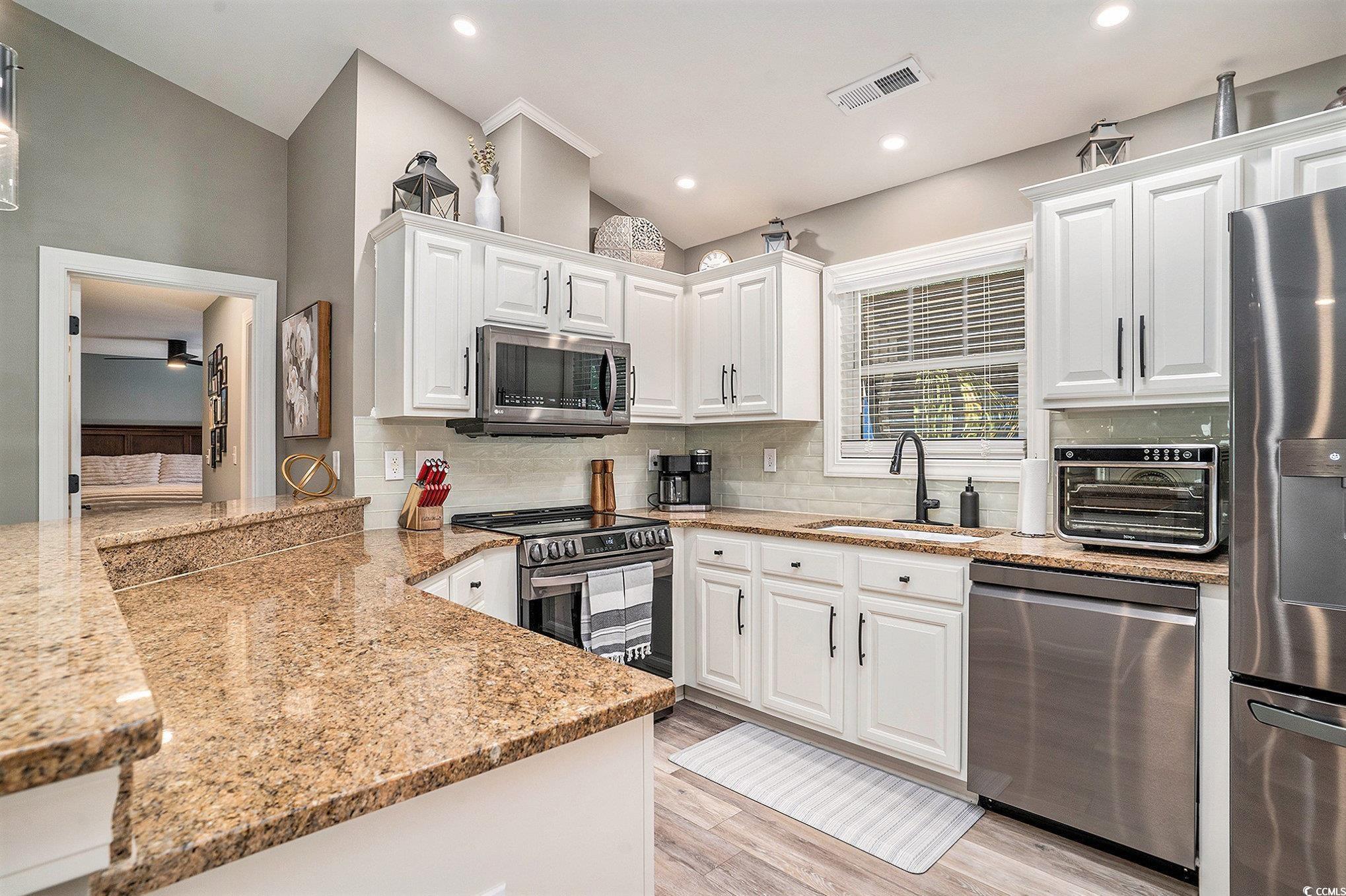 Welcome to this beautifully updated raised beach home just a short distance away from the sandy beaches in the heart of Surfside Beach! This thoughtfully designed residence blends coastal charm with modern upgrades, offering the perfect setting for full-time living, or even a secondary home, or investment property! Step inside the spacious open-concept main living area, where vaulted ceilings and abundant natural light create a bright and airy atmosphere. The living room flows seamlessly into the kitchen and dining space, complete with luxury vinyl plank flooring throughout, fresh neutral paint, and tasteful design finishes. The kitchen is a chef’s dream featuring crisp white cabinetry, stainless steel appliances, a tile backsplash, updated lighting, and a convenient breakfast bar perfect for entertaining or those quick meals. The home offers 3 generously sized bedrooms and 3 full bathrooms. The primary suite includes private balcony access through sliding glass doors, which is perfect for your morning coffee, relaxing, reading a book or even dining al fresco. There is also a double closet so you will have plenty of space for your things. The en-suite bathroom showcases dual sink vanity, updated mirrors and fixtures, and a shower. The primary bedroom another bedroom and 2 bathrooms round out the 2nd floor. On the first floor you will find the third bedroom and bathroom as well as a second living room. The garage is also heated and cooled, this way you can enjoy it as living space or just a place to cool down and relax! Outside, you’ll love the expansive stamped concrete patio which perfect for outdoor dining, grilling, or hosting guests. The beautifully maintained landscaping adds to the outdoor charm. There’s also ample space under the balcony to park your golf cart, bicycles and beach gear. This home is nestled on a quiet street just minutes from the beach, the famous Murrells Inlet MarshWalk shopping, restaurants, Myrtle Beach State Park, golfing and all the fun the South Strand has to offer. With no HOA and a turnkey interior, this is your chance to live the beach life you’ve been dreaming of. Buyer is responsible for verification.