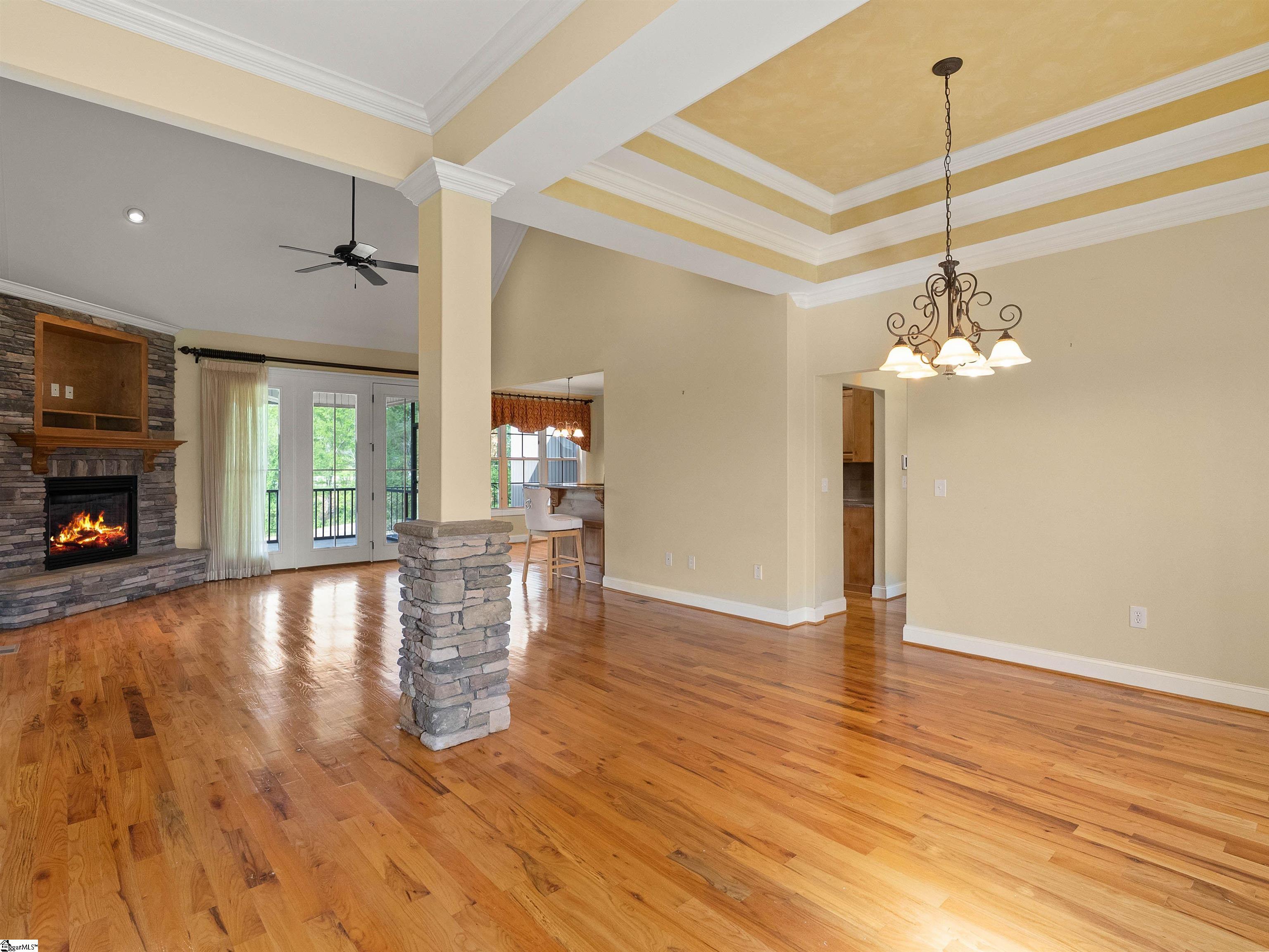 Experience refined living at 114 Royal Troon, beautifully positioned within the sought-after Links O' Tryon golf course community. Surrounded by the natural beauty of the Upstate and framed by views of Hogback Mountain, this custom home offers a blend of elegance, comfort, and thoughtful design. From the moment you arrive, the home makes a lasting impression. An expansive front porch with stacked stone columns sets the tone, complemented by matching stone accents and a long, inviting driveway. Lush landscaping with seasonal blooms enhances the sense of arrival and creates a welcoming first impression. Step inside to a space that immediately feels both elevated and inviting. Rich hardwood floors, detailed crown molding, and a striking stacked stone fireplace anchor the main living area, where vaulted ceilings add volume and light. The formal dining room features a double tray ceiling, creating a perfect setting for gatherings both large and intimate. The kitchen is designed to bring people together, offering upgraded cabinetry, granite countertops throughout, tile backsplash, and a spacious breakfast bar. A bright breakfast room overlooks the course, while a full suite of GE Profile appliances, including the refrigerator, provides both style and function. Just off the living area, a large screened porch with composite decking offers a peaceful place to unwind, along with an adjoining open deck ideal for grilling and entertaining. A small fenced area provides a perfect space for pets, and a golf cart or lawn equipment garage is conveniently located within the tall crawl space. The main level features a well-appointed primary suite with a double tray ceiling, a walk-in closet with custom shelving, and a spa-inspired bath complete with a freestanding tub, double vanity, and an expansive tiled shower. Two additional bedrooms on the main level offer flexibility for guests or family. Upstairs, a generous bonus room, an additional bedroom, and a full bath create even more living space, ideal for a private guest suite or multi-purpose use. Additional features include tinted windows, beadboard panel doors, central vacuum, custom pantry shelving, and rounded drywall corners that add subtle architectural detail throughout. Located within the Landrum school district and just minutes from Campobello, Landrum, and Greer, this home offers both convenience and a peaceful setting in one of the area’s most desirable golf course communities. Originally constructed by respected local builder Randy Camp, this home reflects quality craftsmanship and attention to detail throughout.