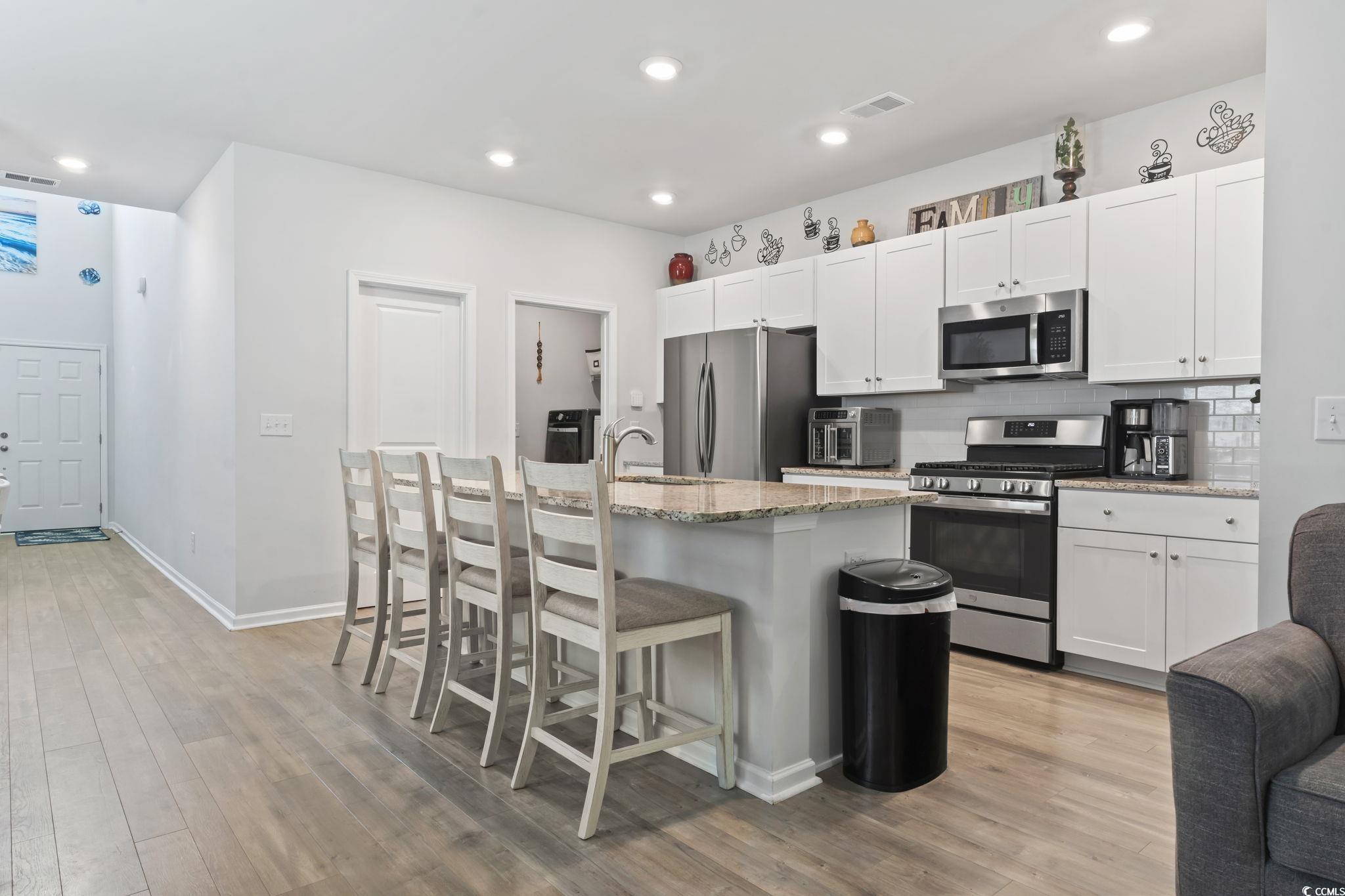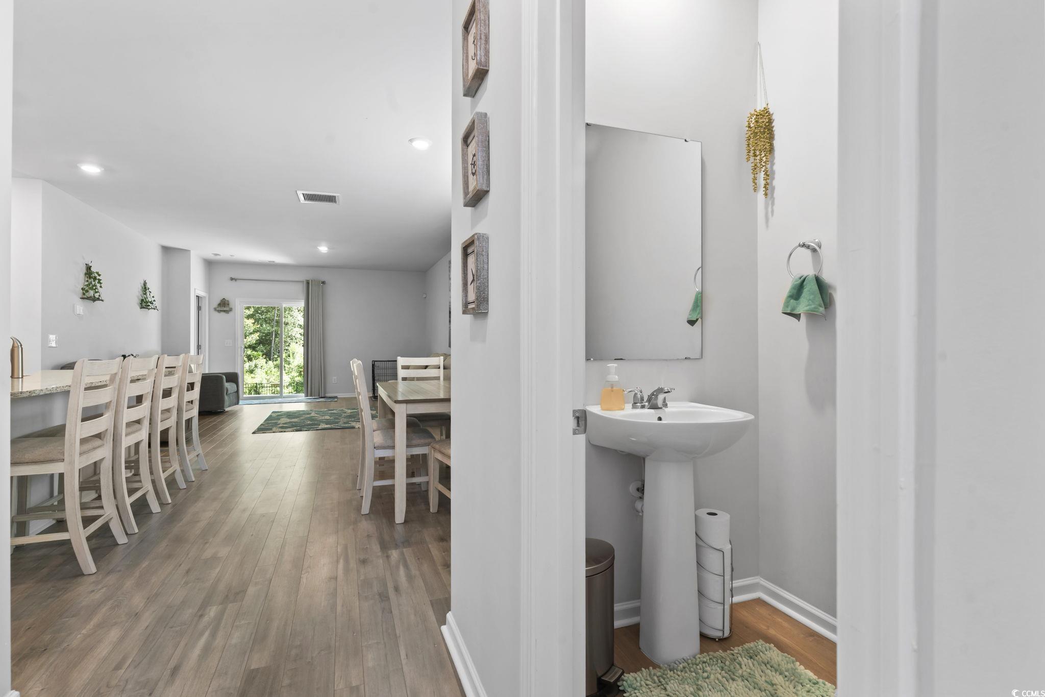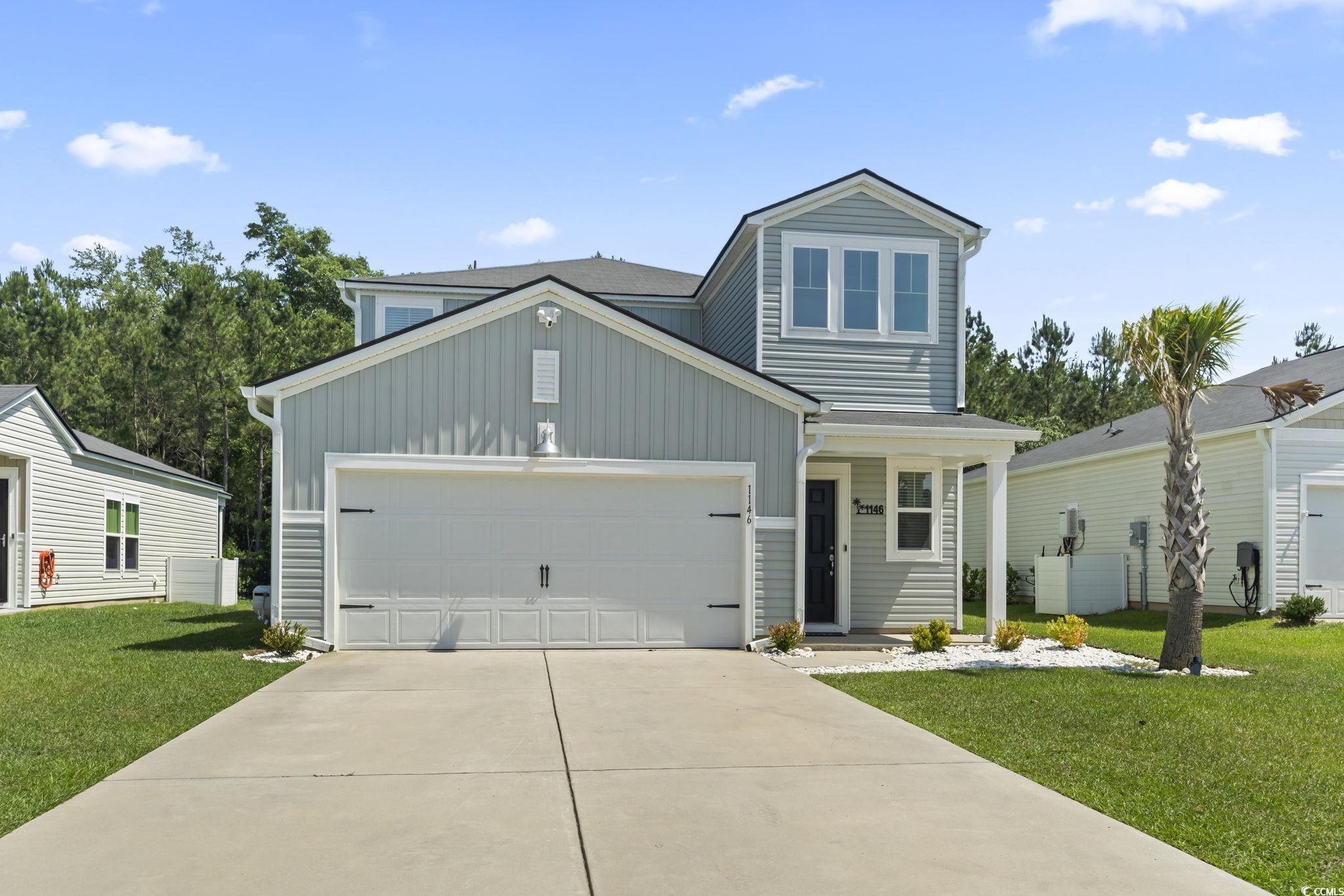 OPEN HOUSE Saturday & Sunday October 18th and 19th 11am-1pm! This spacious 2300+sq ft 5 Bedroom 2.5 Bathroom home on a wooded lot has a wonderful floorplan with separation of space. The light filled 2 story foyer greets you as you enter. The large kitchen has granite counter tops, over-sized island, a pantry, gas stove and white cabinets. The first-floor primary suite has walk in closet and double sinks in the bathroom. The second floor of this home features a Bonus area with endless possibilities. The remaining 4 bedrooms are also upstairs. The tankless water heater ensures constant hot water. The landscaping has been upgraded and gutters installed. Enjoy coffee and grilling on the Covered Rear Porch! The rear yard is fenced and backs up tp woods, perfect for Entertaining! This community has a beautiful swimming pool with a cabana, bathrooms and playground. Location is convenient to Golf, Beaches, Shopping Dining & Area Attractions. All information is deemed reliable but not guaranteed. All measurements/square footage are approximate and not guaranteed. Buyer and buyers agent are responsible to verify all information.