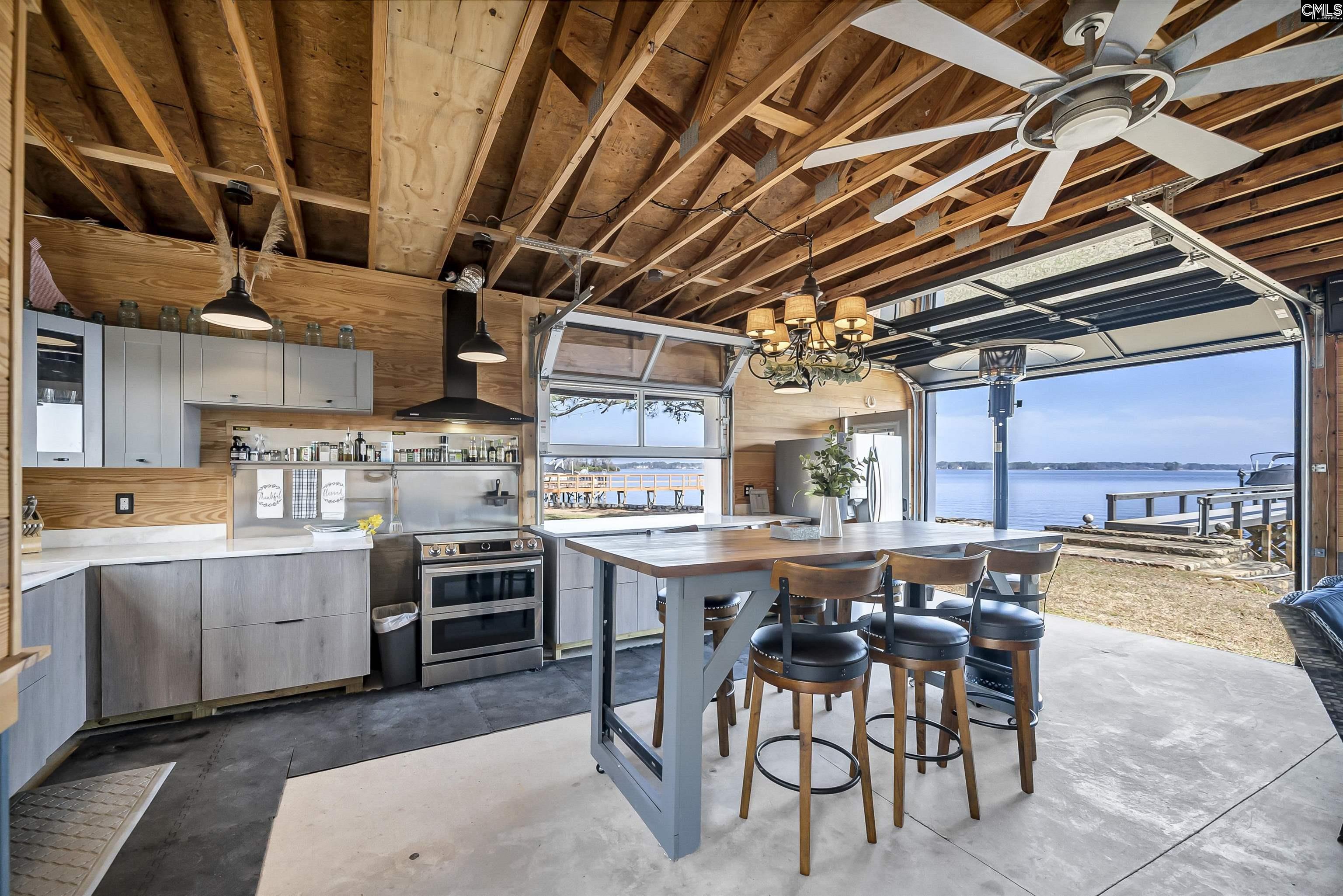 Wake up to spectacular sunrise views over Lake Murray’s big water from this exceptional lakefront retreat. Perfectly positioned along a coveted stretch of shoreline, this property offers 107 feet of east-facing waterfront with sweeping panoramic views and peaceful mornings that feel like a private getaway every day.Situated on a private .81-acre unrestricted lot, the property offers a rare combination of space, privacy, and flexibility rarely found on Lake Murray. Ownership includes the valuable 360 line, providing additional shoreline control and enhanced waterfront access. A beautifully constructed stone retaining wall frames the shoreline while preserving wide-open water views.Inside, the home features a comfortable split floor plan with three bedrooms and three full baths, along with a versatile bonus room ideal for a home office, fitness space, or additional guest accommodations. The primary suite offers a relaxing retreat with walk-in closet, double vanities, and private bath. The kitchen is thoughtfully designed with Corian countertops and soft-close cabinetry, creating an inviting space for everyday living and entertaining.One of the most remarkable features of the property is the separate waterfront entertaining pavilion. Originally a boathouse, it has been transformed into a stunning lakeside gathering space just steps from the water. The pavilion includes a fully equipped second kitchen with double oven, induction cooktop, ice maker, and half bath, along with a mirrored glass garage door that opens directly toward the lake—creating a seamless indoor-outdoor entertaining experience.Outdoor living is equally impressive. The private dock offers approximately 110 feet of dock space, a Golden Boat Lift remote system, generous lounging areas, and Lumberock composite decking with a 50-year limited warranty. Additional features include lakeside steps, a jet ski dock with winch, and two kayaks that convey with the property.Additional highlights include a solar-powered gated entrance, fully fenced yard, two powered storage buildings, 30-amp RV hookup, high-speed internet availability, reverse osmosis system with whole-house filtration, and r Disclaimer: CMLS h