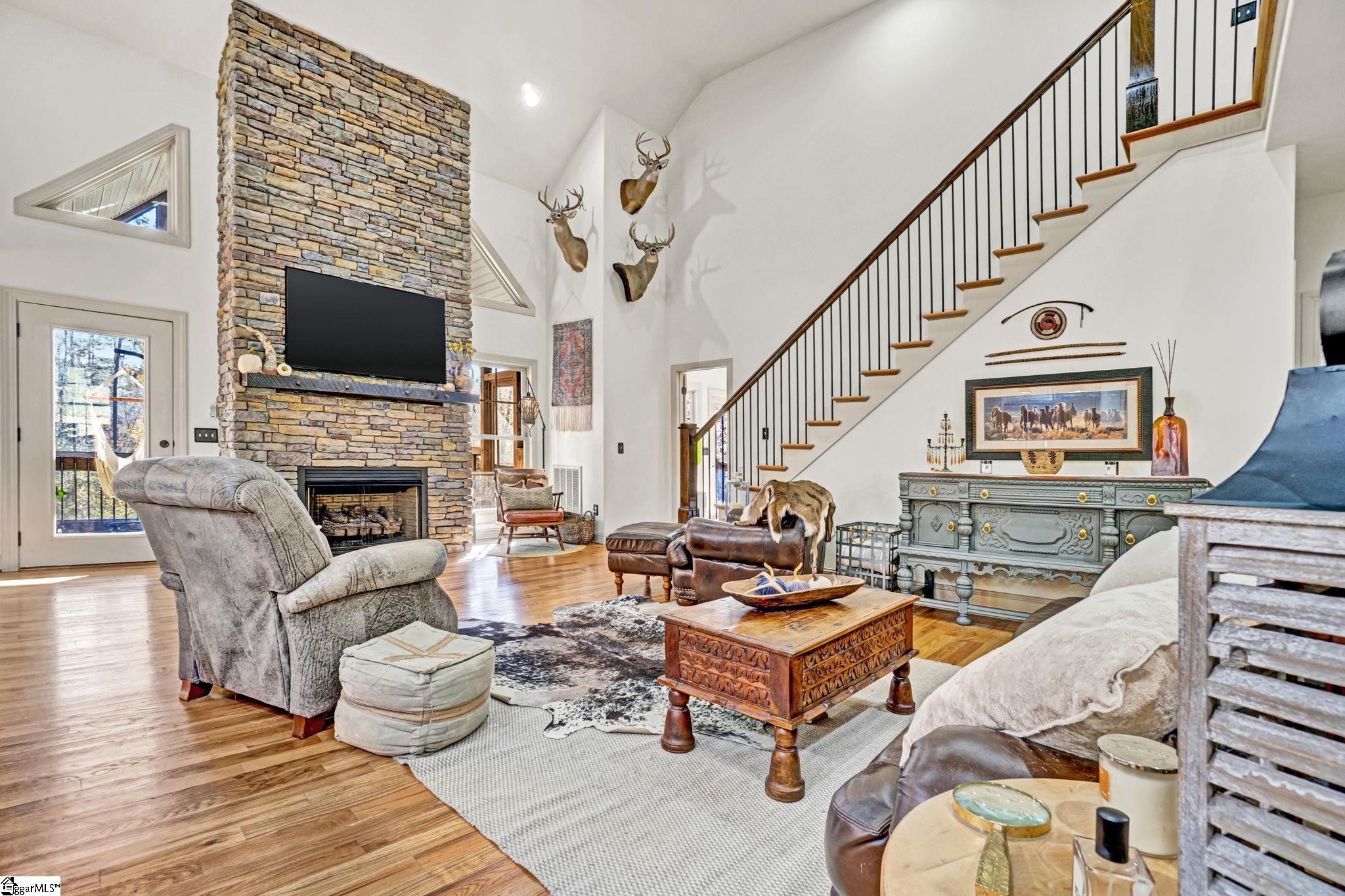 At the end of a serene cul-de-sac, this impressive custom-built estate rests on a private 6.17-acre parcel, offering approximately 7,084 sqft (finished/unfinished) where every detail reflects harmonious blend of elegance and functionality. Even the lower level impresses with fire-resistant slat-rock ceilings that combine durability with refined style. A striking, oversized entry door immediately commands attention, welcoming you into a foyer that sets the tone for the luxurious interior and inviting open-concept layout. The living room, the heart of the home, features soaring 18-foot ceilings and a dramatic floor-to-ceiling stone gas fireplace, serving as a centerpiece ideal for entertaining or quiet, cozy evenings. Flowing seamlessly from the living area, the chef’s kitchen is both a masterpiece of style and function, anchored by a grand island and outfitted with a built-in gas stove, over-the-range microwave convection oven, large copper farmhouse sink, soft-close cabinetry, granite countertops, and a tasteful tile backsplash, with a layout that accommodates a breakfast nook, formal dining room, dedicated office, walk-in laundry, full guest bathroom, and the luxurious primary suite. The home is also equipped with a tankless hot water heater, ensuring endless hot water and energy-efficient performance throughout. The primary suite offers a serene retreat with a walk-in closet and spa-like ensuite featuring a double vanity, jacuzzi tub, and separate walk-in tile shower. Upstairs, a generous flex room complements the second and third bedrooms, each with walk-in closets, a full bathroom, and a walk-in attic, providing versatile spaces for family, guests, or storage. Above the garage, the fourth bedroom/flex room continues the home’s elegant rustic charm with cedar LVP flooring, cedar tongue-and-groove ceiling paneling, its own bath, and space for a closet, making it ideal as a guest suite, media room, or additional bedroom, while the lower-level fifth bedroom boasts cedar LVP flooring, a walk-in closet, and a bath prepped for a shower, toilet, and sink, with all plumbing and electrical ready. A generous five space garage, including a spacious two-car garage on the main level and a three-space tandem garage on the lower level, complemented by dual driveways providing convenient access for guests, hobbies, or storage. Step outside to maintained yet low-maintenance grounds featuring rubber mulch, river rock accents, a 7-zone irrigation system, a lush lawn, along with a wide front porch that stretches along the front and sides of the home, while the full-length back porch/balcony include both open-air and screened-in areas with durable aluminum screens for ease of care. From the lower-level garage, a concrete patio leads to a firepit surrounded by river rock, offering peaceful views of the wooded acreage where deer often wander, and a fully enclosed fenced area provides space for pets or a future pool. To the right of the home, a flowing creek winds through a cleared area, while wooded privacy lines the rear, and wide trails meander throughout the acreage. Gentle topography allows for a potential shop, barn, or pool, and a private golf tee box adds a unique recreational element. The property provides a serene, natural setting where the sights and sounds of the outdoors can be enjoyed daily. Located in Edens Ridge, the community combines elegance and lifestyle with low HOA dues and a covered picnic area perfect for gatherings. The estate is zoned for Six Mile Elementary, R.C. Edwards Middle, and Daniel High School, providing access to excellent education while remaining in close proximity to Lake Keowee and Clemson University. This is more than a home — it is a sanctuary where luxury, convenience, and nature intertwine seamlessly to create a lifestyle defined by elegance, privacy, and tranquility, offering a rare combination of sophistication, comfort, and connection to the natural surroundings.