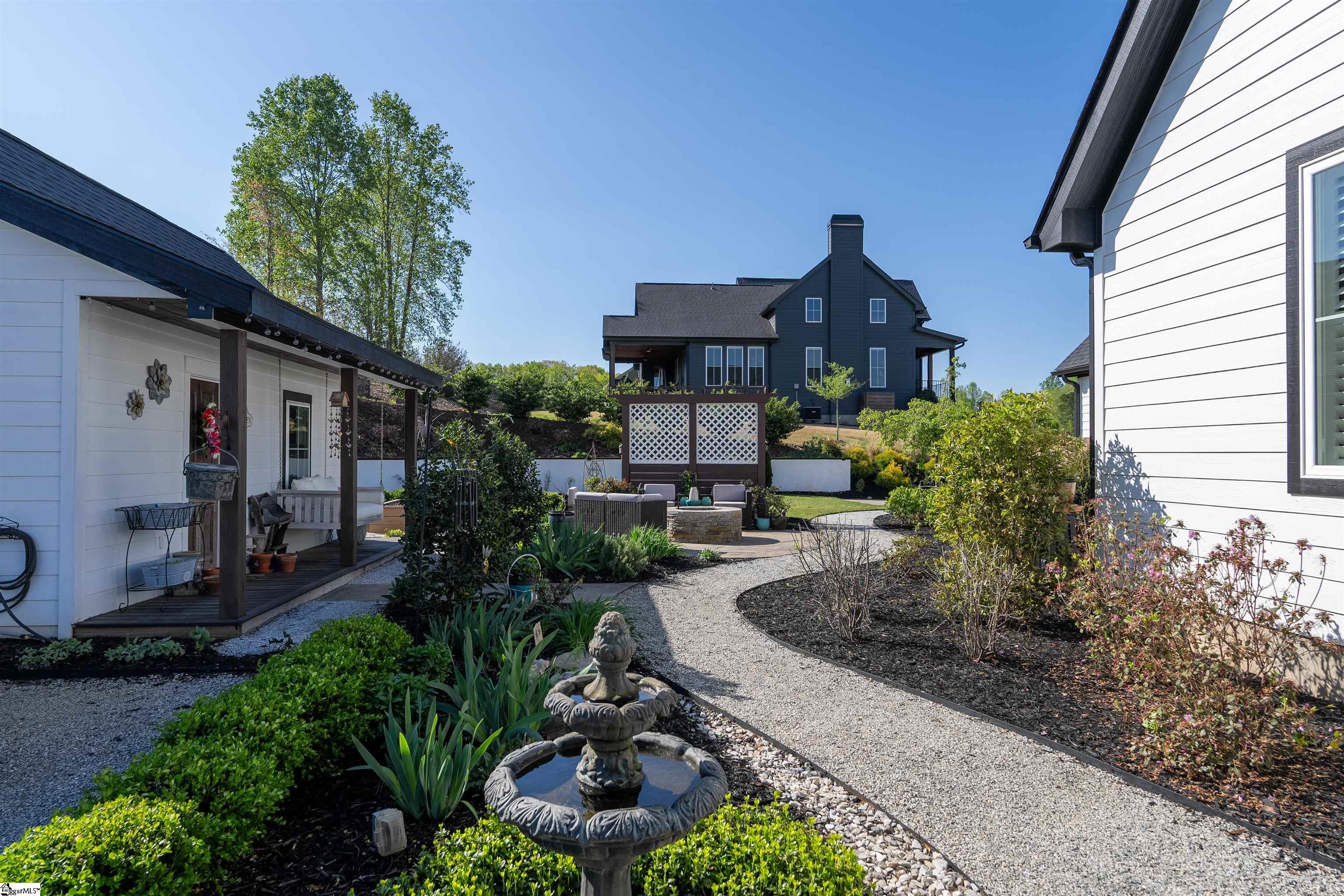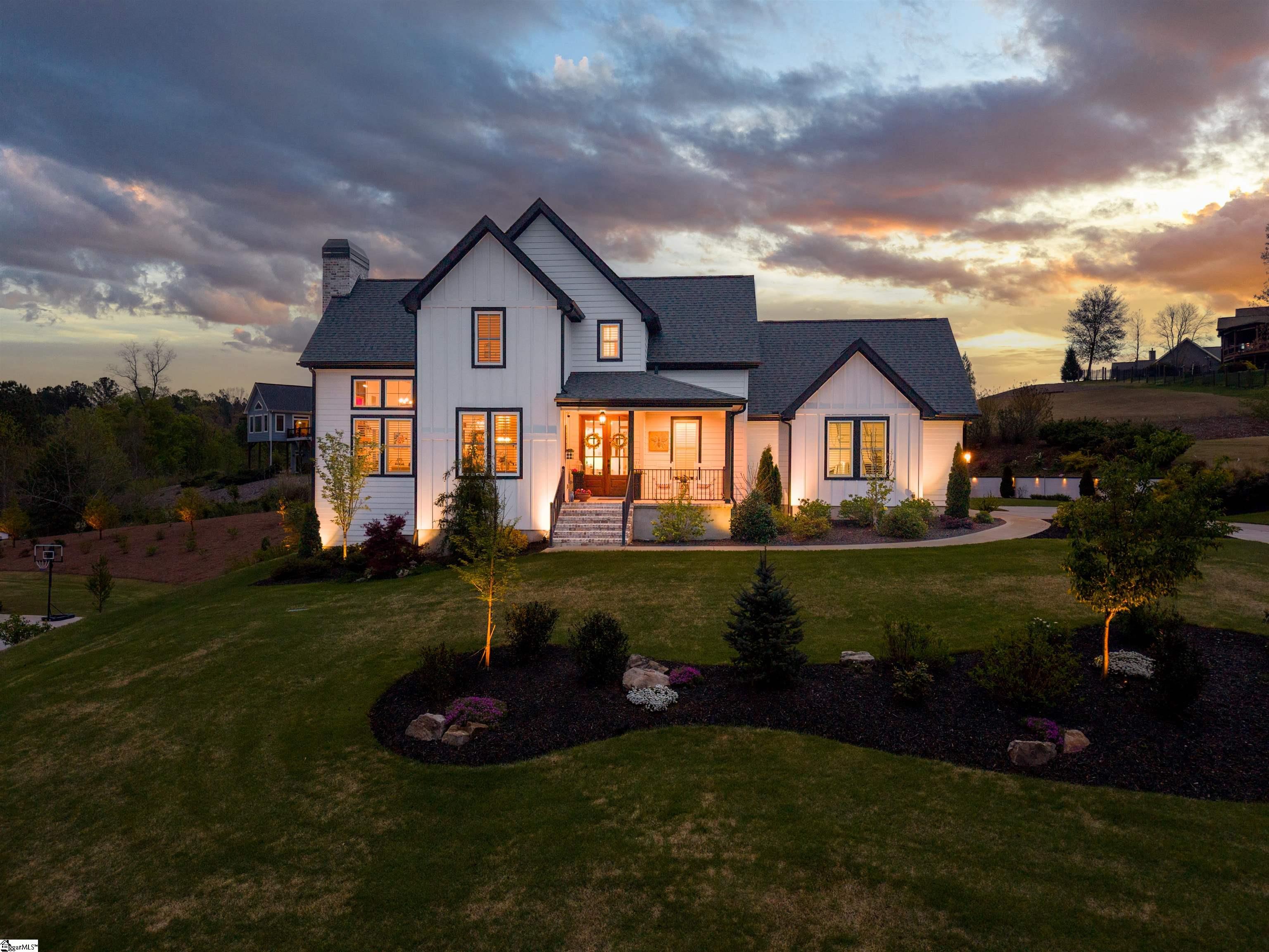 Nestled within the desirable Sanctuary community, this remarkable residence, built in 2021, presents captivating vistas of the Blue Ridge Mountains. The home showcases a voluminous, contemporary design, commencing with an airy living room bathed in sunlight, accentuated by soaring vaulted ceilings, striking timber beams, and a central gas log fireplace. Exquisite hardwood flooring extends throughout, imparting a sense of warmth and enduring style. The dining room provides an ideal setting for gatherings, while an adjacent den, complete with a second fireplace, adds intimate appeal. The refined kitchen boasts a streamlined configuration, tasteful finishes, marble countertops, stainless steel appliances, a farmhouse sink, undercabinet illumination, a substantial island, and a convenient pot filler. Adjacent, a generous pantry, enhanced with extra cabinetry, shelving, and marble surfaces, delivers abundant storage and counter space with a touch of sophistication. The main level hosts the opulent primary suite, featuring a stunning bathroom with a sizable walk-in shower, dual vanities, a dressing table, and a walk-in closet fitted with custom built-ins. A well-appointed laundry room with a sink and supplementary cabinetry is also conveniently located on this floor, along with a guest powder room. Ascending to the upper level, a loft area overlooks the impressive beams and living space. This floor encompasses two additional bedrooms, a full bathroom, an office, and a flex room. The exterior of the property is particularly compelling, featuring a secluded deck connected to the main house and a yard that surveys the inspiring mountain panorama. A stone-paved fireplace area, accompanied by ready-to-cultivate gardening beds, invites outdoor enjoyment. Furthermore, a detached backyard cottage provides a picturesque retreat, fully finished and suitable as an art studio, guest quarters, or entertainment venue. Ample parking is available with a double-car concrete driveway and an attached two-car garage, supplying considerable space for vehicles and storage. This exceptional home delivers modern comforts, community connection, and the splendid natural beauty of the Carolinas.