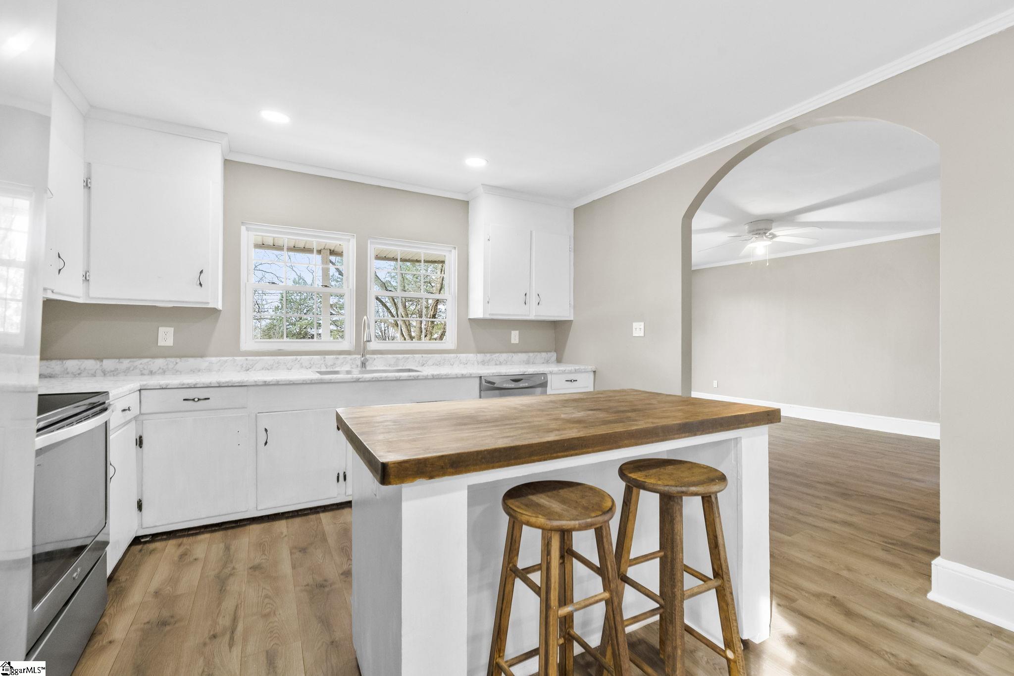 Charming 3-bedroom, 2-bath ranch just minutes from downtown Woodruff, where 1940s character meets modern convenience. This open-concept floor plan features durable vinyl flooring throughout and soothing, on-trend paint colors that create a welcoming feel. The spacious living room is anchored by a cozy wood-burning fireplace and flows seamlessly into the sunny kitchen with a full appliance package and a generous dining area—perfect for everyday living or entertaining. A huge walk-in laundry/mudroom offers direct access to the fully fenced backyard, adding everyday ease and functionality. Two secondary bedrooms share a hall bath with a tub/shower combination, while the primary suite features a walk-in closet and private shower. Ideally located just minutes from Main Street shopping, dining, and the Greenway Trail, this home offers the perfect blend of location, layout, and timeless appeal.