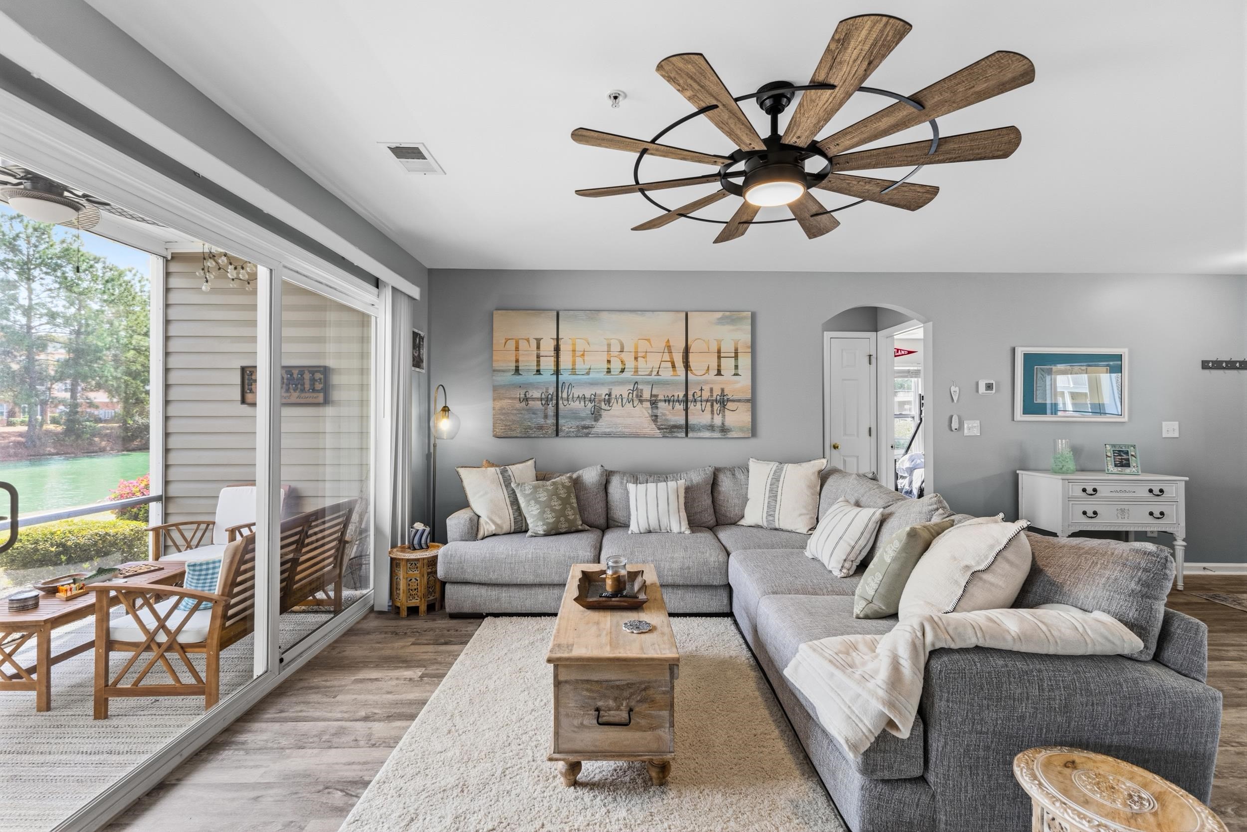 Enjoy this turn key ready first floor 3BR/2BA end unit in the popular Garden Creek community! This meticulously kept condo features a bright, open living and dining areas with sliding glass doors leading to a screened porch with a beautiful pond view. The kitchen includes gorgeous granite countertops, white cabinetry, and stainless steel appliances, with a convenient adjacent laundry room. The spacious primary suite offers a walk-in closet and private bath, while the additional bedrooms provide plenty of space for guests or a home office. Garden Creek is ideally located right next to the Market Common, shopping, dining, golf, and a very short drive to the beach! A great option for a primary home, second home, or investment property. **Lender incentive available with CrossCountry Mortgage. Please email jake.beardsley@ccm.com to inquire**
