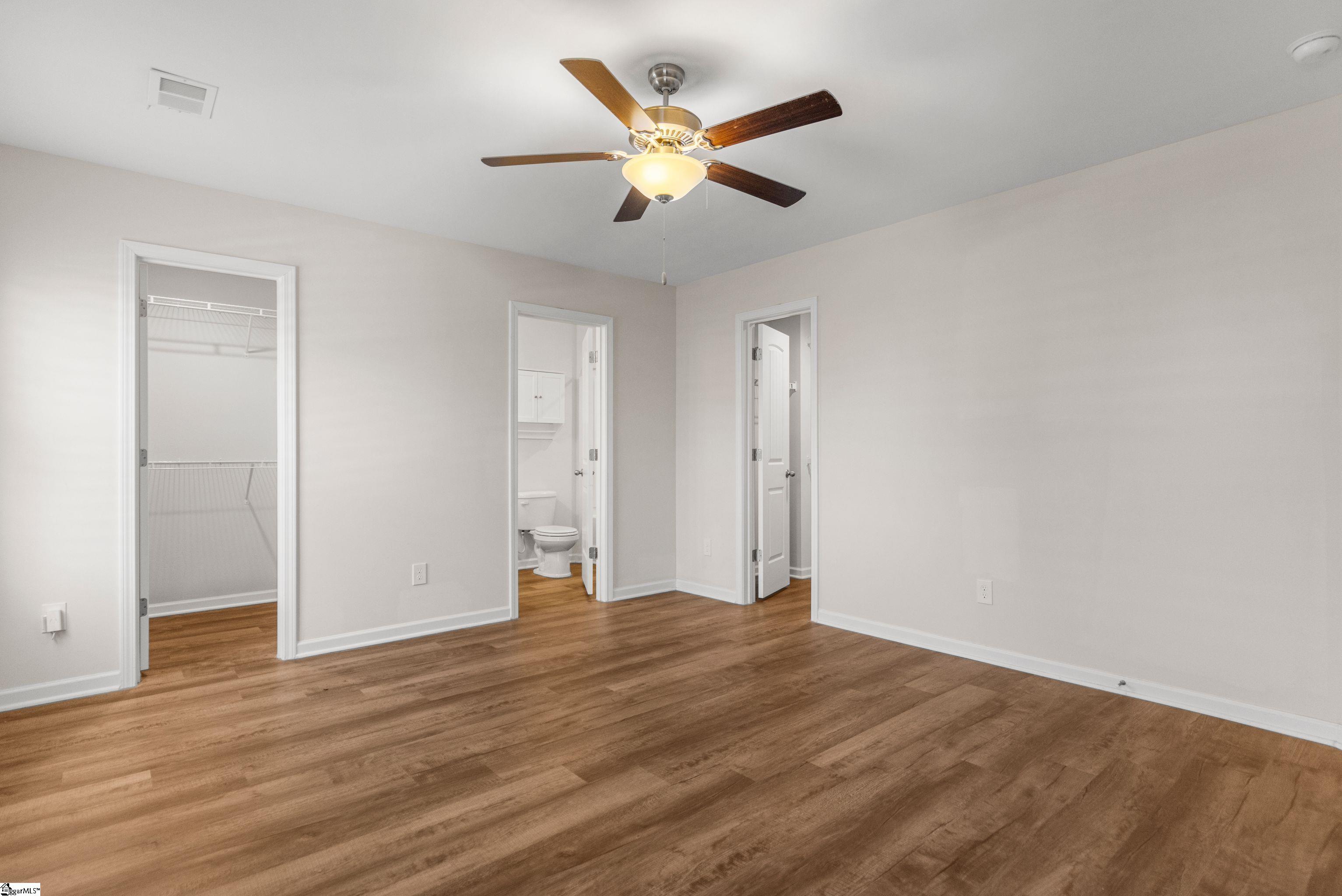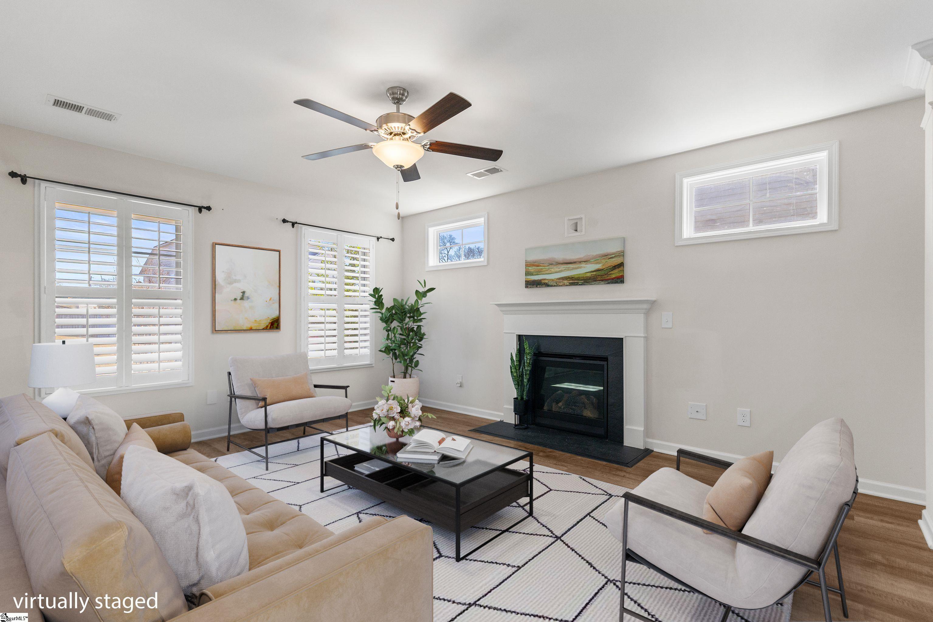 Beautifully maintained home featuring elegant plantation shutters and luxury vinyl plank flooring throughout the main level and stairs—no carpet in sight. The inviting living area offers a cozy gas-log fireplace, perfect for relaxing evenings. The spacious owner’s suite is conveniently located on the main level and boasts a spa-like 5’ walk-in shower, soaking tub, double vanities with framed mirrors, and two generous walk-in closets. A functional mudroom welcomes you just inside the garage entry. The kitchen is designed for both style and function with granite countertops, a classic subway tile backsplash, gas range, and a smart phone docking system connected to built-in Bluetooth speakers—ideal for entertaining. Step outside to enjoy the screened-in patio overlooking a fully fenced yard complete with a custom storage shed and irrigation system. Backyard also features a natural gas quick connect, offering convenient, tank-free outdoor cooking. Additional upgrades include a natural gas tankless water heater for endless hot water. Residents enjoy access to the community pool and sidewalks. Zoned for Fountain Inn High School and qualifying for USDA 100% financing, this home offers exceptional value, comfort, and modern convenience.