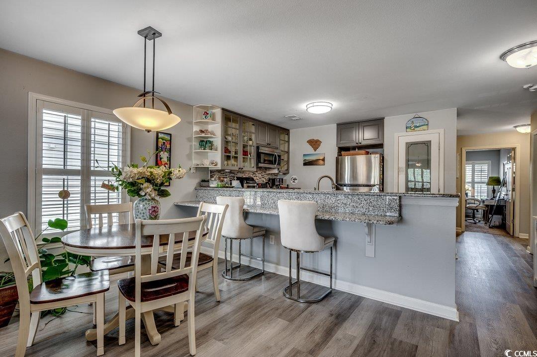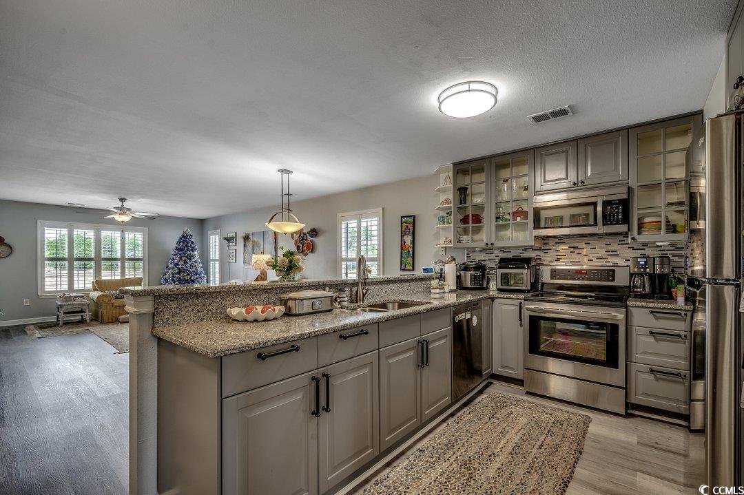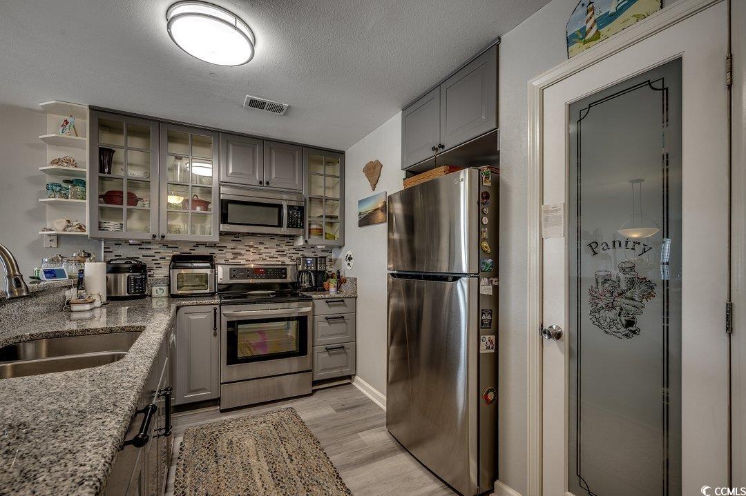 Step into this beautifully updated furnished condo offering over 1,300 square feet of heated living space — move-in ready and designed for comfort and style. Located in the desirable Fairways at River Oaks community, this 3-bedroom, 2-bathroom unit is sure to impress. Enjoy low-maintenance LVP flooring that flows seamlessly through the main living areas and bathrooms. The open-concept layout connects the kitchen to a spacious great room, perfect for entertaining or relaxing. The kitchen is a standout, featuring granite countertops, tile backsplash, stainless steel appliances, gray cabinetry, a breakfast bar, frosted-glass pantry door, and elegant glass-front upper cabinets. The large living and dining area opens to a screened porch with a sunshade — ideal for enjoying the fresh air year-round. The generously sized primary suite comfortably accommodates a king-sized bed and includes access to the screened porch. The ensuite bath features a modern vanity with solid surface countertops and a newly installed garden tub/shower combo. A walk-in closet provides ample storage, and large windows bring in plenty of natural light. On the opposite side of the unit, you'll find two additional guest bedrooms and a stylishly updated guest bath with a custom tile walk-in shower and solid surface countertop. The laundry closet includes a full-size washer and dryer, and there’s a convenient outdoor storage closet — perfect for beach gear or seasonal items. Located just a short walk from the community pool and picnic area, this condo offers both comfort and convenience in a prime location.