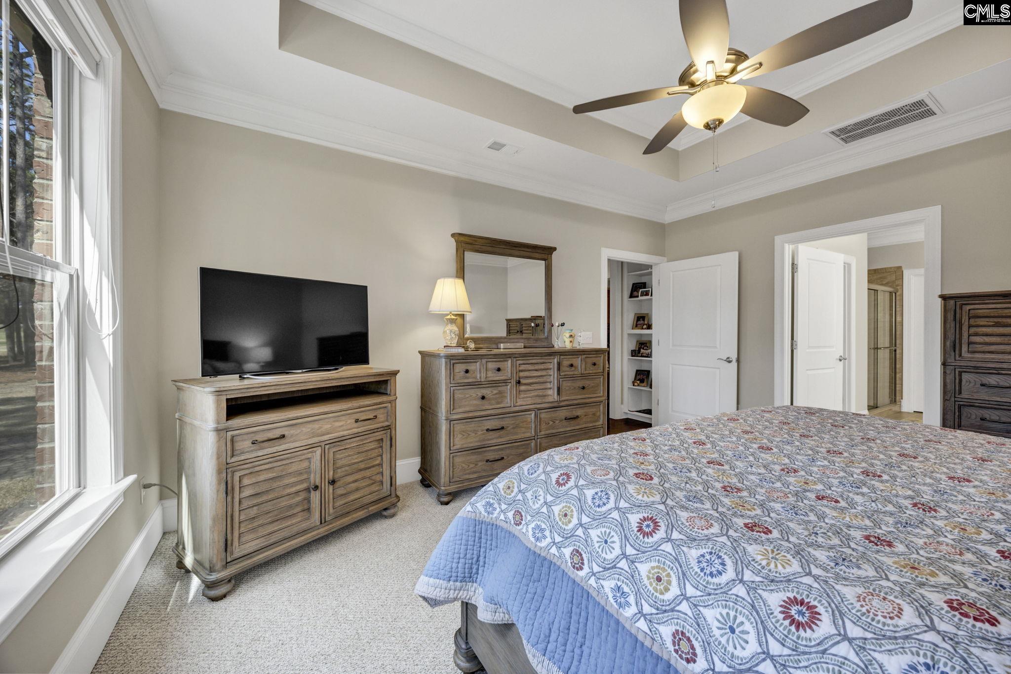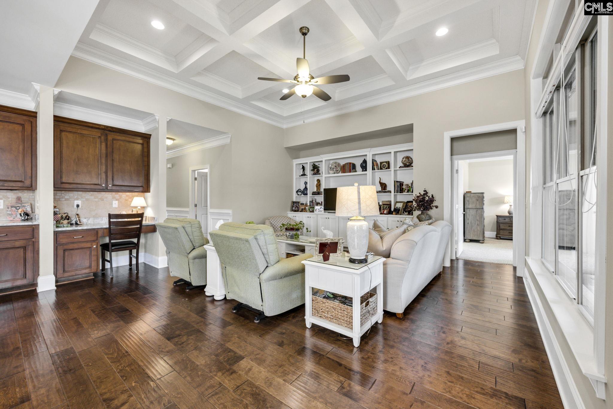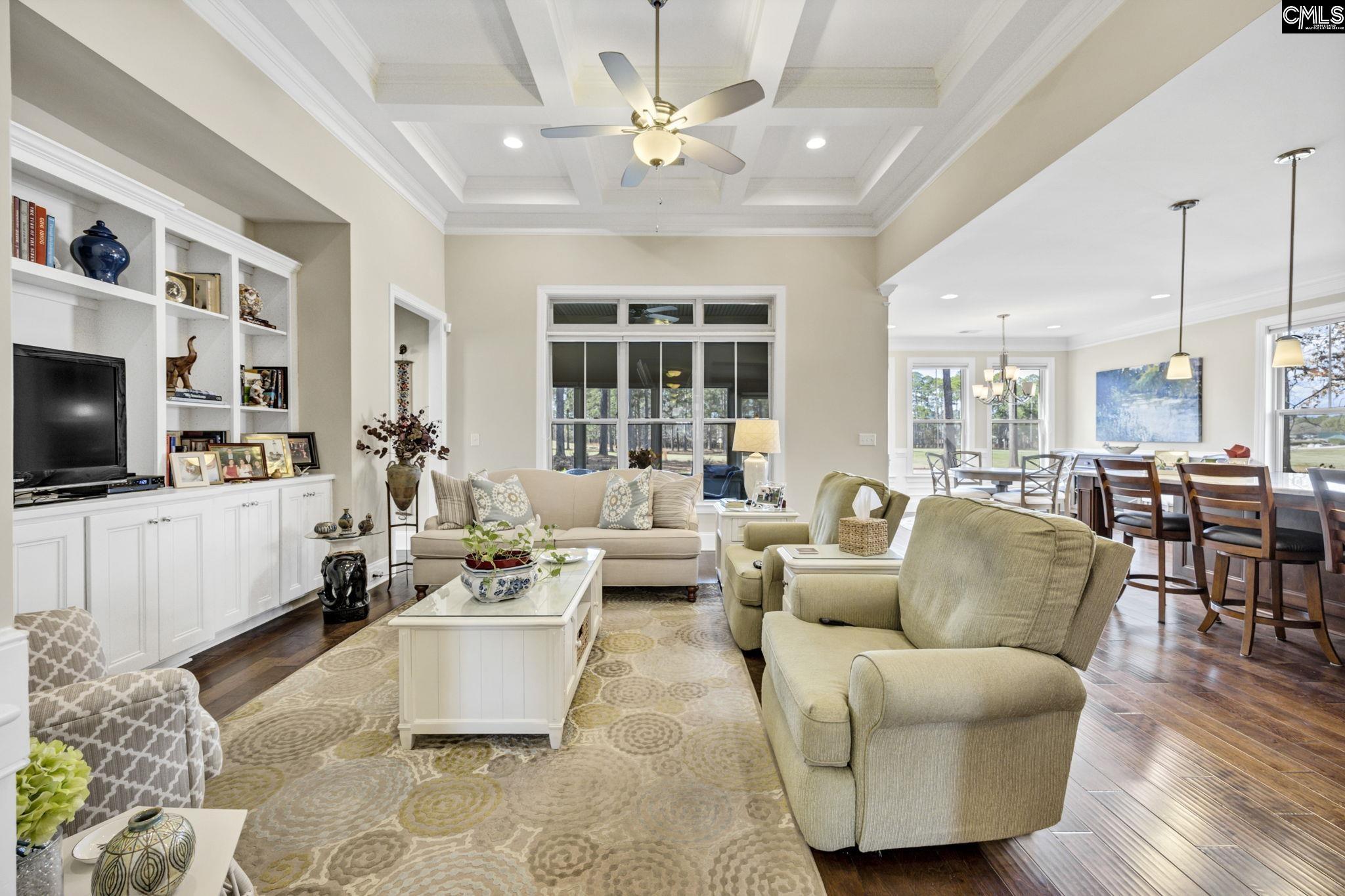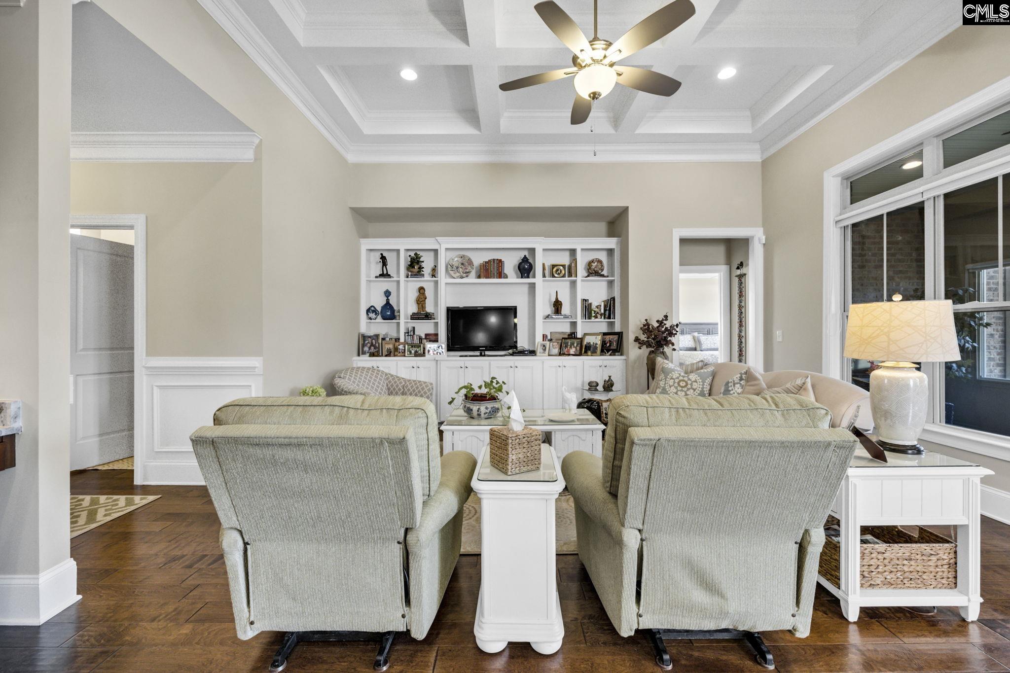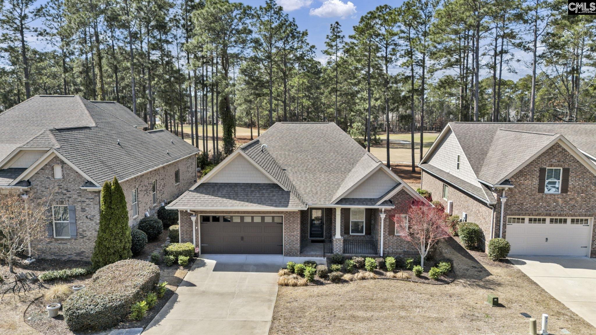 Imagine enjoying golf course views from your glass-enclosed porch while someone else handles the yardwork—this beautiful home in the gated Villas of woodcreek Farms makes it possible. Step inside to a welcoming foyer featuring hardwood floors and detailed wall moldings that set the tone for the craftsmanship found throughout. The open-concept design creates a seamless flow between the living and kitchen areas, making everyday living and entertaining effortless. The living room is warm and inviting with custom built-in bookcases and a striking coffered ceiling. The kitchen is truly the heart of the home, showcasing stained solid wood cabinetry, granite countertops, a gas cooktop with a stunning wood range hood, and large center island. Designed with both beauty and function in mind, the kitchen also features a walk-in pantry with wood shelving, plus two additional built-in spaces—a coffee bar and desk—providing extra storage and workspace. Just beyond the main living area, the glass-enclosed porch with stamped concrete offers the perfect place to relax year-round while overlooking your patio and backyard with peaceful views of the driving range at Woodcreek Golf Club. The primary suite is a true retreat, complete with a tray ceiling and a spa-like bathroom featuring a fully tiled shower, expansive double vanity, and an oversized walk-in closet. Two additional bedrooms are generously sized and share a well-appointed full bath—one with direct access—while a thoughtfully placed half bath provides added convenience and privacy for guests. Enjoy easy, low-maintenance living in one of the Midlands’ most sought-after golf course communities, with beautiful surroundings and a home designed for both comfort and style. Disclaimer: CMLS has not reviewed and, therefore, does not endorse vendors who may appear in listings.