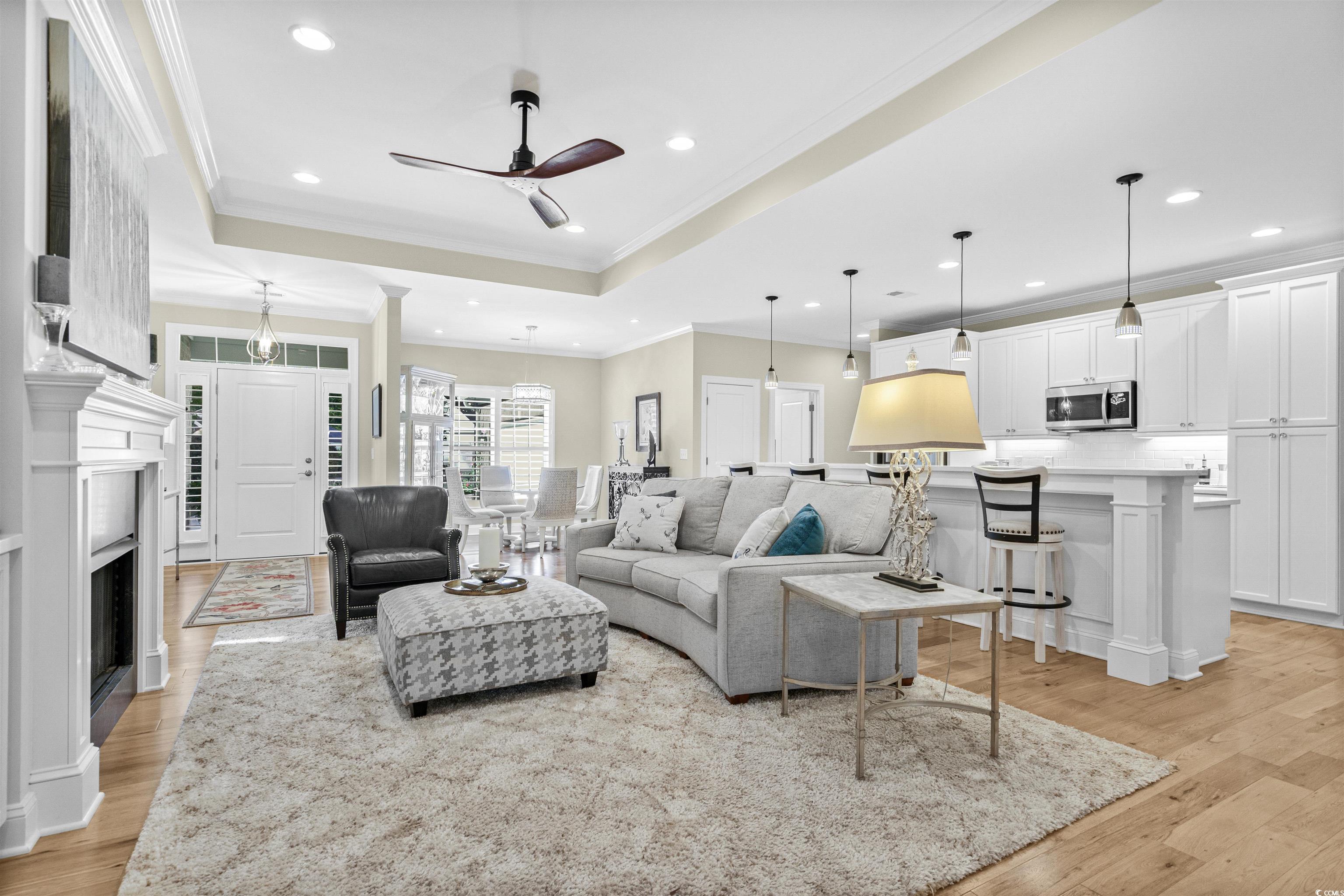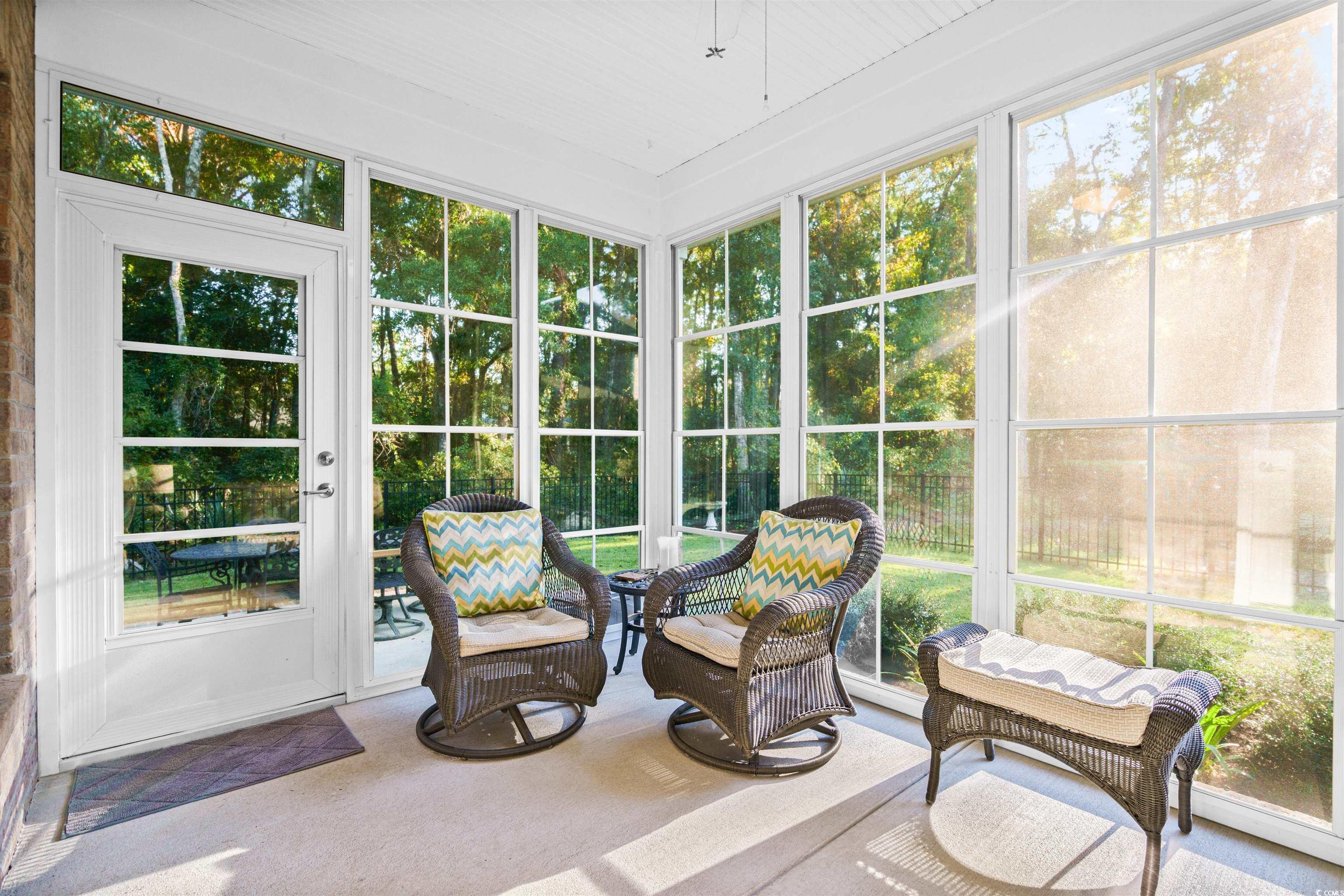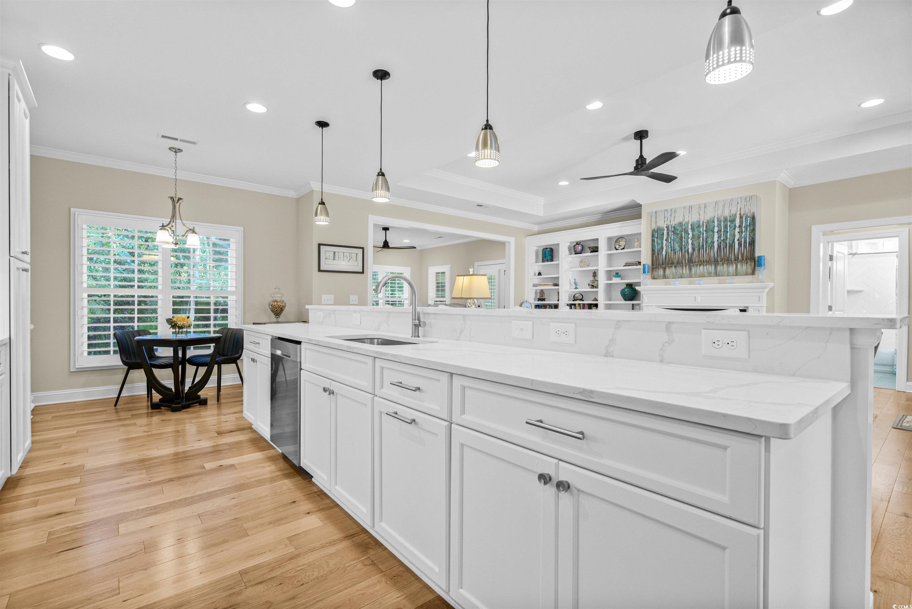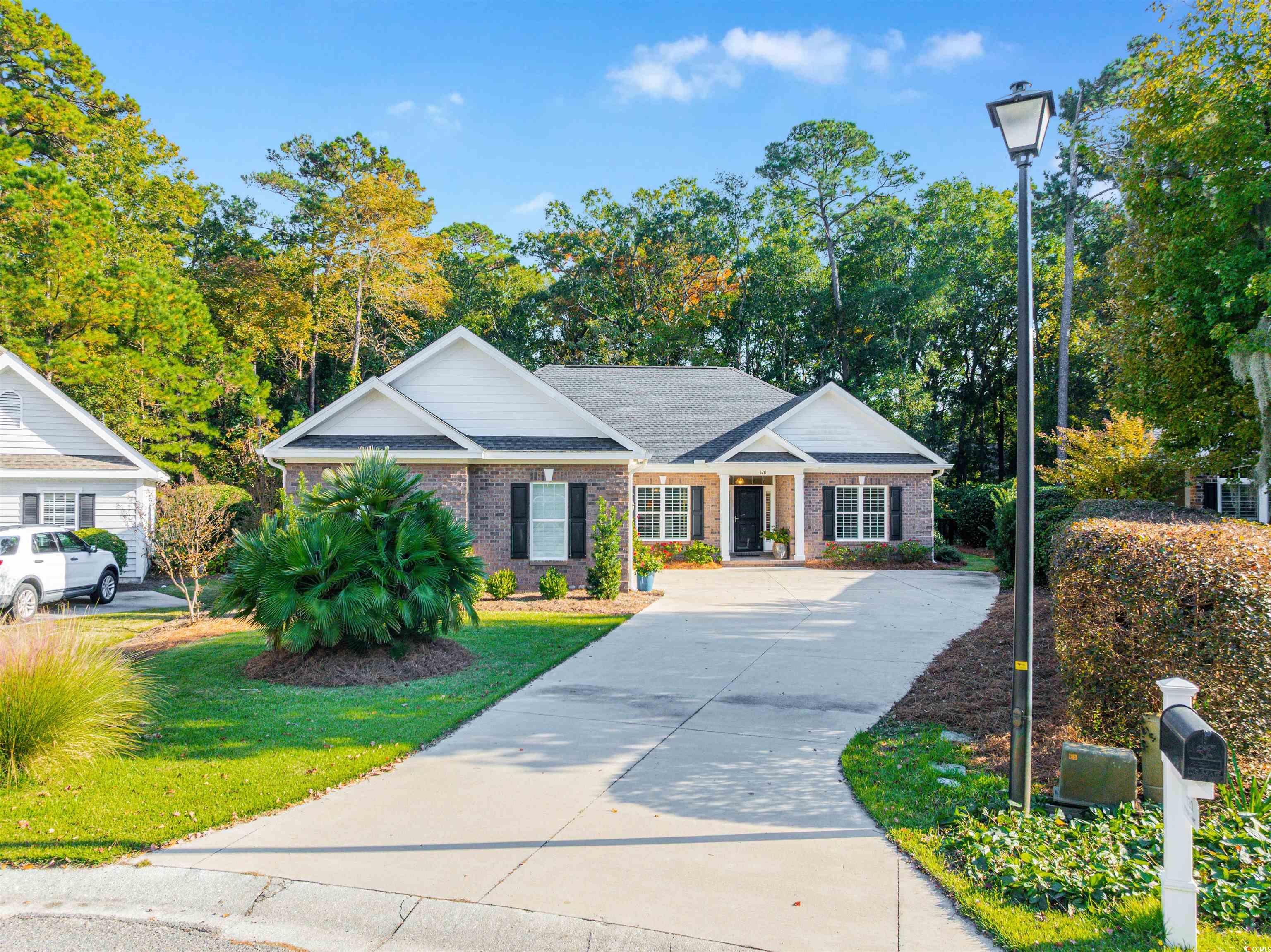 Welcome to this stunning all-brick home tucked away on a quiet cul-de-sac in the desirable gated community of Pawleys Plantation. This immaculate residence offers timeless elegance, an open floor plan, and peaceful wooded views for the perfect Lowcountry lifestyle. As you enter through the glass storm door, you're greeted by beautiful oak floors that flow seamlessly throughout the main living areas. The spacious living room features a tray ceiling with crown molding, a cozy gas-log fireplace framed by a white mantel, built-in shelving with cabinetry, and recessed lighting, creating a warm and inviting space for entertaining or relaxing. The kitchen is a chef's delight, showcasing quartz countertops, a large center island, subway tile backsplash, white custom soft-close cabinetry, stainless steel Samsung appliances, and pendant lighting over the breakfast bar. Two pantry areas- one with convenient pull-out drawers- providing exceptional storage. A sunny breakfast nook and dining room area completes this perfect gathering space. The master suite is a peaceful retreat, featuring a tray ceiling, plantation shutters, crown molding, and a spacious walk-in closet with custom built-ins. The en-suite bath offers double sink quartz-topped vanity, a jetted soaking tub, transom window for natural lighting, a decorative tile walk-in shower, and tile flooring. Both guest bedrooms include double-door closets with extra shelving and ceiling fans, with a full guest bath conveniently located between them. The guest bath features quartz countertops, a tile floor, a tub/shower combination, and a transom window for added light. Enjoy year-round living and entertaining in the Carolina Room or on the screened porch equipped with a four-track system that allows for comfort in any season. Additional highlights include a two-car garage with pull-down attic storage, and a private fenced backyard. This gorgeous home offers the perfect blend of quality craftsmanship, modern updates, and Lowcountry charm- truly a beautiful place to call home.