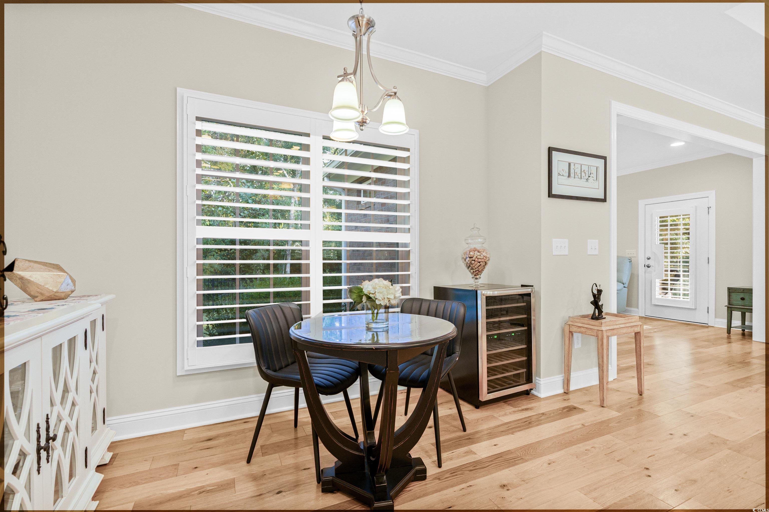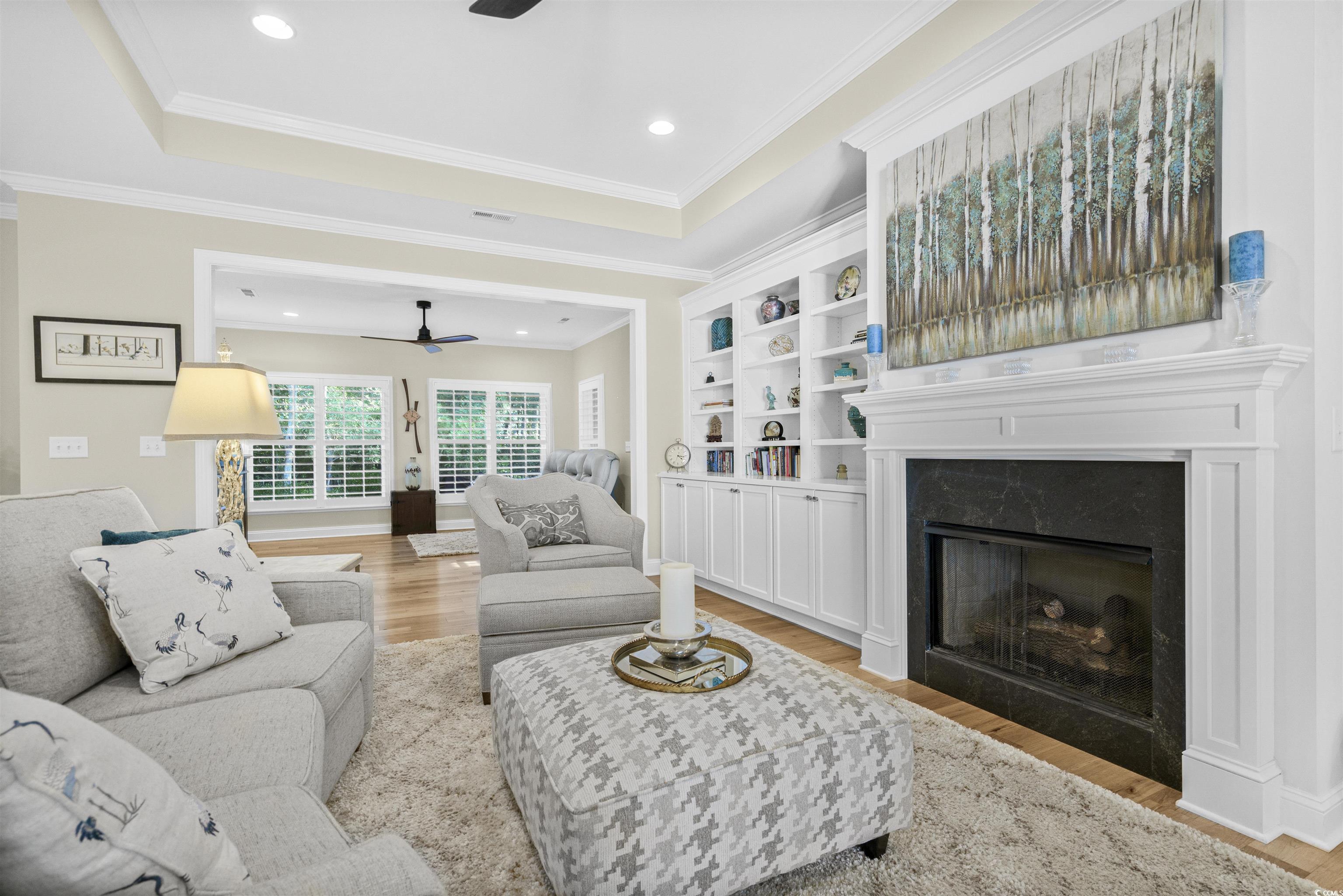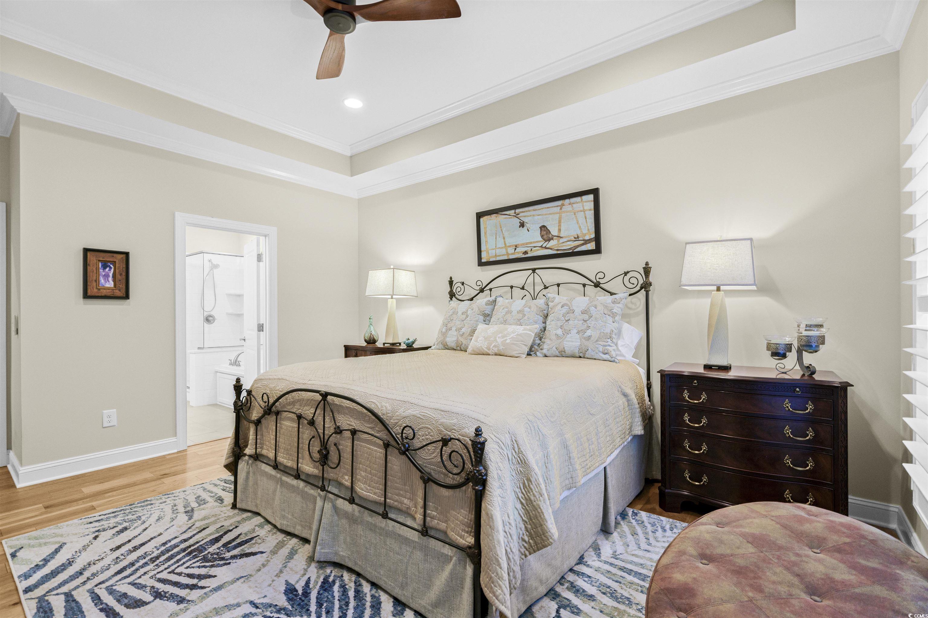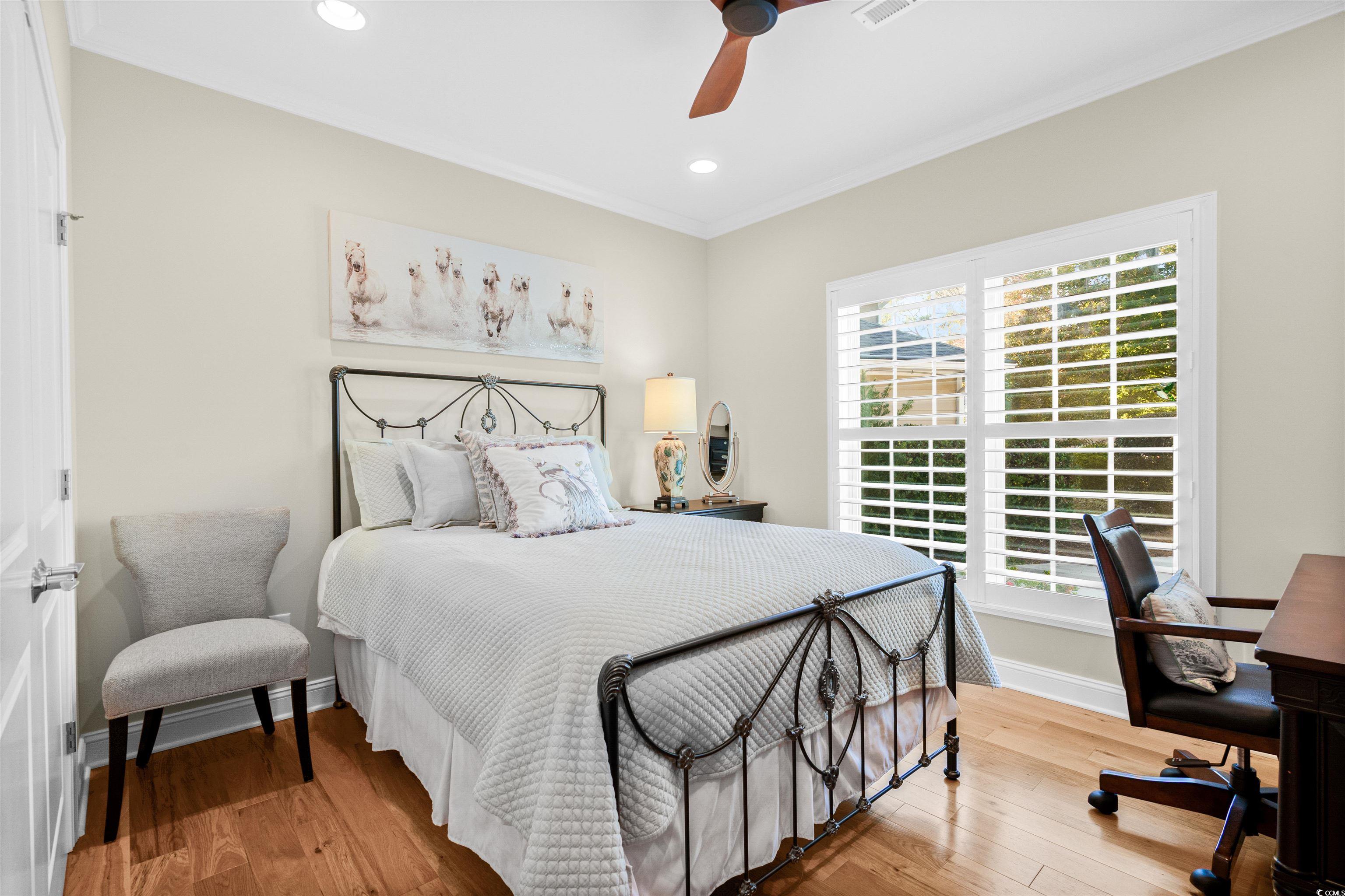 Welcome to this stunning all-brick home tucked away on a quiet cul-de-sac in the desirable gated community of Pawleys Plantation. This immaculate residence offers timeless elegance, an open floor plan, and peaceful wooded views for the perfect Lowcountry lifestyle. As you enter through the glass storm door, you're greeted by beautiful oak floors that flow seamlessly throughout the main living areas. The spacious living room features a tray ceiling with crown molding, a cozy gas-log fireplace framed by a white mantel, built-in shelving with cabinetry, and recessed lighting, creating a warm and inviting space for entertaining or relaxing. The kitchen is a chef's delight, showcasing quartz countertops, a large center island, subway tile backsplash, white custom soft-close cabinetry, stainless steel Samsung appliances, and pendant lighting over the breakfast bar. Two pantry areas- one with convenient pull-out drawers- providing exceptional storage. A sunny breakfast nook and dining room area completes this perfect gathering space. The master suite is a peaceful retreat, featuring a tray ceiling, plantation shutters, crown molding, and a spacious walk-in closet with custom built-ins. The en-suite bath offers double sink quartz-topped vanity, a jetted soaking tub, transom window for natural lighting, a decorative tile walk-in shower, and tile flooring. Both guest bedrooms include double-door closets with extra shelving and ceiling fans, with a full guest bath conveniently located between them. The guest bath features quartz countertops, a tile floor, a tub/shower combination, and a transom window for added light. Enjoy year-round living and entertaining in the Carolina Room or on the screened porch equipped with a four-track system that allows for comfort in any season. Additional highlights include a two-car garage with pull-down attic storage, and a private fenced backyard. This gorgeous home offers the perfect blend of quality craftsmanship, modern updates, and Lowcountry charm- truly a beautiful place to call home.