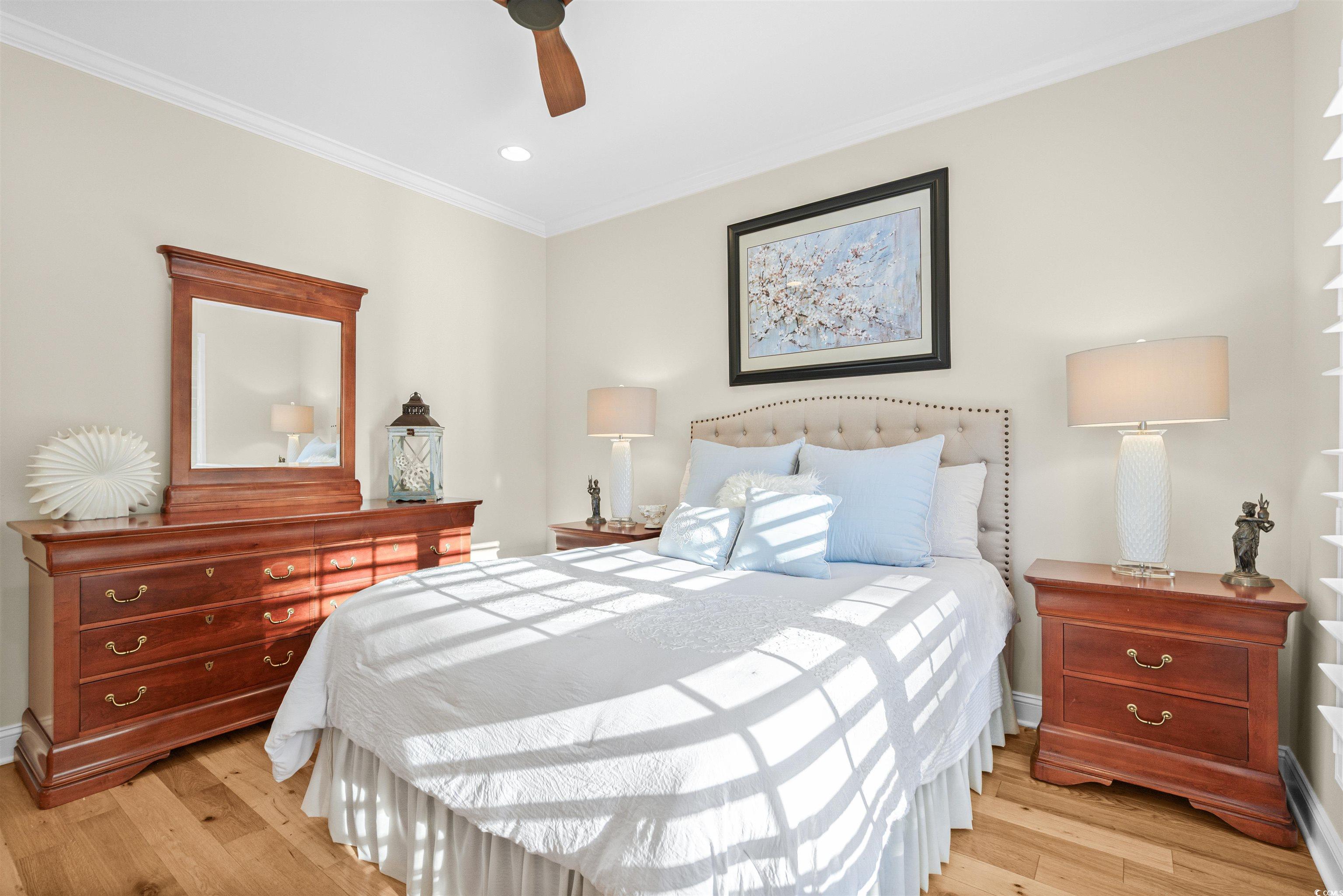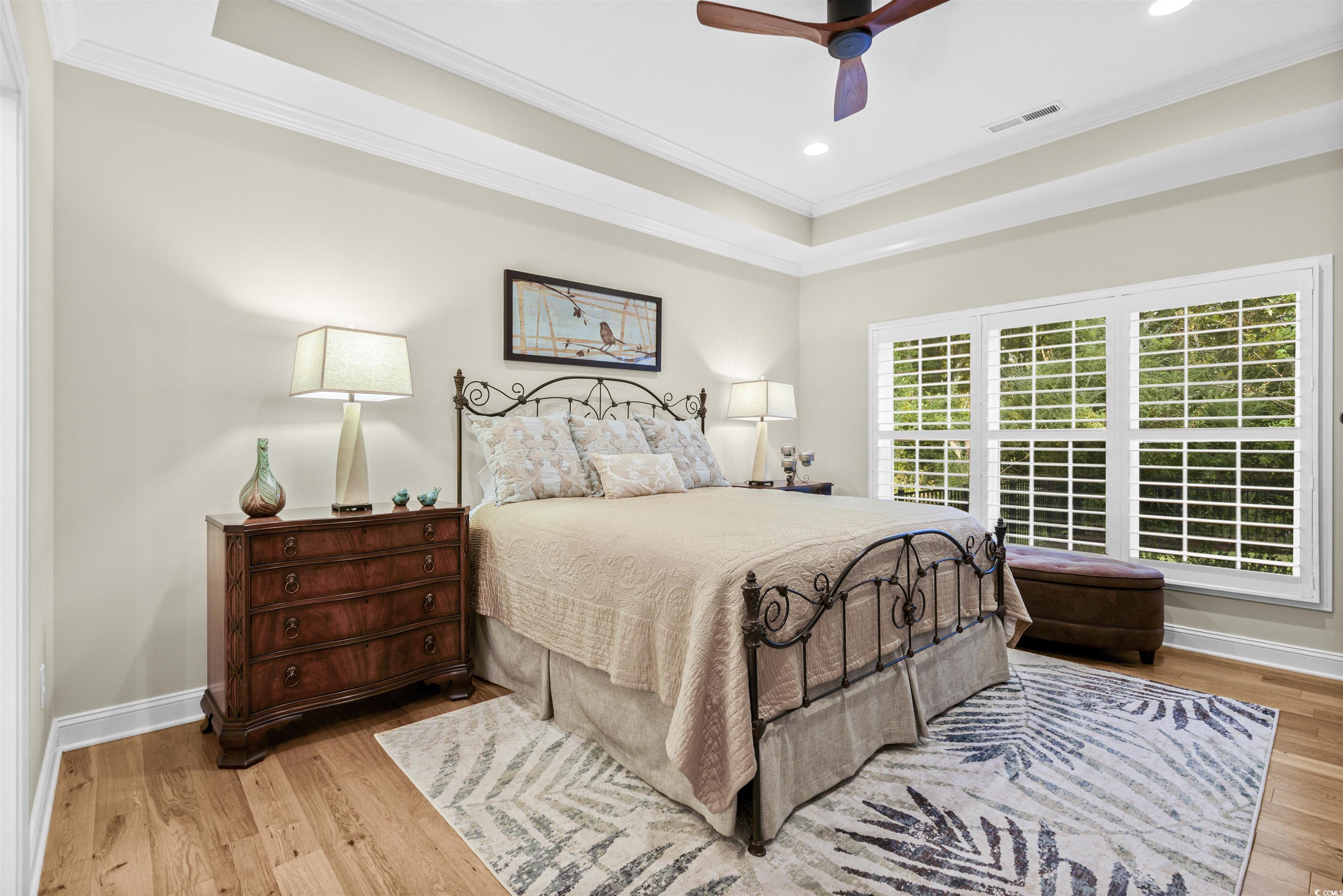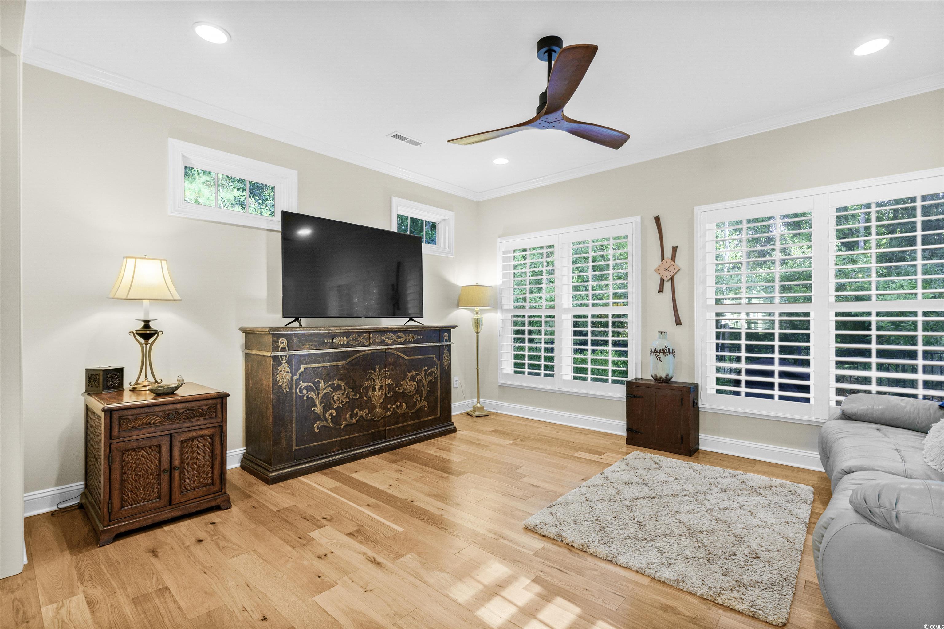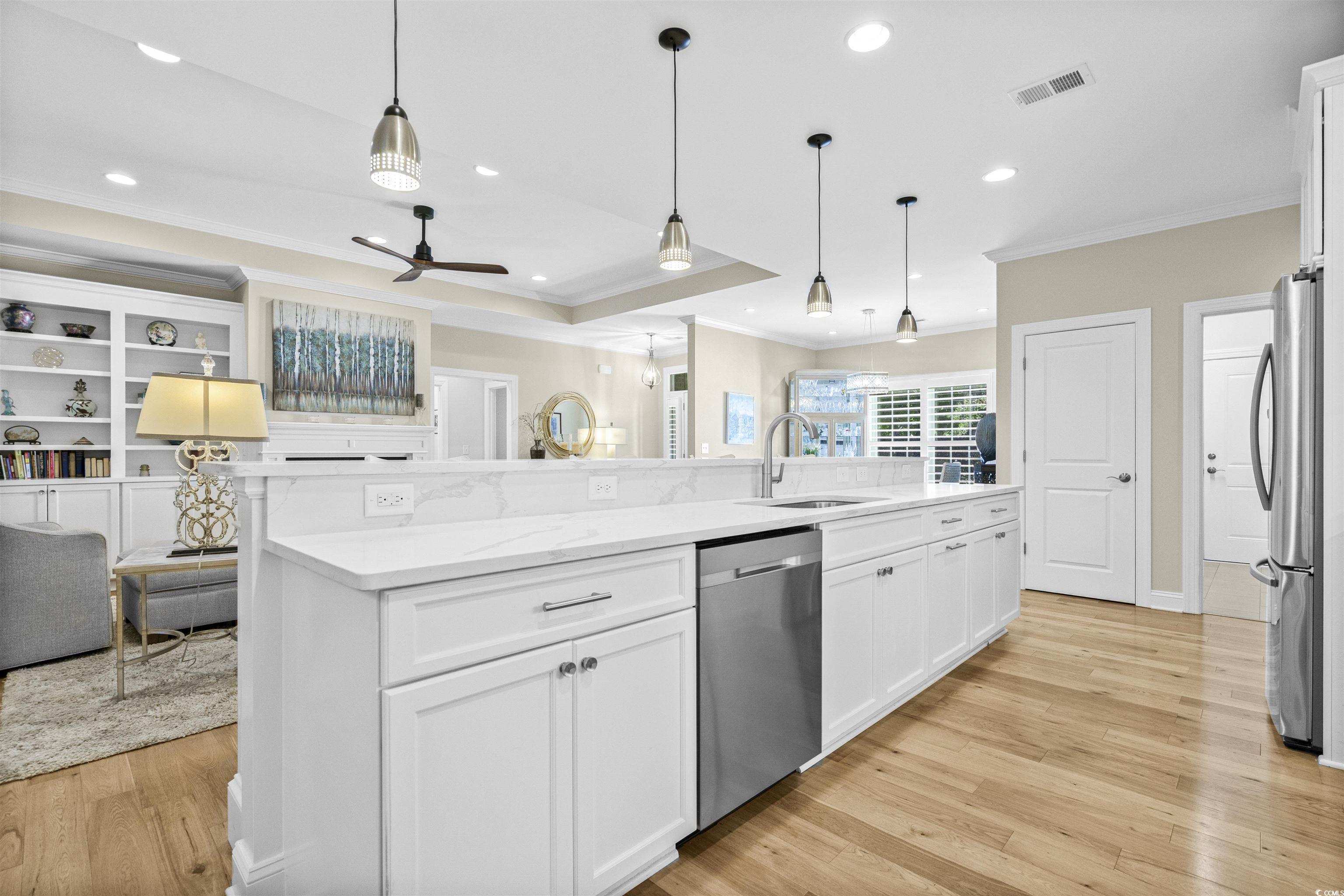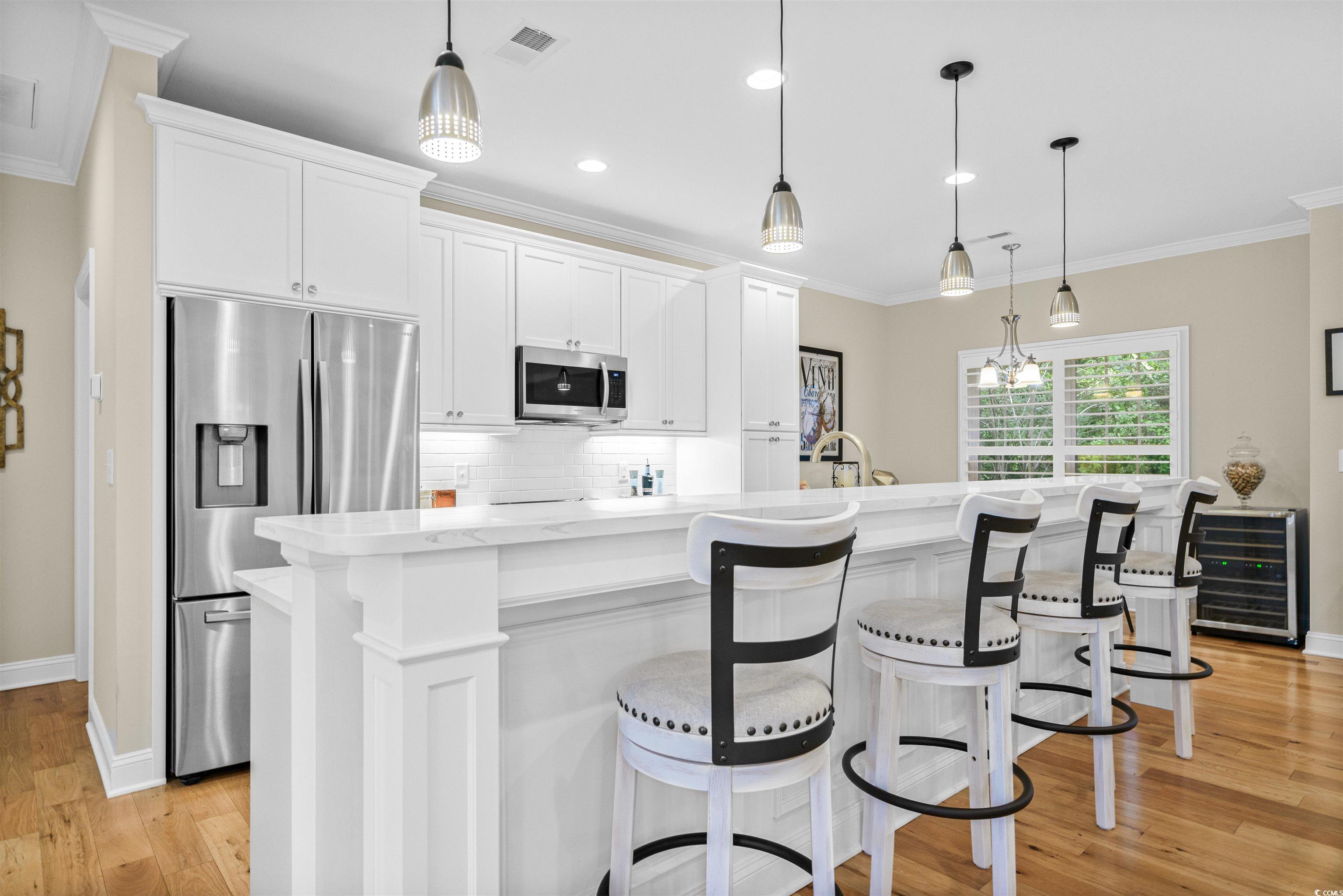 Welcome to this stunning all-brick home tucked away on a quiet cul-de-sac in the desirable gated community of Pawleys Plantation. This immaculate residence offers timeless elegance, an open floor plan, and peaceful wooded views for the perfect Lowcountry lifestyle. As you enter through the glass storm door, you're greeted by beautiful oak floors that flow seamlessly throughout the main living areas. The spacious living room features a tray ceiling with crown molding, a cozy gas-log fireplace framed by a white mantel, built-in shelving with cabinetry, and recessed lighting, creating a warm and inviting space for entertaining or relaxing. The kitchen is a chef's delight, showcasing quartz countertops, a large center island, subway tile backsplash, white custom soft-close cabinetry, stainless steel Samsung appliances, and pendant lighting over the breakfast bar. Two pantry areas- one with convenient pull-out drawers- providing exceptional storage. A sunny breakfast nook and dining room area completes this perfect gathering space. The master suite is a peaceful retreat, featuring a tray ceiling, plantation shutters, crown molding, and a spacious walk-in closet with custom built-ins. The en-suite bath offers double sink quartz-topped vanity, a jetted soaking tub, transom window for natural lighting, a decorative tile walk-in shower, and tile flooring. Both guest bedrooms include double-door closets with extra shelving and ceiling fans, with a full guest bath conveniently located between them. The guest bath features quartz countertops, a tile floor, a tub/shower combination, and a transom window for added light. Enjoy year-round living and entertaining in the Carolina Room or on the screened porch equipped with a four-track system that allows for comfort in any season. Additional highlights include a two-car garage with pull-down attic storage, and a private fenced backyard. This gorgeous home offers the perfect blend of quality craftsmanship, modern updates, and Lowcountry charm- truly a beautiful place to call home.
