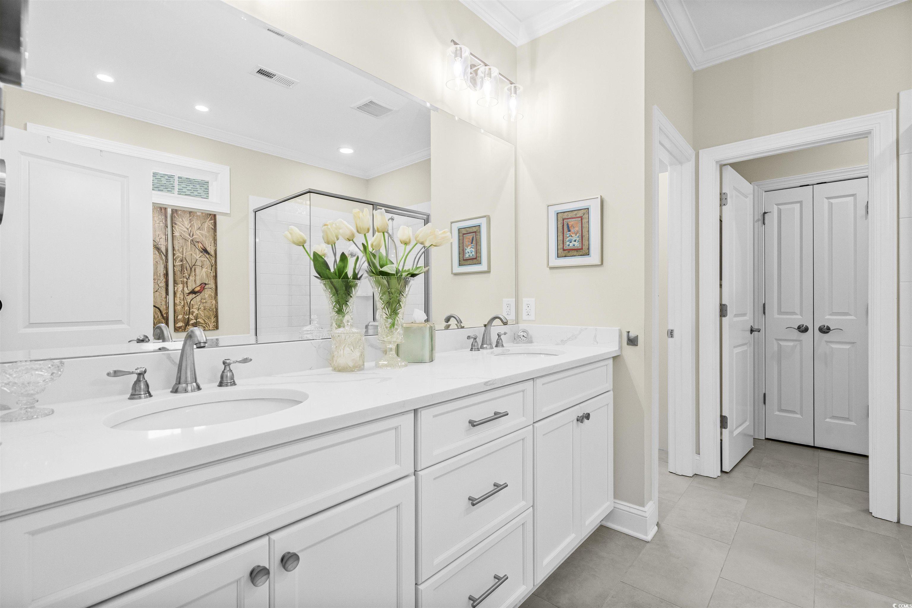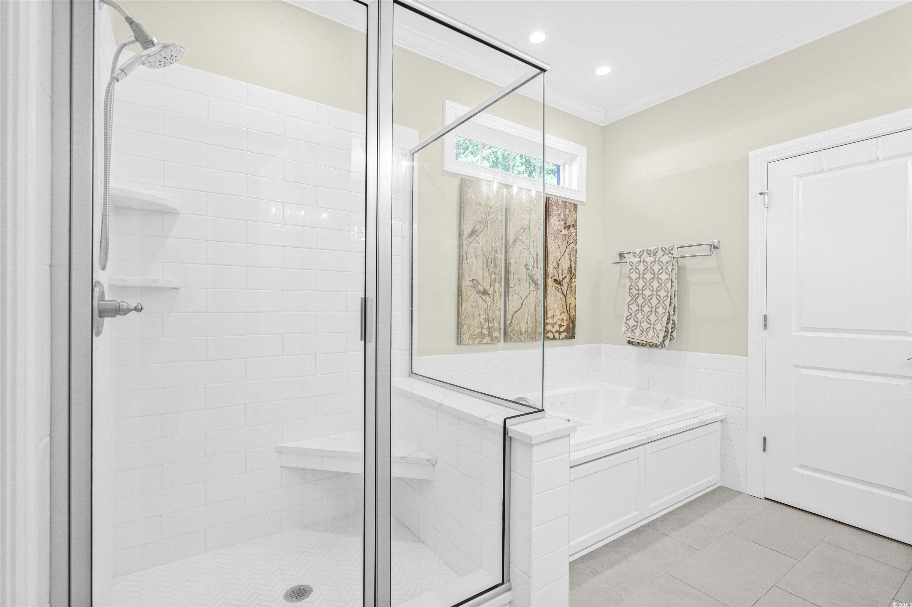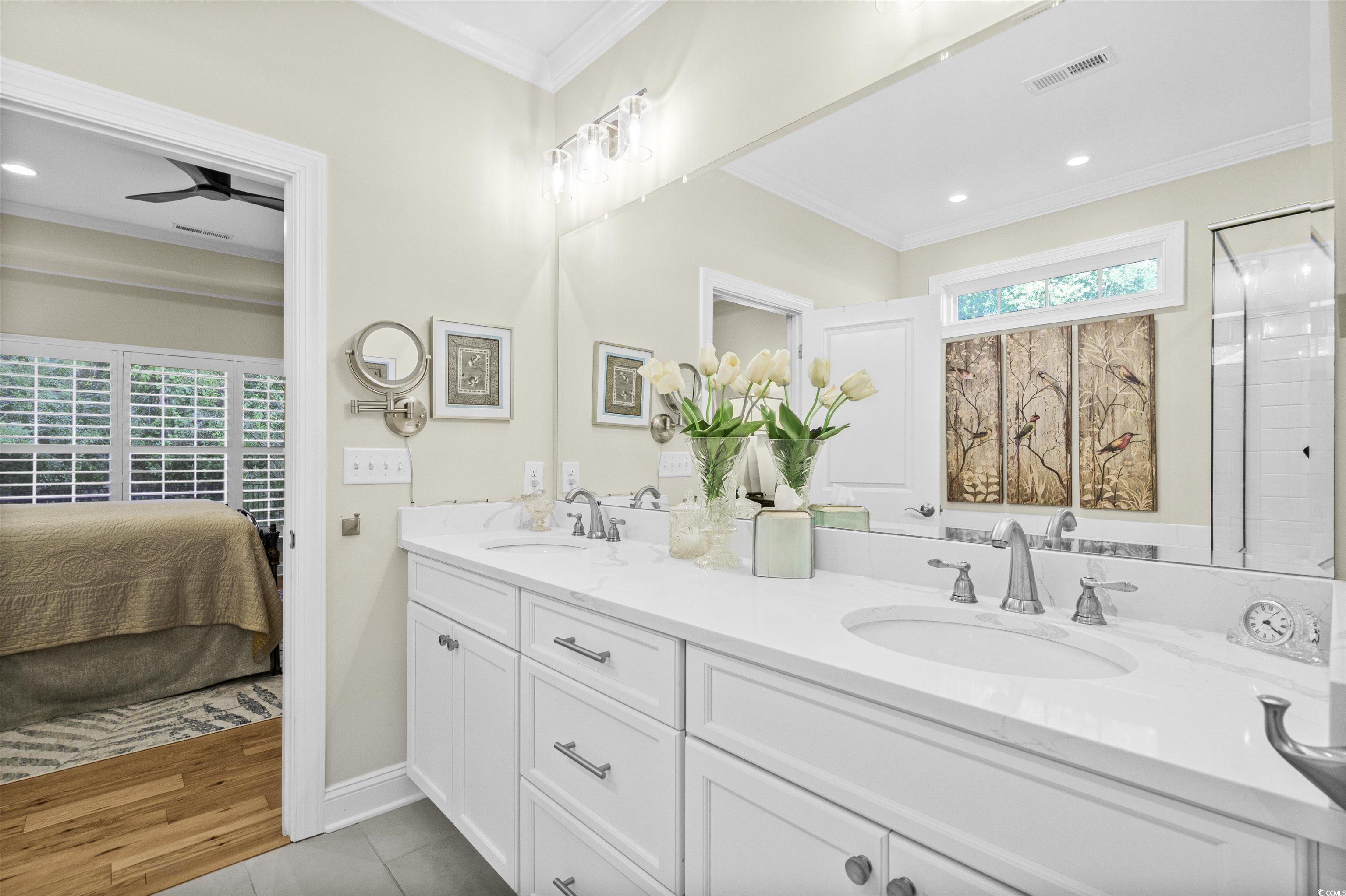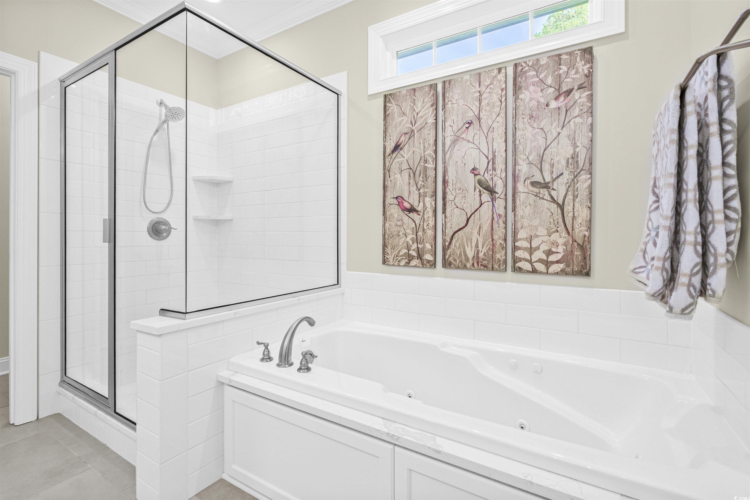Welcome to this stunning all-brick home tucked away on a quiet cul-de-sac in the desirable gated community of Pawleys Plantation. This immaculate residence offers timeless elegance, an open floor plan, and peaceful wooded views for the perfect Lowcountry lifestyle. As you enter through the glass storm door, you're greeted by beautiful oak floors that flow seamlessly throughout the main living areas. The spacious living room features a tray ceiling with crown molding, a cozy gas-log fireplace framed by a white mantel, built-in shelving with cabinetry, and recessed lighting, creating a warm and inviting space for entertaining or relaxing. The kitchen is a chef's delight, showcasing quartz countertops, a large center island, subway tile backsplash, white custom soft-close cabinetry, stainless steel Samsung appliances, and pendant lighting over the breakfast bar. Two pantry areas- one with convenient pull-out drawers- providing exceptional storage. A sunny breakfast nook and dining room area completes this perfect gathering space. The master suite is a peaceful retreat, featuring a tray ceiling, plantation shutters, crown molding, and a spacious walk-in closet with custom built-ins. The en-suite bath offers double sink quartz-topped vanity, a jetted soaking tub, transom window for natural lighting, a decorative tile walk-in shower, and tile flooring. Both guest bedrooms include double-door closets with extra shelving and ceiling fans, with a full guest bath conveniently located between them. The guest bath features quartz countertops, a tile floor, a tub/shower combination, and a transom window for added light. Enjoy year-round living and entertaining in the Carolina Room or on the screened porch equipped with a four-track system that allows for comfort in any season. Additional highlights include a two-car garage with pull-down attic storage, and a private fenced backyard. This gorgeous home offers the perfect blend of quality craftsmanship, modern updates, and Lowcountry charm- truly a beautiful place to call home.
