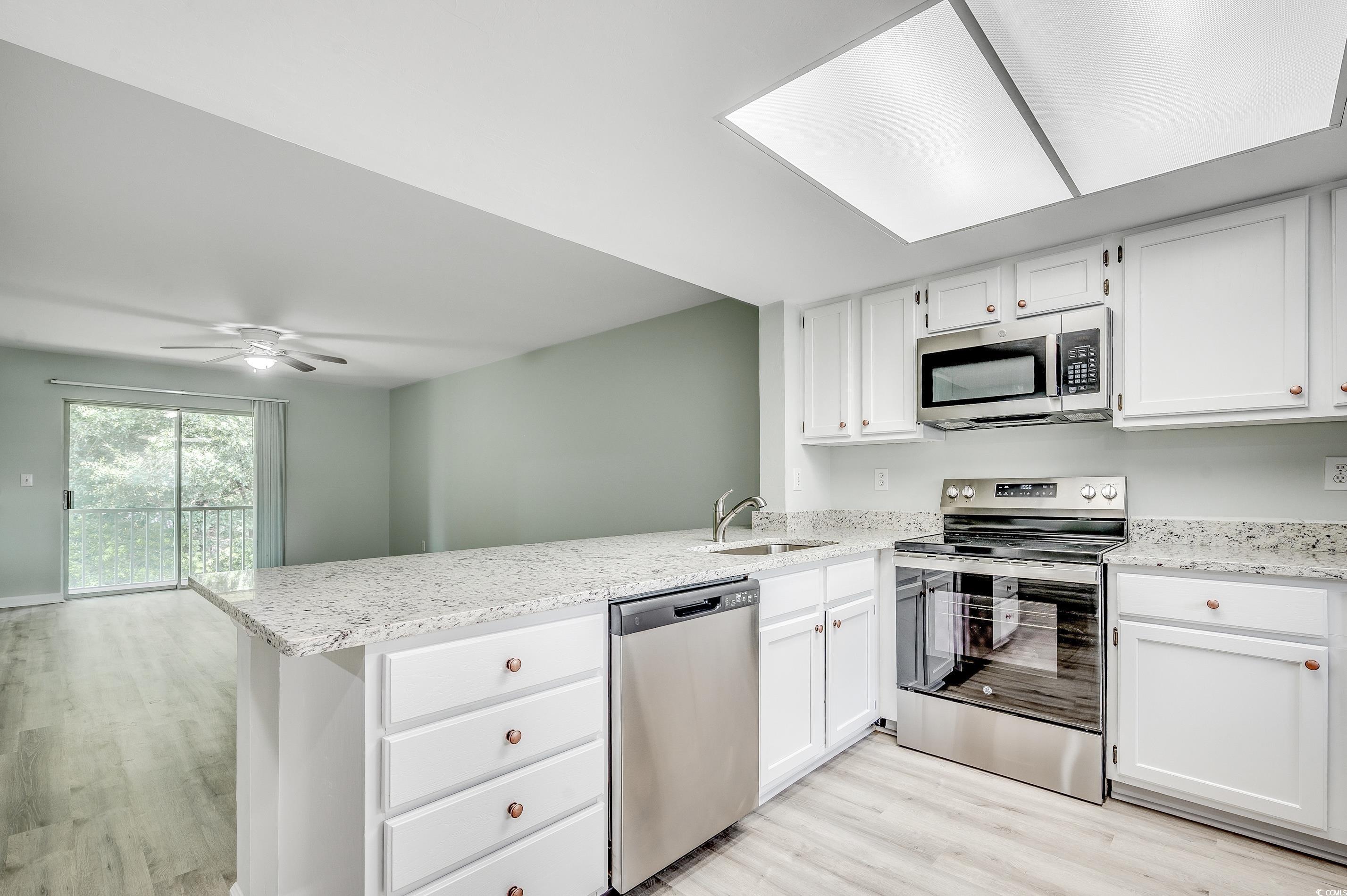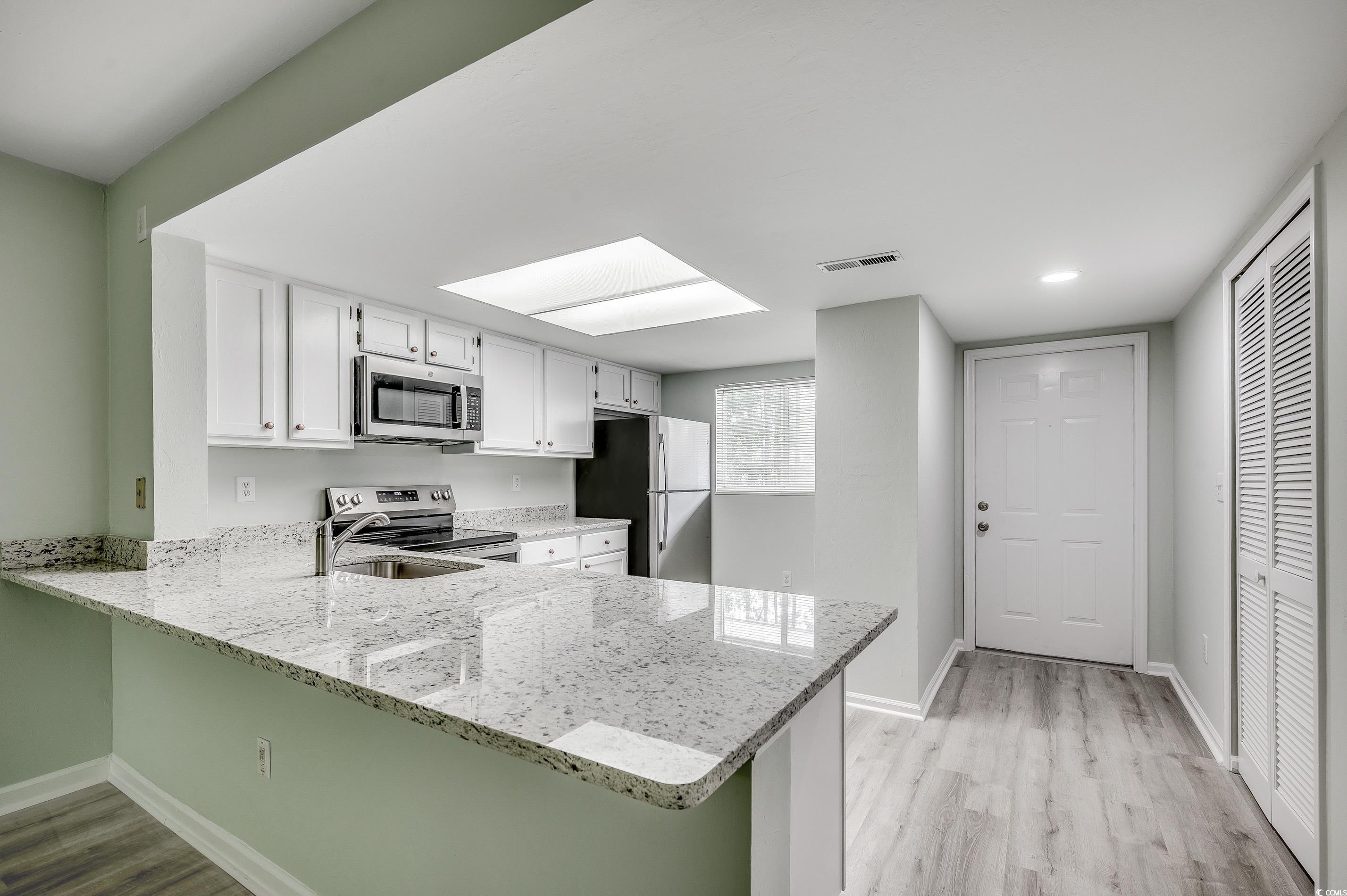 We have received multiple offers. Please submit your highest and best by 5pm on 8/11/2025. Come ride your golf cart to Surfside Beach from this move-in-ready condo located in Tradewinds II. When you arrive at this lovely unit, you will notice a sitting area in the front. As you enter through the foyer, you will see an open concept with a split floor plan. This wonderful condo has been recently remodeled and freshly painted. Luxury vinyl plank flooring has been installed throughout, new stainless steel appliances were added, and granite countertops were put in. The kitchen has a farmhouse-style sink, a pantry, and a long bar where you can enjoy all those culinary delights. The owner's suite has a view of the trees, a massive walk-in closet, and an attached bath with a nice shower. Stylish vanities have been added in both bathrooms. The laundry room is huge and the washer / dryer will be included. This unit is on the top floor which means that you don't have to worry about noisy neighbors from above or anyone else's plumbing leaking down into your unit. This beautiful condo has a screened-in porch overlooking the trees which provides the perfect amount of privacy. The current owners are offering a home warranty for extra peace of mind. This community has a big parking lot and a resort-style pool with lots of palm trees. The hoa fees are super low and water, sewer, trash pickup, landscaping, exterior security cameras, insurance, cable, internet, and pest control are included. Owners can have one pet and motorcycles are allowed. It's time to come sit back, relax, and enjoy the easy life! There are lots of delicious restaurants around here, bars with live music, and several top-notch golf courses to play. The Murrells Inlet Marshwalk is nearby along with Market Common and Garden City Beach. This is the one that you have been waiting for! It could be the perfect primary residence or second home. Schedule your showing today, and don't forget to check out the virtual tour! Some photos in this listing have been virtually staged.