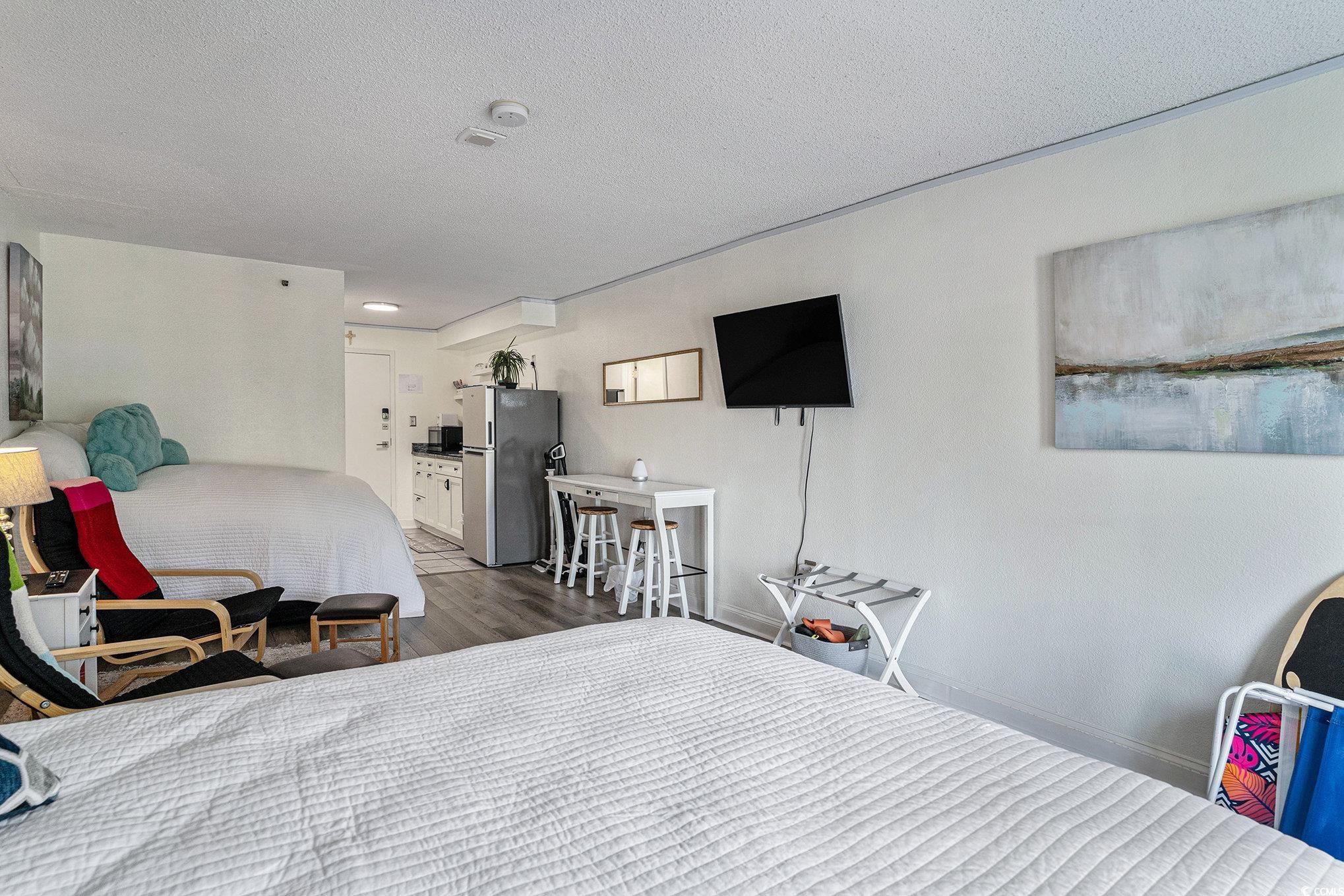 Fully renovated and turnkey ocean-view condo in a Myrtle Beach oceanfront building—ideal as a personal beach retreat, live-in or an investment opportunity. Located just steps from the Atlantic Ocean, this unit offers sweeping views and the convenience of being within walking distance to beach access. This condo was completely remodeled in 2022, with granite countertops and brand-new solid wood cabinets with soft-close doors and drawers in both the kitchen and bathroom. The modern kitchen also includes a 3-in-1 appliance that functions as a microwave, air fryer, and convection oven—perfect for guests or owners who love convenience without sacrificing functionality. Enjoy easy upkeep with luxury vinyl plank (LVP) and tile flooring throughout. The unit is furnished with a comfortable queen bed, and a Cordaroy bean bag chair that unfolds into a king-size sleeping surface—great for accommodating extra guests. The unit comes fully stocked with extra linens, pillows, blankets, and towels, making it truly ready to rent or enjoy immediately. Smart features include a WiFi-enabled HVAC unit (installed in 2023) that can be monitored and adjusted remotely through the ThinkQ app, and a WiFi-enabled Yale smart door lock, allowing for secure remote access and control via the Yale app. A self-draining dehumidifier is also included for year-round indoor comfort. Wake up to stunning sunrises over the Atlantic Ocean, whether you’re relaxing inside or enjoying your private balcony. This property offers flexibility for short-term or long-term rentals.
