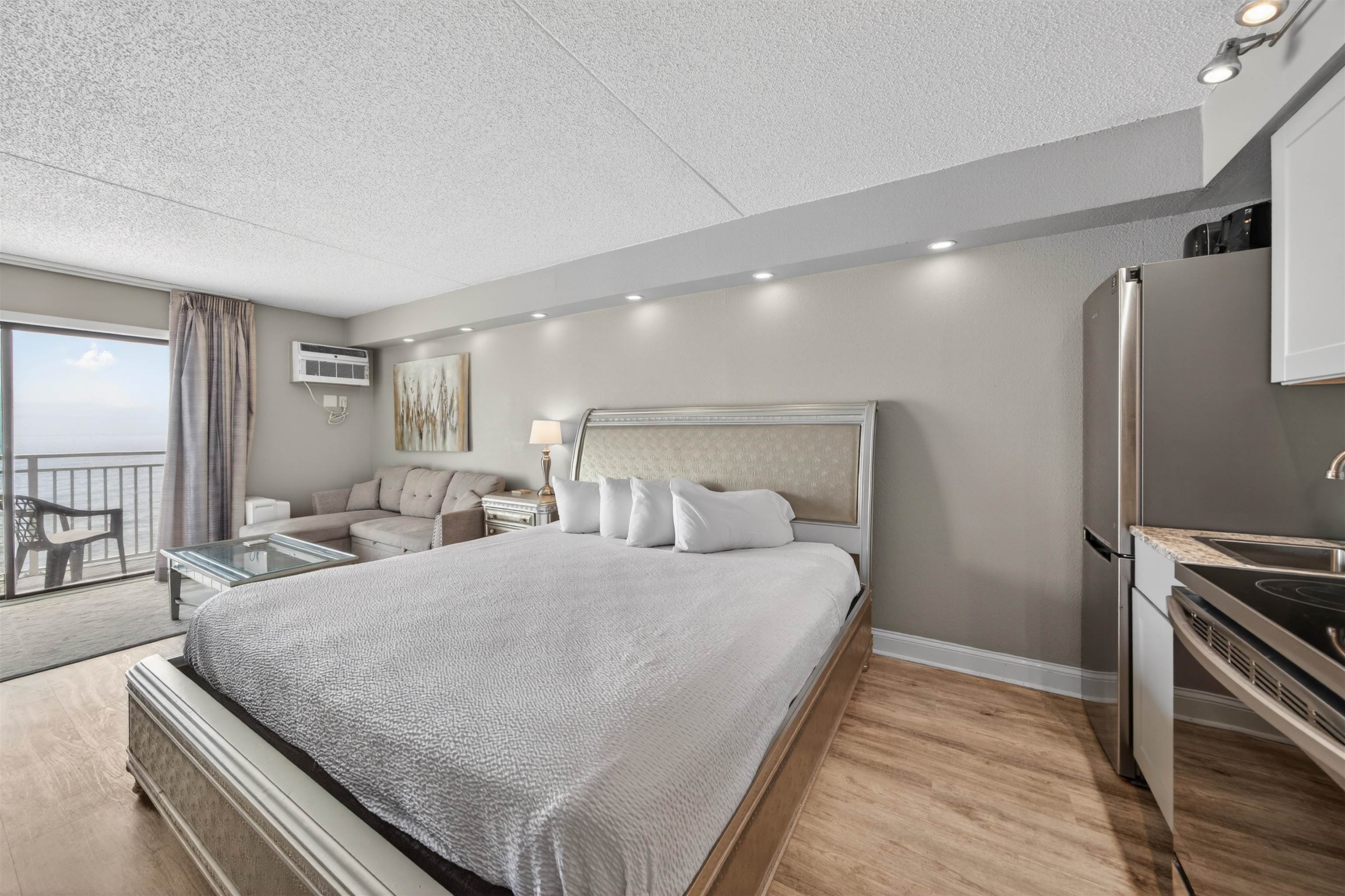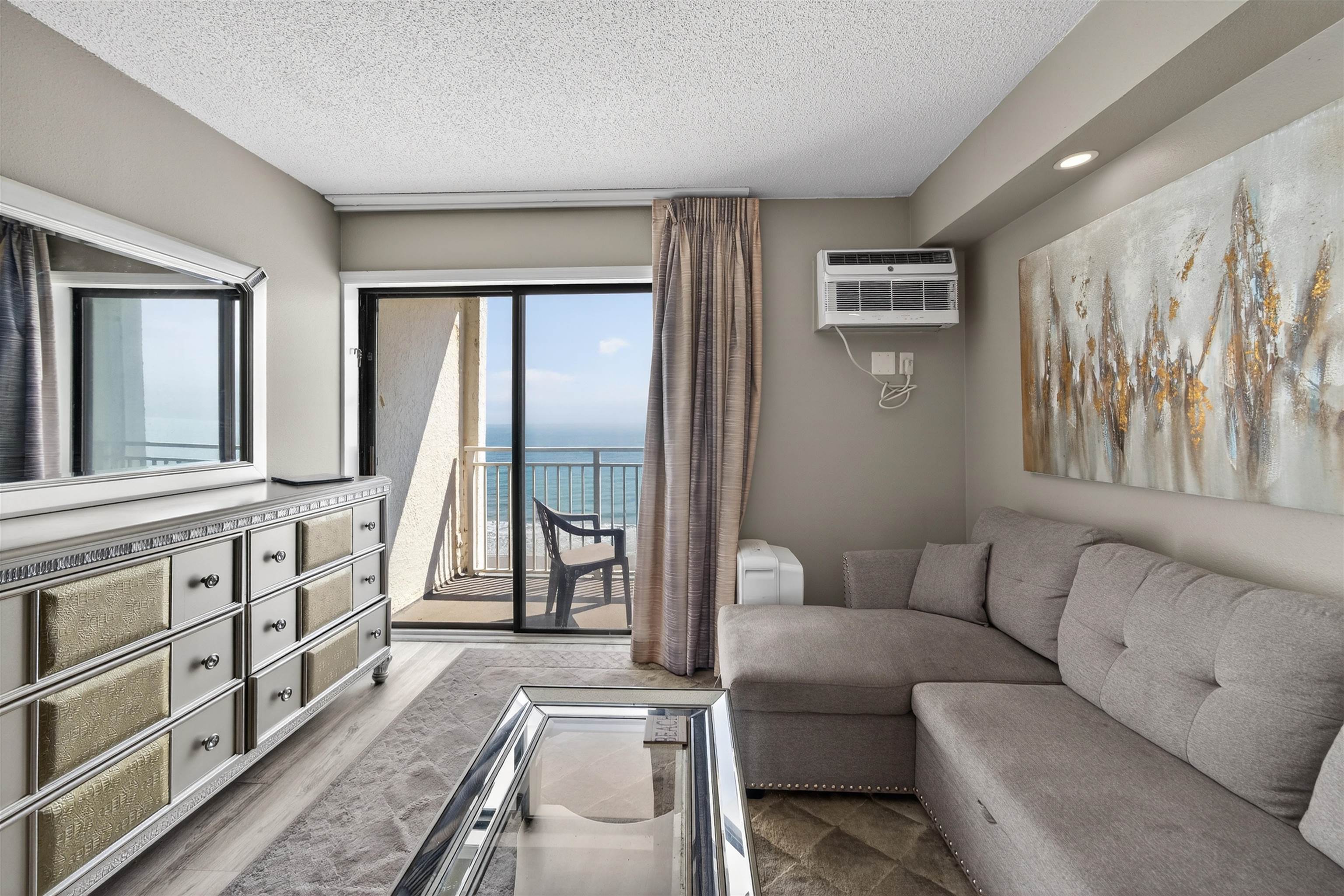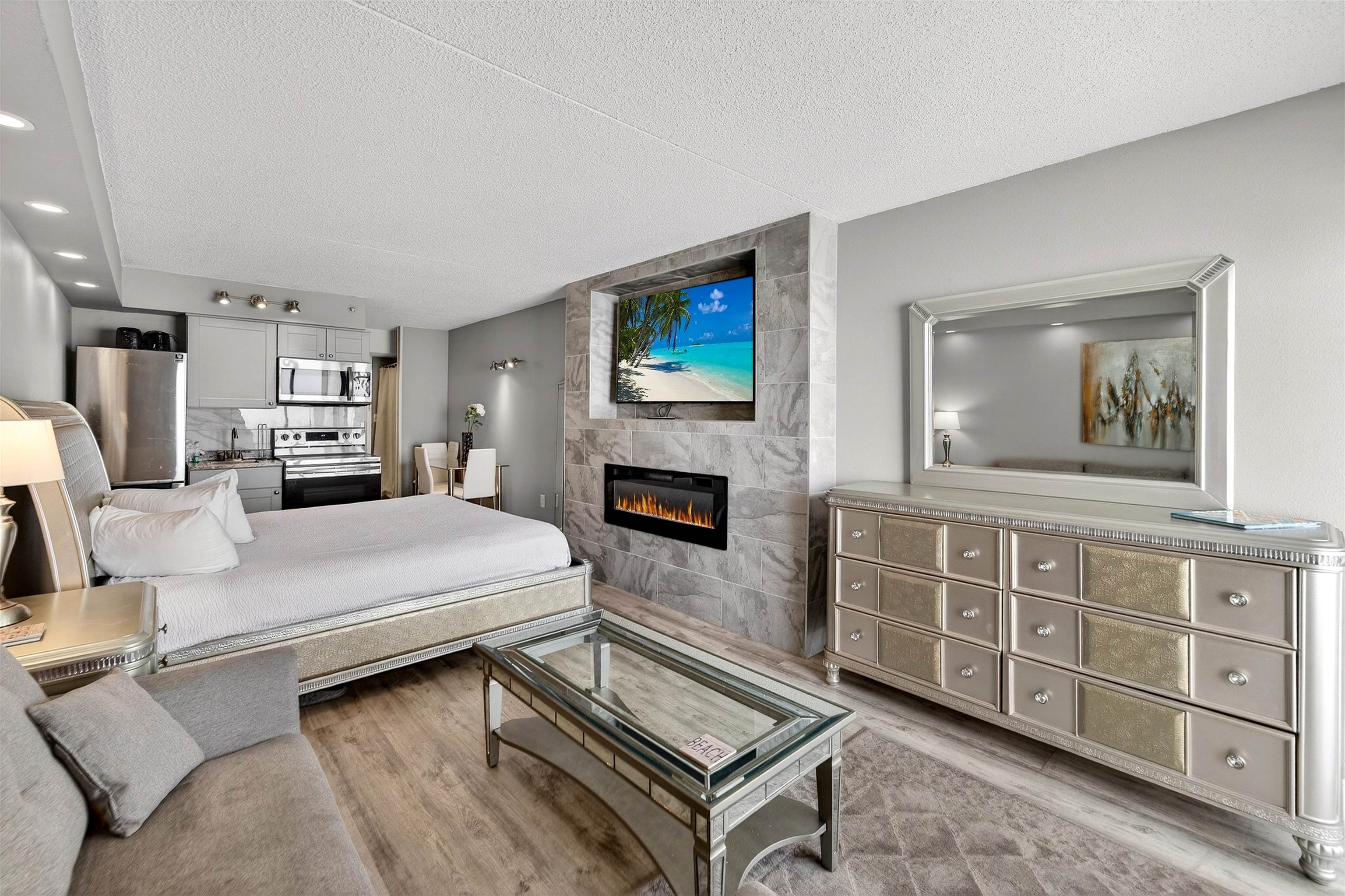 Wake up to stunning, direct oceanfront views from this fully renovated studio at Sea Mist Resort, truly one of the most beautifully updated units in the area. This complete renovation features luxury vinyl plank flooring, custom recessed lighting, updated fixtures, and upscale furnishings including a king sized bed with LED headboard and solid wood furniture. A striking focal wall offers floor to ceiling porcelain tile and a built in electric fireplace, creating a warm and modern coastal feel. The updated kitchen includes new cabinetry, stainless steel full size appliances, a porcelain tile backsplash, and dining space for four. The spa style bathroom features a custom walk in shower with Italian porcelain tile and classic hexagon flooring. Relax on your private balcony and enjoy unobstructed ocean views. Perfect as a personal beach getaway or a high performing short term rental. Conveniently located close to the shopping, dining, entertainment, and attractions that make Myrtle Beach such a popular destination.