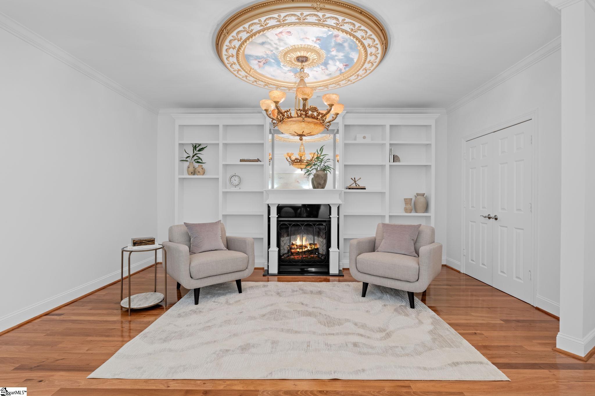 Situated at 1209 E Washington Street as a corner, upper level unit, this renovated condominium offers over 2,400 square feet of low maintenance living with gorgeous views and ample privacy overlooking the Swamp Rabbit Trail. Featuring two bedrooms and two and a half bathrooms, this home blends sophisticated finishes with thoughtful design throughout. The primary suite serves as a true sanctuary, adorned with striking marble surfaces sourced from Morocco and enhanced by elevated features such as a towel warmer and bidet, a true spa-like experience. The guest bathroom features Italian marble finishes that bring elegance to the space. Incredible details continue throughout the home, including a library or office with gorgeous built-in cabinetry and fireplace highlighted by a custom Italian-made light fixture, plush imported carpeting from Belgium in both the primary and guest bedrooms, and a refined dining area lit by a crystal chandelier from the Czech Republic. Architectural columns reclaimed from a 15th-century Tibetan chapel add a rare and historic element to the dining space, setting this residence apart. A large private terrace with fireplace feature provides the perfect setting for outdoor relaxation and entertaining. Beautiful double glass doors lead onto the covered porch which is spacious and provides ample space for outdoor dining and enjoyment. The building also offers convenient bike storage and easy access to downtown Greenville, dining, shopping, and cultural destinations. A rare opportunity to own a move-in-ready home with exceptional craftsmanship in a premier Greenville location. Schedule your chance to view this gorgeous home today!