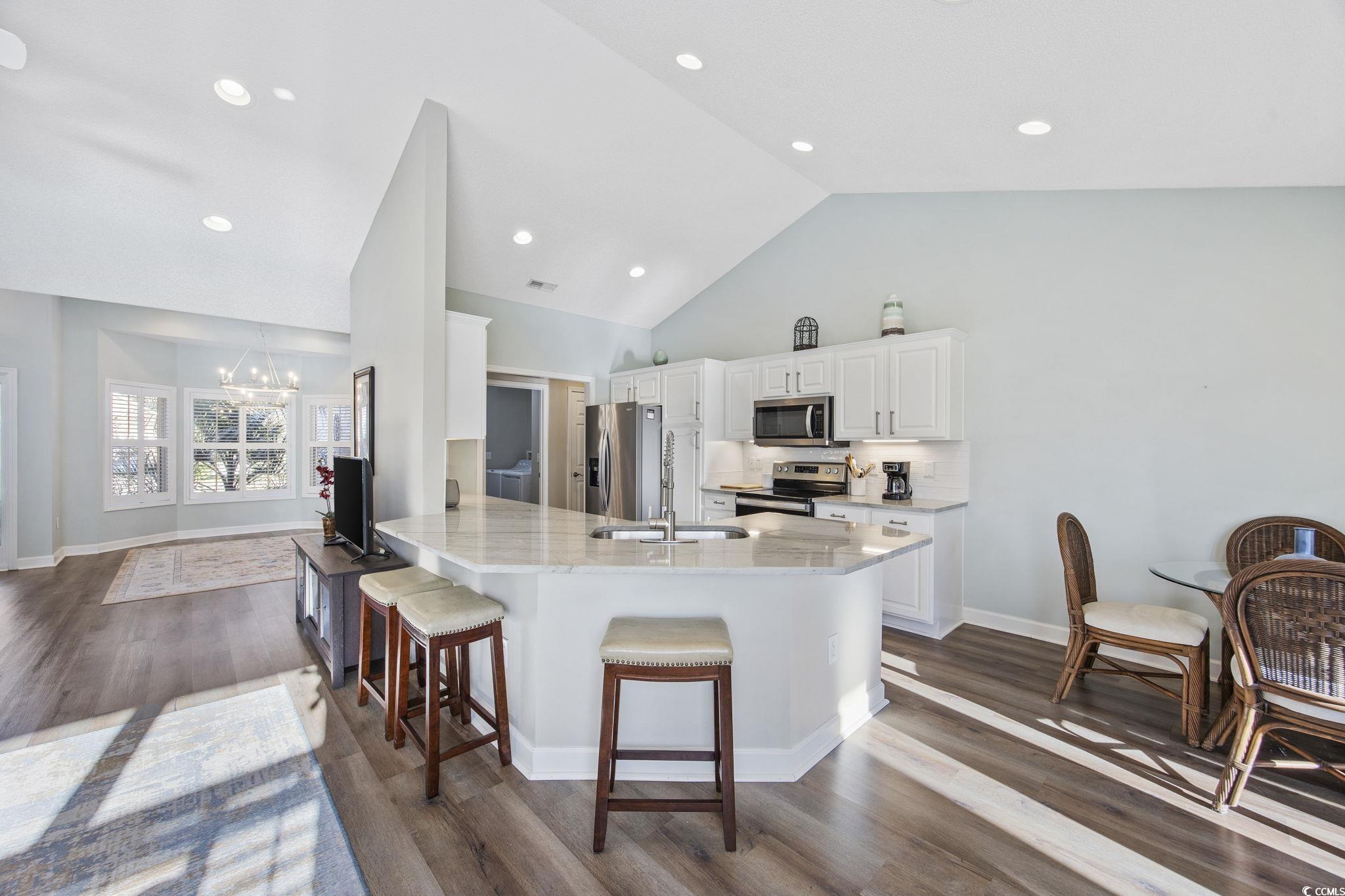 Stunning renovated home, "all furniture etc. included" brick front and back yard on lovely lake with fountain. Sit on a large screened in porch and enjoy the lake view. Vinyl plank flooring and new carpeted bed rooms. recessed lighting, vaulted ceilings, and fans. Gorgeous kitchen with highend granite, stainless appliances, cabinets with rollout shelves, and under counter lighting. Master suite doors to porch with lake view. New master bath, granite vanity, large shower, and soaking tub. Plantation shutters throughout including window treatments. In ground lawn sprinkler system. Located in Little River in a quiet peaceful community with a low HOA fee. Close to beaches, shopping, golg, and restaurants. Easy access to Hwy's 31, 17, and 9.