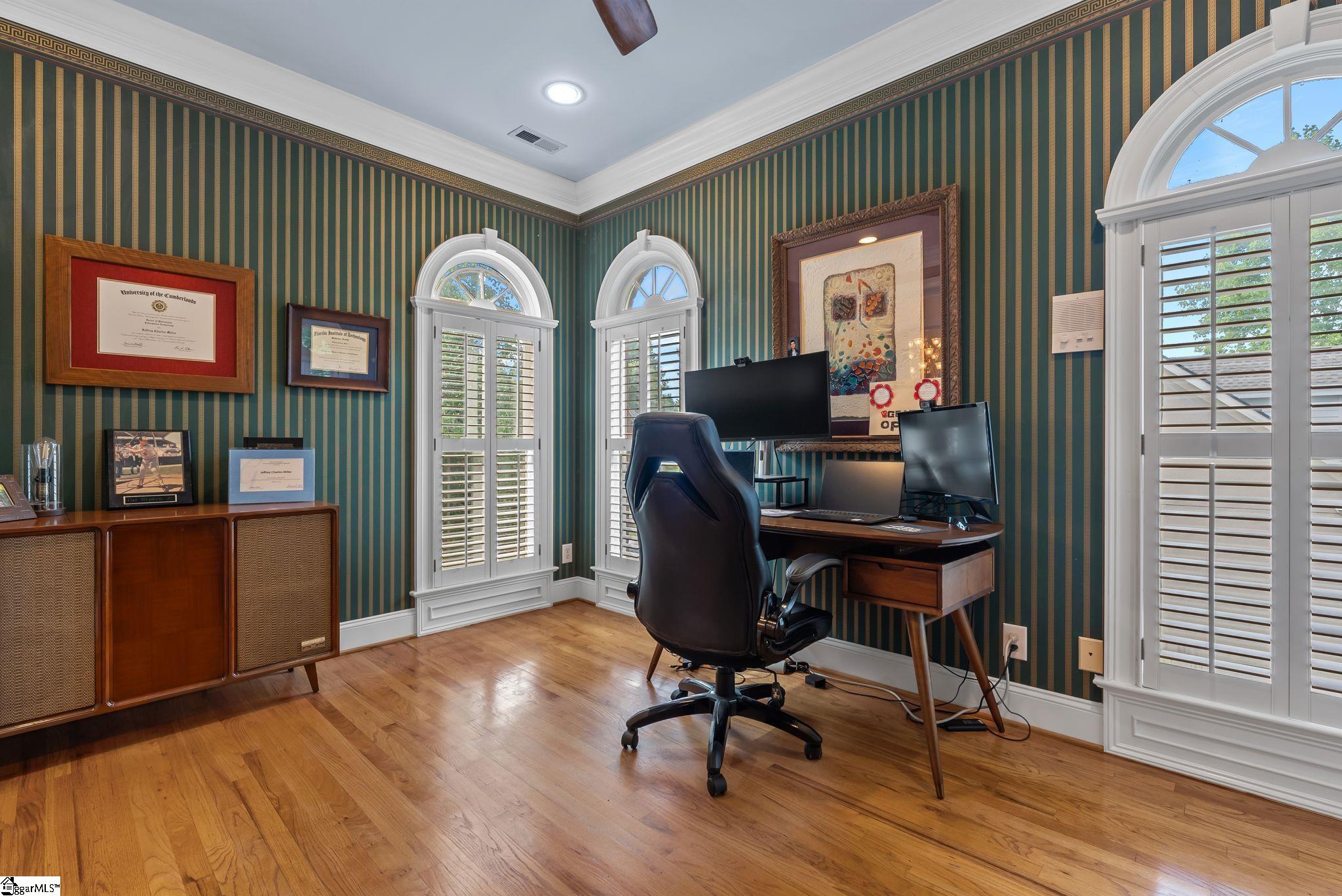 Welcome to 121 Berrow Way, a golf course home with new luxury updates throughout. Located on the 13th fairway on Pebble Creek's Creekside Golf Course. This expansive 5 bedroom, 4 1/2 bath home provides over 5,000sq/ft of thoughtfully updated living space designed for both entertaining and everyday comfort. Recent upgrades include brand new hardwood floors, a new roof, fresh interior paint, professional landscaping, a redesigned chef’s kitchen with new cabinetry, quartz countertops, and premium fixtures, fully upgraded laundry room, and new powder bath adds a modern touch. The main level features a soaring two story foyer, formal dining room, elegant living area, cozy den with fireplace, office, and a sunroom that opens to a freshly painted deck. The main level primary suite includes a spacious bedroom with an ensuite, and a large walk-in closet. Upstairs, you will find 2 bedrooms connected by a Jack & Jill bath, a third bedroom with its own full bath, a private office or study, and a versatile bonus room perfect for a media or playroom. The walk-in attic has permanent stairs and brand-new spray foam insulation, creating the potential for future expansion. The walkout basement lends even more flexibility with a large recreation room, private guest suite, full bath, wood burning fireplace, kitchenette, workshop, and access to a covered patio that overlooks the private, wooded backyard. Whether you are looking for multigenerational living, home office space, or a custom entertainment area, this home has it all. Located in one of Greenville’s most established golf communities, this is a rare opportunity to own a beautifully updated home in a premier setting. Schedule your own private showing today.
