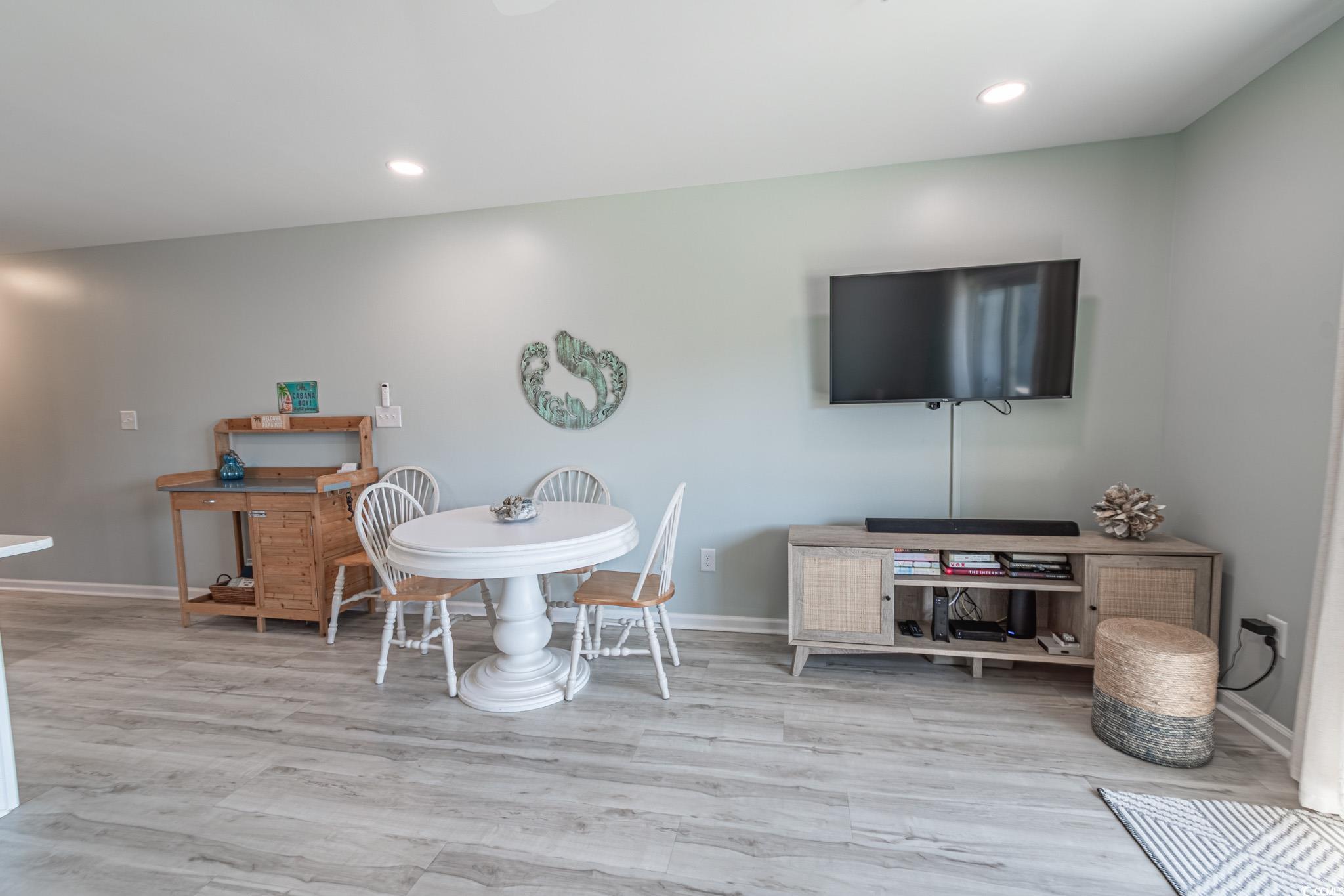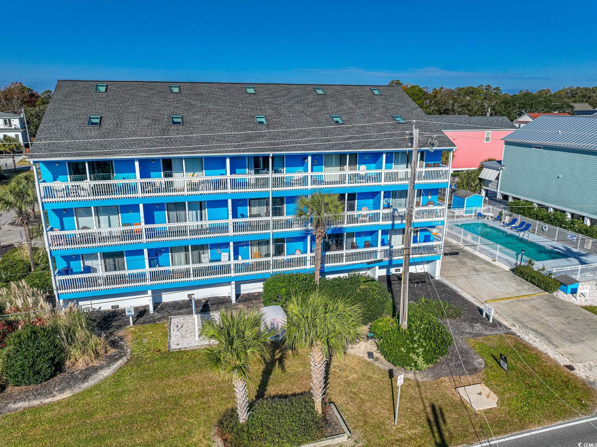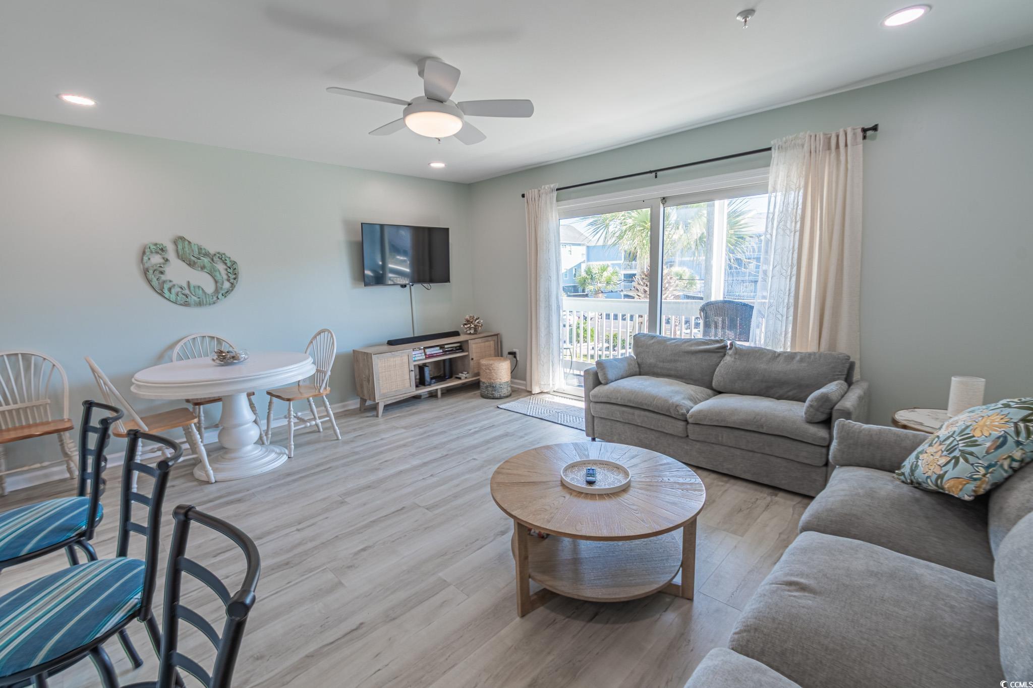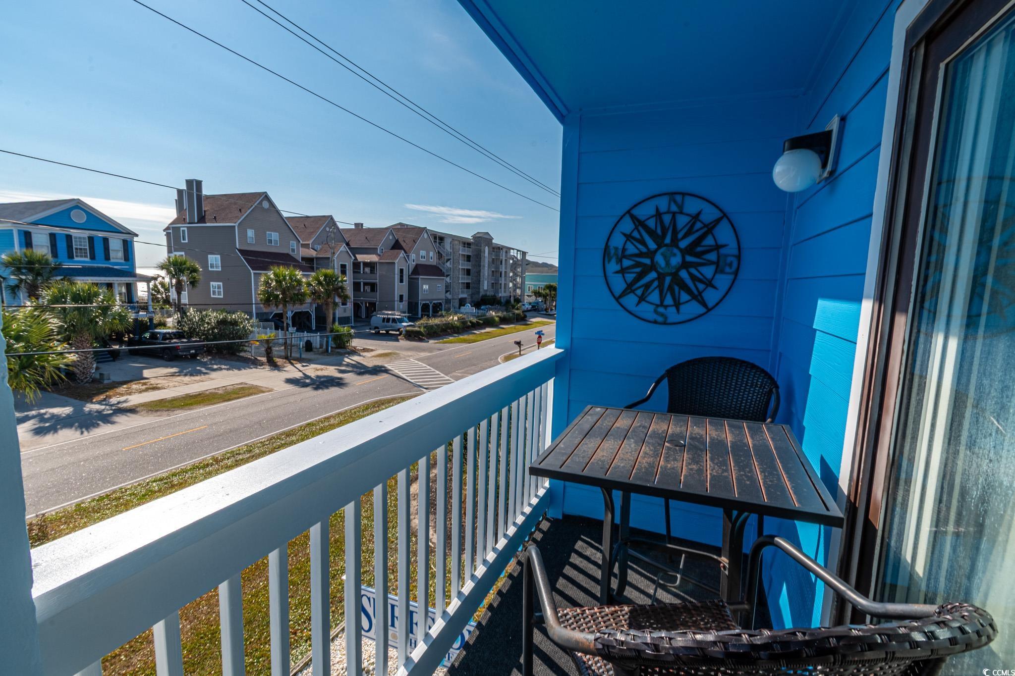 Enjoy coastal living in this second-row condo with stunning views of the beach in the desirable Surf By The Sea community. This condo features LVP flooring throughout and welcomes you with a foyer entry leading to a bright and open living space. The kitchen boasts white cabinetry, quartz countertops, custom tile backsplash, white appliances, and a shiplap eat-up breakfast bar. The living room includes recessed lighting, a ceiling fan, and a dining area, with sliding doors that open to the balcony—perfect for enjoying beach views and ocean breezes. Both bedrooms feature ceiling fans and ample closet space. The primary bedroom offers private access to the hall bathroom, which includes a vanity and a custom-tiled shower with a glass door. Additional highlights include an in-unit washer and dryer for convenience. Just a short walk across the street provides direct beach access. Surf By The Sea offers a private in-ground pool and a prime location near the Surfside Pier, shopping, dining, and entertainment. Square footage is approximate and not guaranteed. Buyer is responsible for verification.
