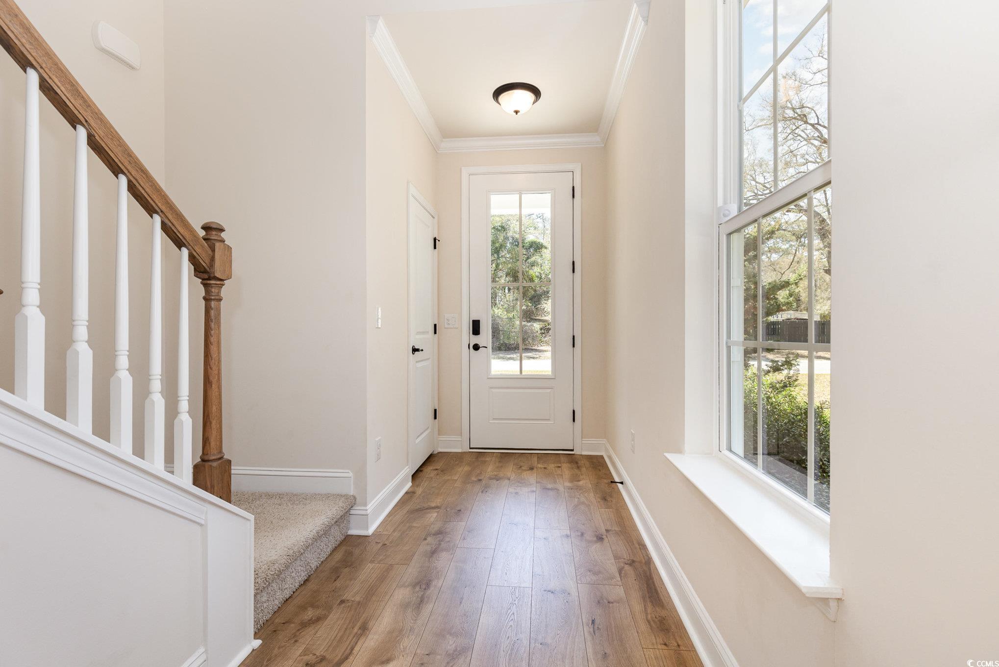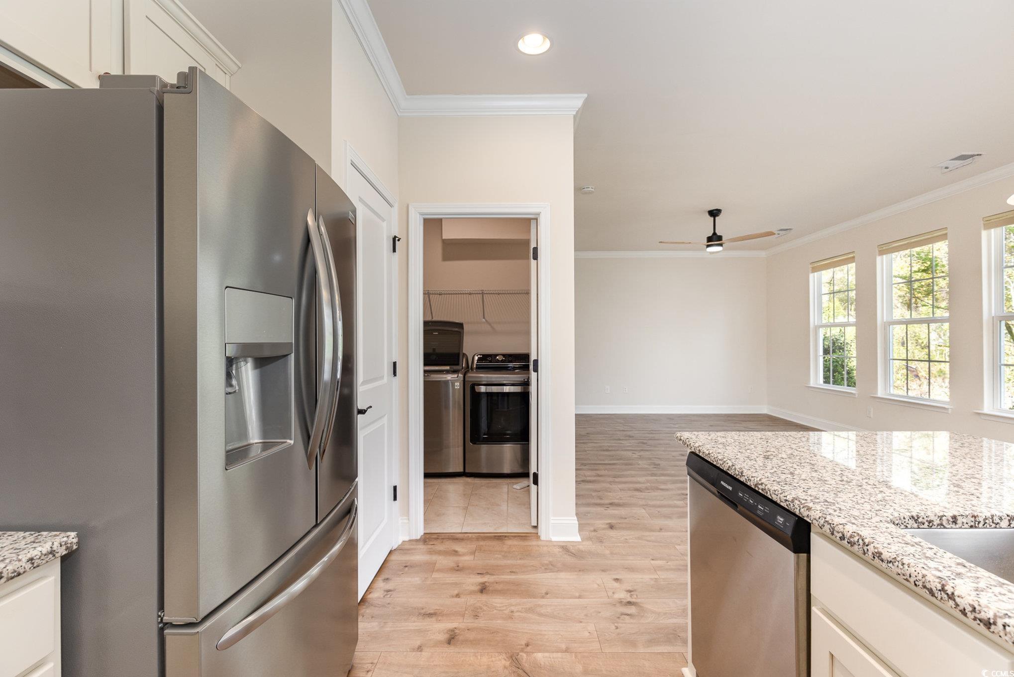 Welcome to Water's Edge! Tucked away with privacy on all sides, this beautifully maintained home offers a peaceful retreat while still being close to everything you need in North Myrtle Beach. As you walk into the living room, you're greeted with large windows letting in plenty of natural light and giving you a view of the back patio. The kitchen boasts granite countertops, stainless-steel appliances and pantry. Enjoy your morning coffee at the breakfast bar or on the back patio, with beautiful views of nature. The backyard also features mature, low-maintenance landscaping, irrigation with drip system, herb plot, and LED landscape lighting. Additional updates includeProSystems whole-house water filter, Reme Halo In-Duct Air Purifier, Premium-grade gutter guards, and much more! The upstairsMaster Bedroom offers gorgeous views of the backyard as well as vaulted ceiling and a large walk-in closet. For added convenience, you have a nook that can be used as an office or study. Water's Edge is conveniently located near all that North Myrtle Beach has to offer; great shopping, dining, a 5 minute drive to Cherry Grove Beach, and just one hour to Wilmington. The HOA fee includes weekly lawncare and mowing, as well as High speed fiber internet. Community amenities include outdoor pool, community center, and fitness room. Schedule your showing today!