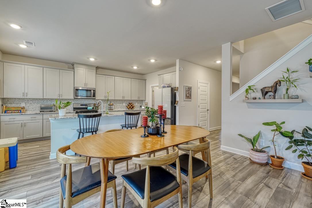 Stunning 4-bedroom/2.5-bath Craftsman-style home in the highly desirable Holland Park community—perfectly located in the heart of Spartanburg with convenient access to shopping, dining, and recreation. The main level features an open-concept living, kitchen, and dining area designed for both everyday comfort and effortless entertaining. The kitchen is equipped with a large island, beautiful tile backsplash, smooth cooktop, built-in microwave, and a walk-in pantry—all complemented by upgraded appliances that go beyond the standard builder package. Luxury vinyl plank flooring flows throughout the main floor, which also includes a half bath, a side-entry mudroom, and a versatile home office or additional den. Upstairs, the spacious primary suite offers a private retreat with a double vanity, full bath, and a walk-in closet. Three additional bedrooms, a full bathroom, a walk-in laundry room, and a loft/flex area provide optimal living space for any lifestyle. Enjoy outdoor living in the fully fenced backyard, just seconds from the neighborhood dog park, playground, and pool—ideal for both relaxation and recreation. Additional highlights include a tankless water heater, upgraded light fixtures, and custom window treatments, all of which remain with the home. This move-in-ready Craftsman gem combines modern upgrades, thoughtful design, and an unbeatable location—don’t miss your chance to call Holland Park home!
