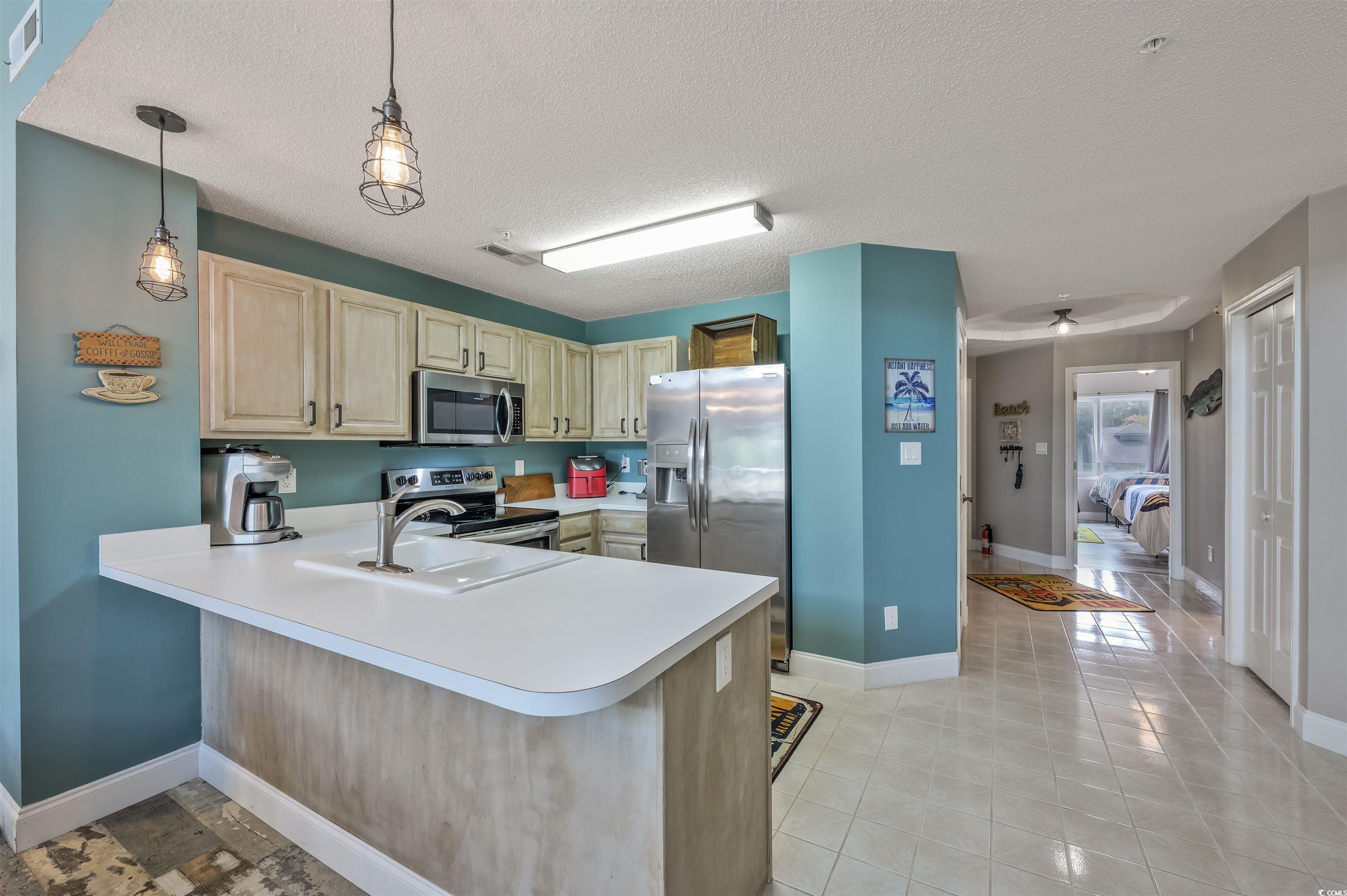 Located in Tidewater Plantation in North Myrtle Beach, this well kept 2BR/2BA second floor condominium blends coastal comfort with golf course and lake views. The open living area showcases the 10th hole of Tidewater Golf Club, while cathedral ceilings, skylights, and rustic porcelain floors create a bright, airy feel. The kitchen features stainless steel appliances and an easy flow for everyday living or entertaining. Enjoy a low maintenance lifestyle in a gated community with 24 hour security and an outstanding amenities package: three pools, tennis and pickleball courts, fitness center, on site dining, and an exclusive beachfront cabana with convenient parking near Cherry Grove. Ideal as a primary residence, second home, or lock and leave retreat. Lovingly cared for by a second home owner. Relax with morning coffee overlooking the trees and fairway or unwind in the evening as the lake reflects the end of the day. Close to beaches, dining, shopping, and area attractions. Schedule a showing to experience the Tidewater lifestyle.