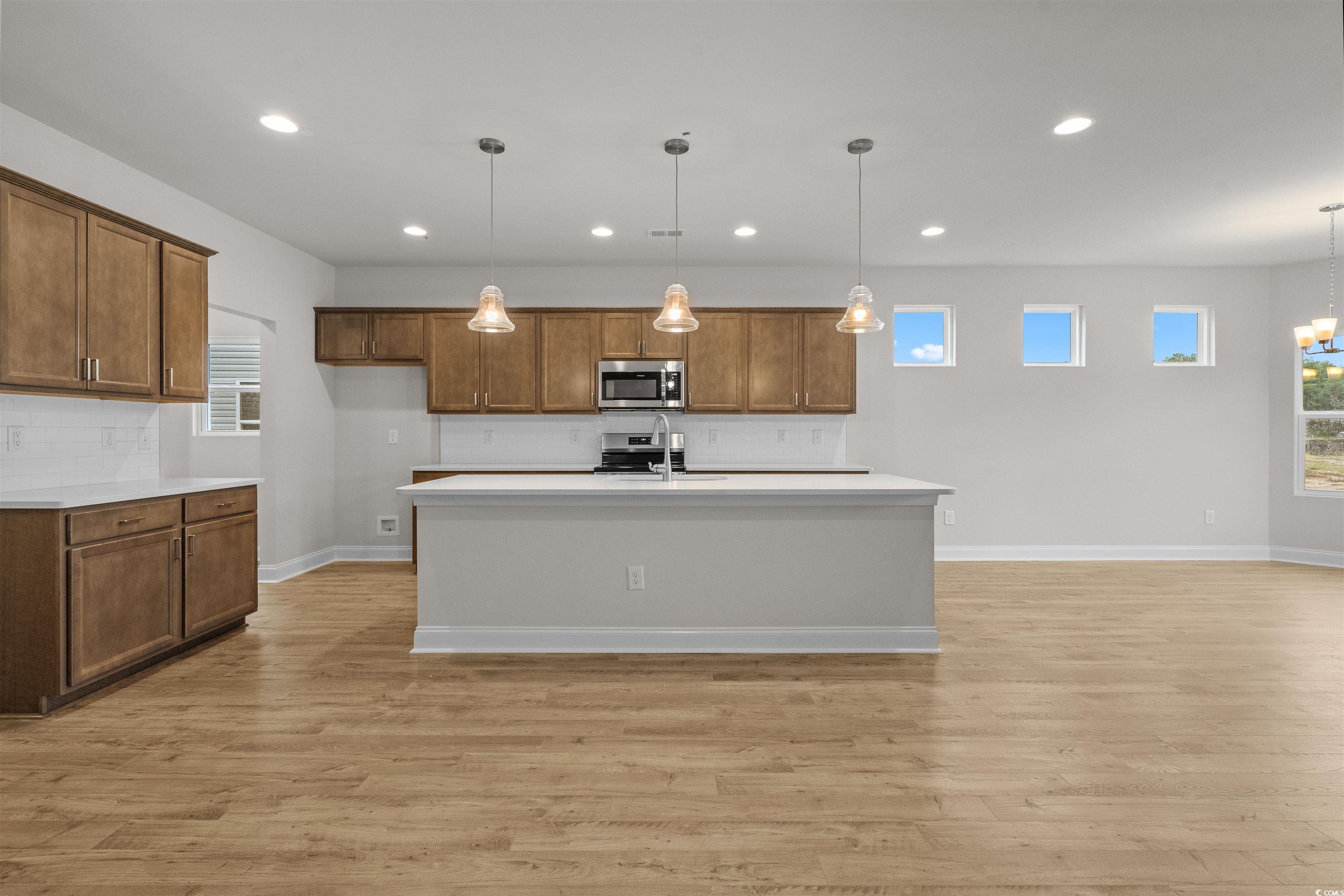 Welcome home to Calabash Station our newest community in the heart of Calabash NC. This is our Oceana 1 plan which boast 3 bedrooms, 2 full baths, formal dining room (or flex space), laundry, mud room and casual dining, along with covered front and rear porch. Our design team has added a dining bay window in the casual dining along with (3) additional windows in the casual dining for extra light. In the kitchen, (3) pendant lights and 6 can lights have been added. Upgraded Burlap cabinets with hardware and crown molding, single bowl Stainless sink, and Quartz countertops. The flooring is a 5.25" Laminate in the living areas and carpet in the bedrooms. Ceramic tile has been added to the baths. This home comes with full landscaping, irrigation and gutters. Too many features to list. Ready now. Pictures are actual. Fantastic location with easy access to 14 golf courses within a 7-mile radius and close to both North and South Carolina beaches, restaurants and shopping!
