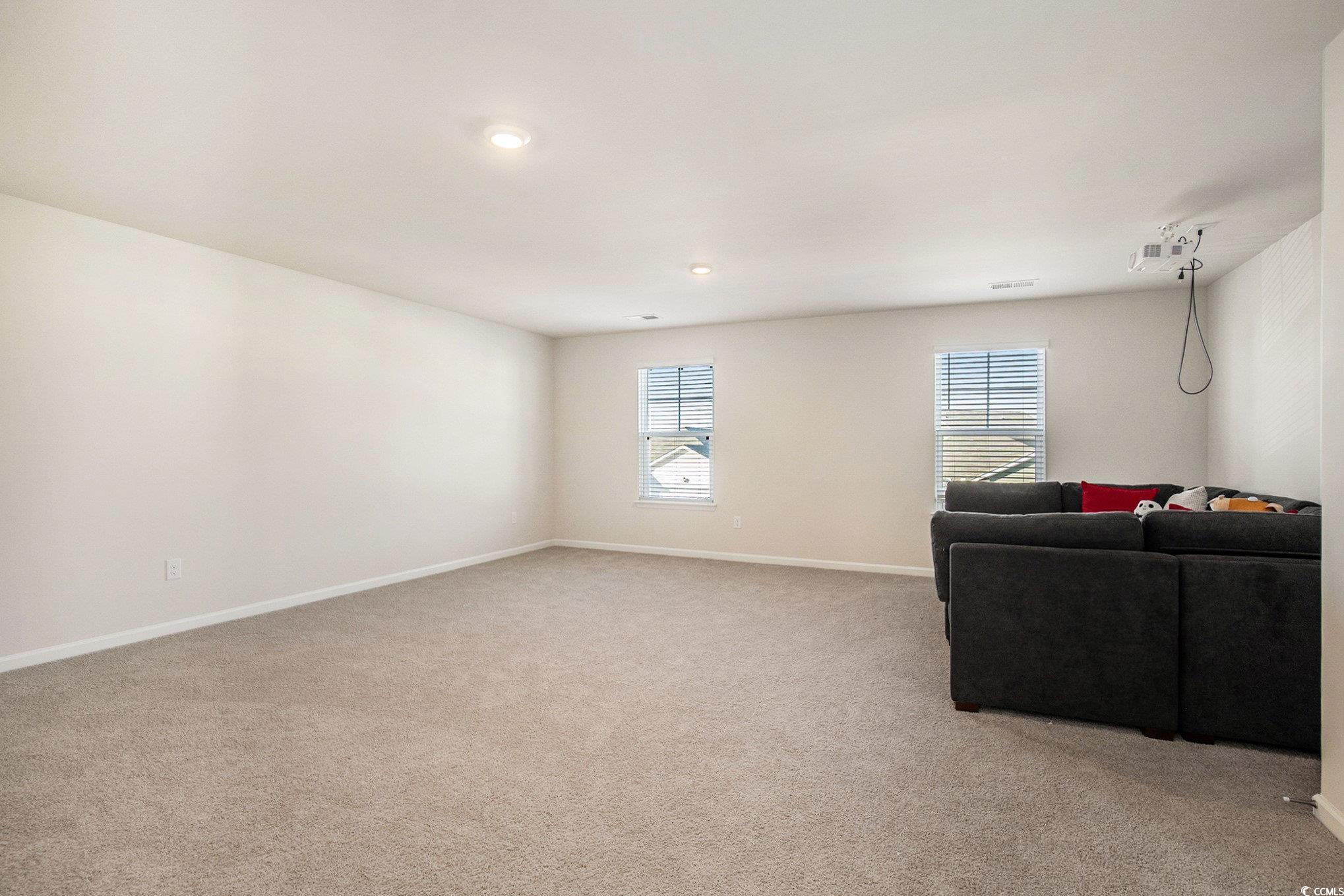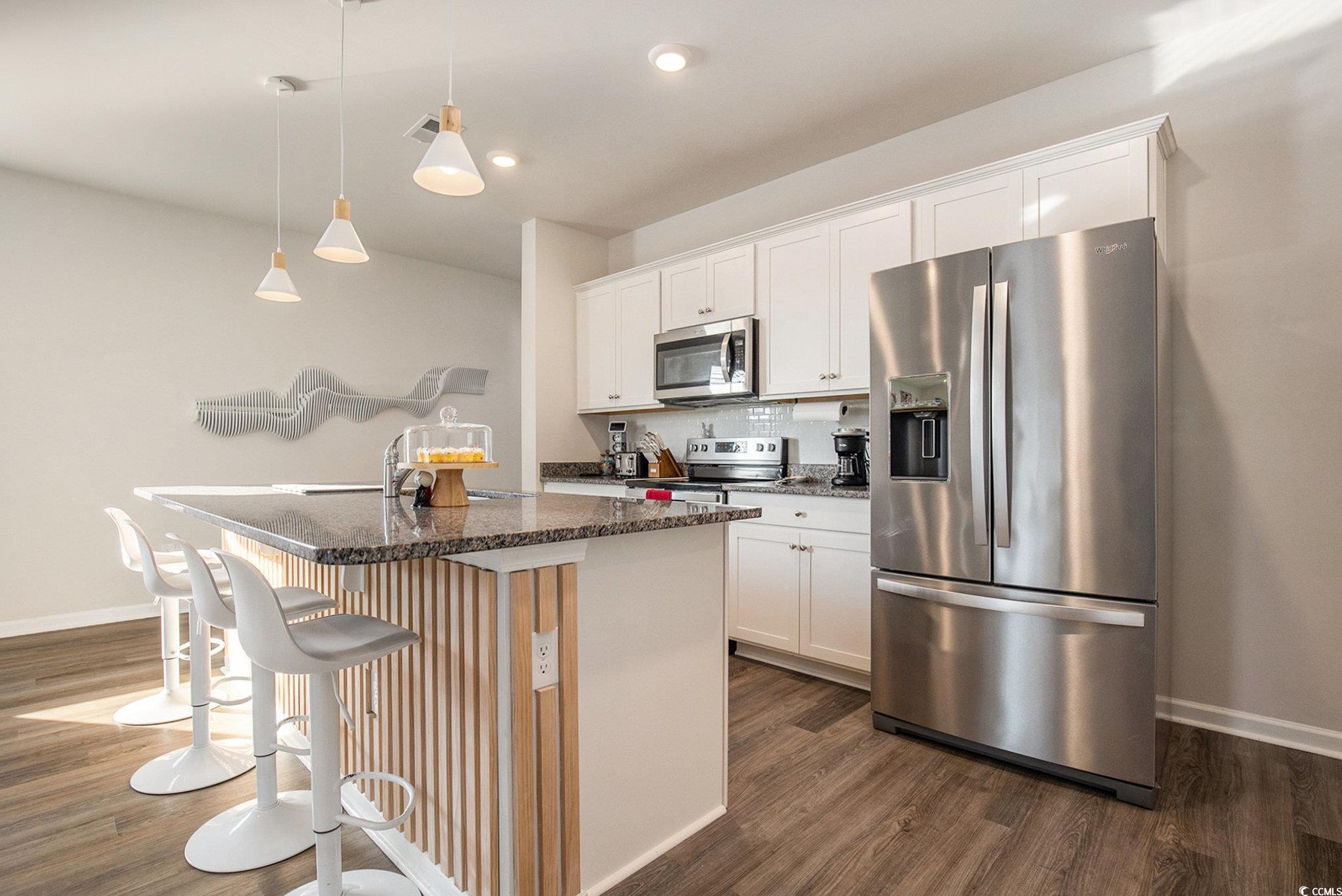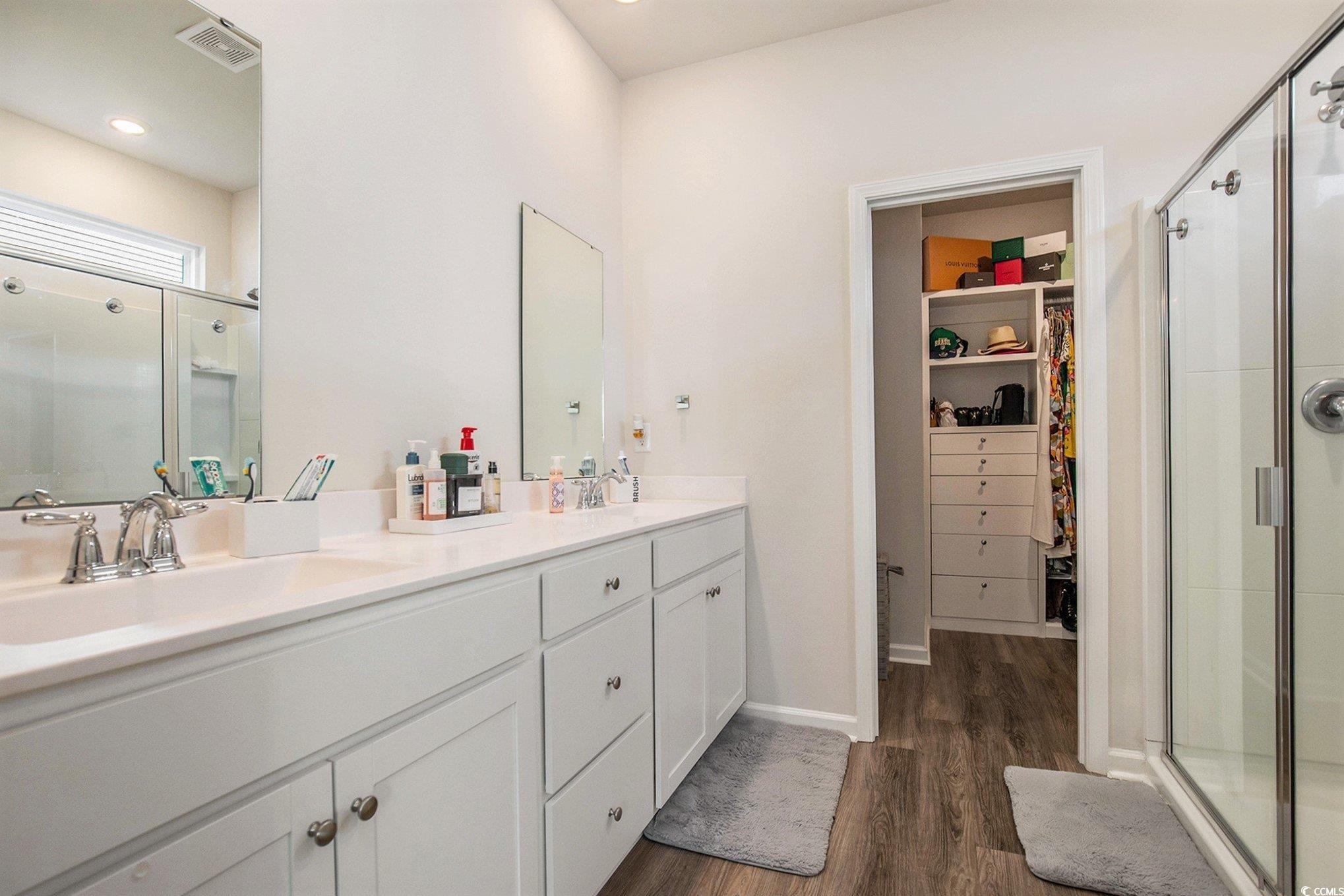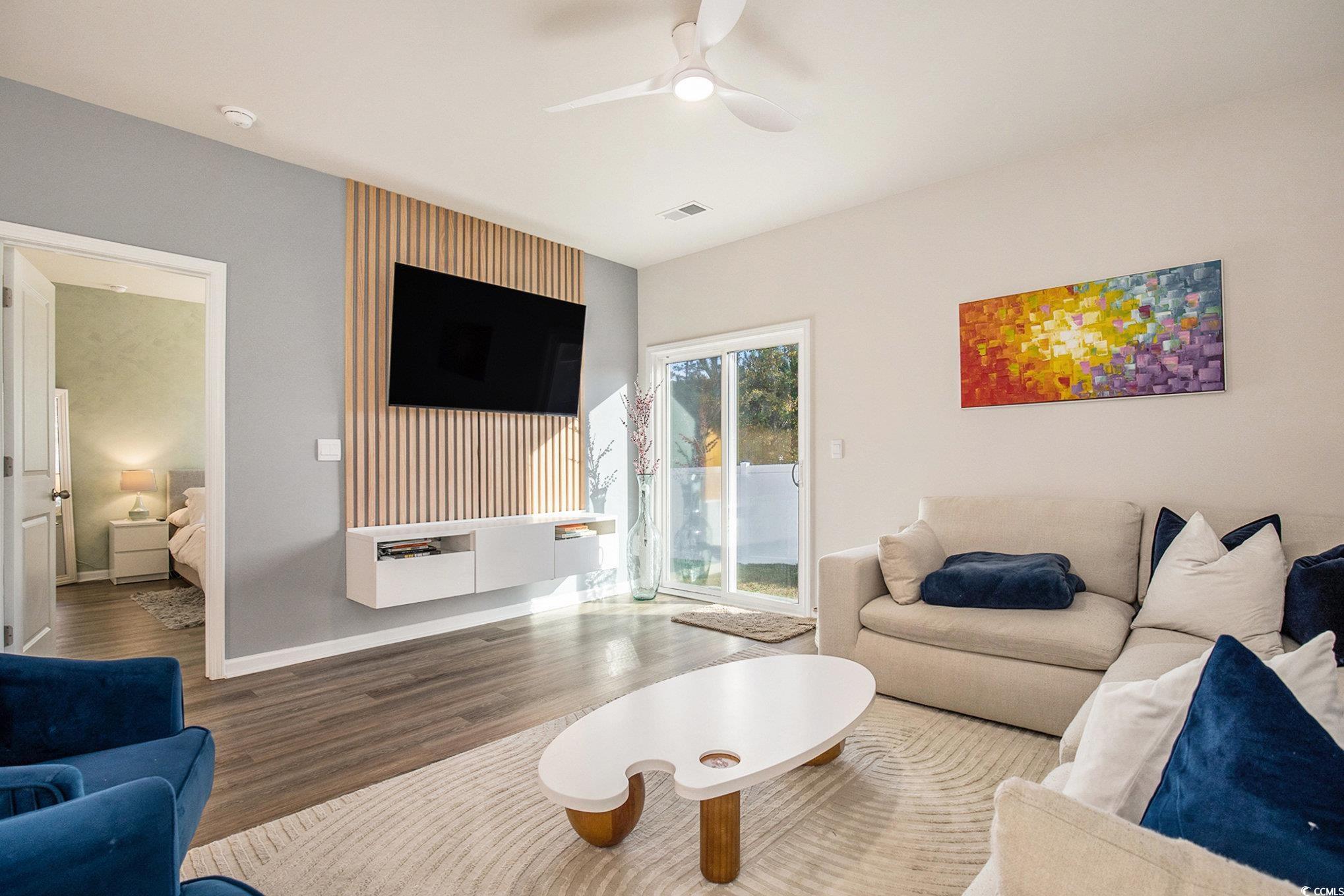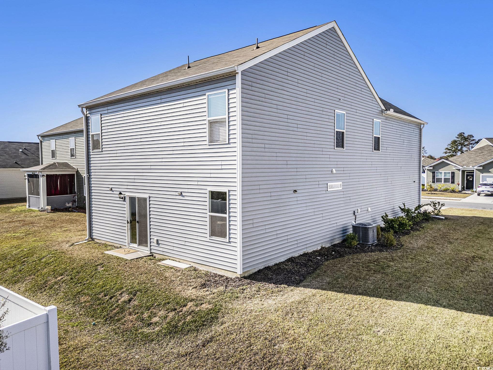 Welcome to this stunning 5-bedroom, 3.5-bath home in the Island Green community. Step inside through the foyer to an open first-floor layout featuring a spacious living room, a dining area off the kitchen, and beautiful LVP flooring throughout. The kitchen offers stainless steel appliances (refrigerator, range, microwave, dishwasher), granite countertops, an island, and custom shelving in the pantry. The first-floor owners suite includes a ceiling fan, a custom walk-in closet, and an ensuite bathroom with a double-sink vanity and walk-in shower. A laundry room, convenient half bath for guests, and a stylish “Hidden Bar” complete the main level. Upstairs you’ll find four additional bedrooms, including one that can function as a large family or media room. There are also two full bathrooms and a loft on the second floor. Enjoy easy access to the backyard through the sliding glass doors in the living room. Additional features include a two-car garage and a prime location just minutes from the beach, golf, shopping, and restaurants. Schedule your showing today!