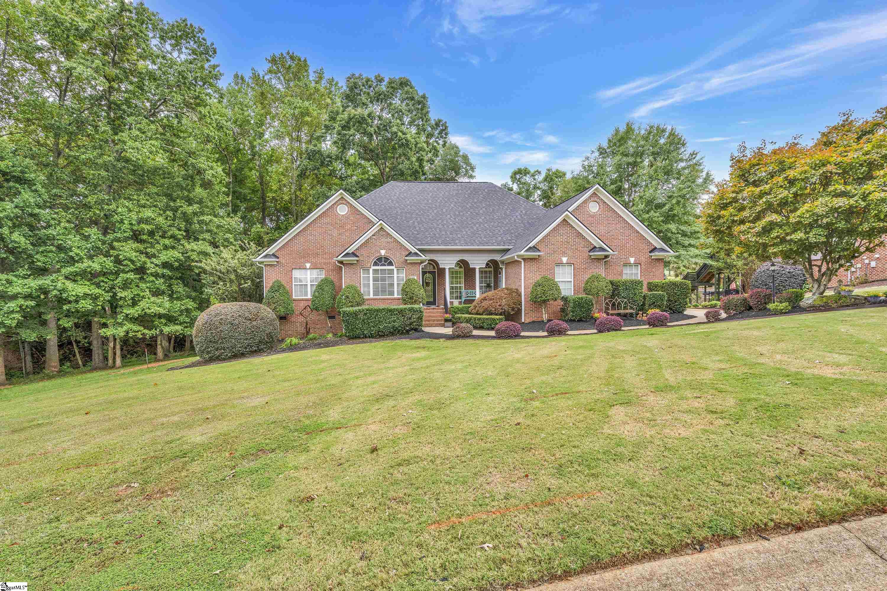 Stunning all-brick home located in the desirable Woodfin Ridge Golf Community, providing resort-style amenities including a clubhouse, golf course, tennis courts, swimming pool, and playground. With so much available right at home, there is truly no need to vacation elsewhere. This well-designed home features three bedrooms and two full baths on the main level, including a spacious primary suite, along with a full walk-out basement that has incredible flexibility—ideal for an in-law suite, teenagers, or adult children. The main level includes a formal dining room with double tray ceilings and wainscoting, perfect for entertaining. The great room is spacious with a vaulted ceiling, providing an excellent gathering space for family and guests. A double-sided gas-log fireplace connects the great room to the sunroom, creating a warm and inviting retreat for relaxing or reading. A dedicated office is located at the front of the home, and the layout features a desirable split-bedroom plan. The kitchen is a cook’s dream with granite countertops, abundant cabinetry, generous counter space, and a separate pantry. The spacious breakfast area overlooks the screened-in porch and opens to a deck, ideal for grilling and outdoor gatherings. The deck and porch overlook a private, fenced backyard situated along the 10th fairway, with mature trees providing excellent privacy. The primary suite, located on the main level, features a double tray ceiling with ceiling fan and private access to the screened porch. The en-suite bathroom features double vanities, a whirlpool tub, walk-in shower, and two walk-in closets. The lower-level walk-out basement is fully equipped with a second kitchen featuring stainless steel appliances (to remain), a full bathroom, walk-in closet, and a large gathering area currently used as a studio apartment. This space has endless possibilities and includes additional storage, along with access to a private patio and driveway. Additional features include a walk-in laundry room, ample storage throughout, and a 4-ton HVAC unit. Conveniently located just minutes from Lake Bowen, interstate access, and retail shopping.
