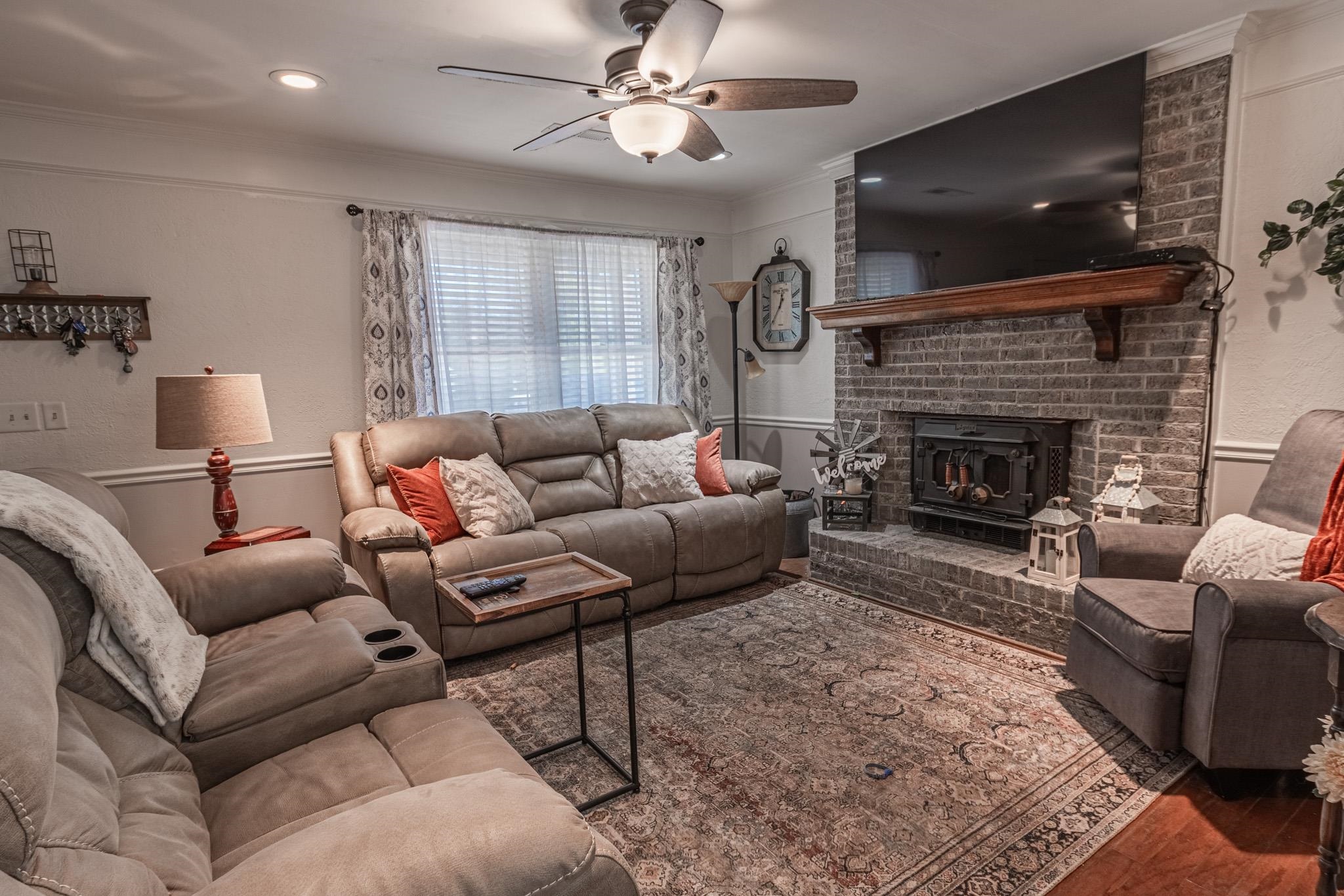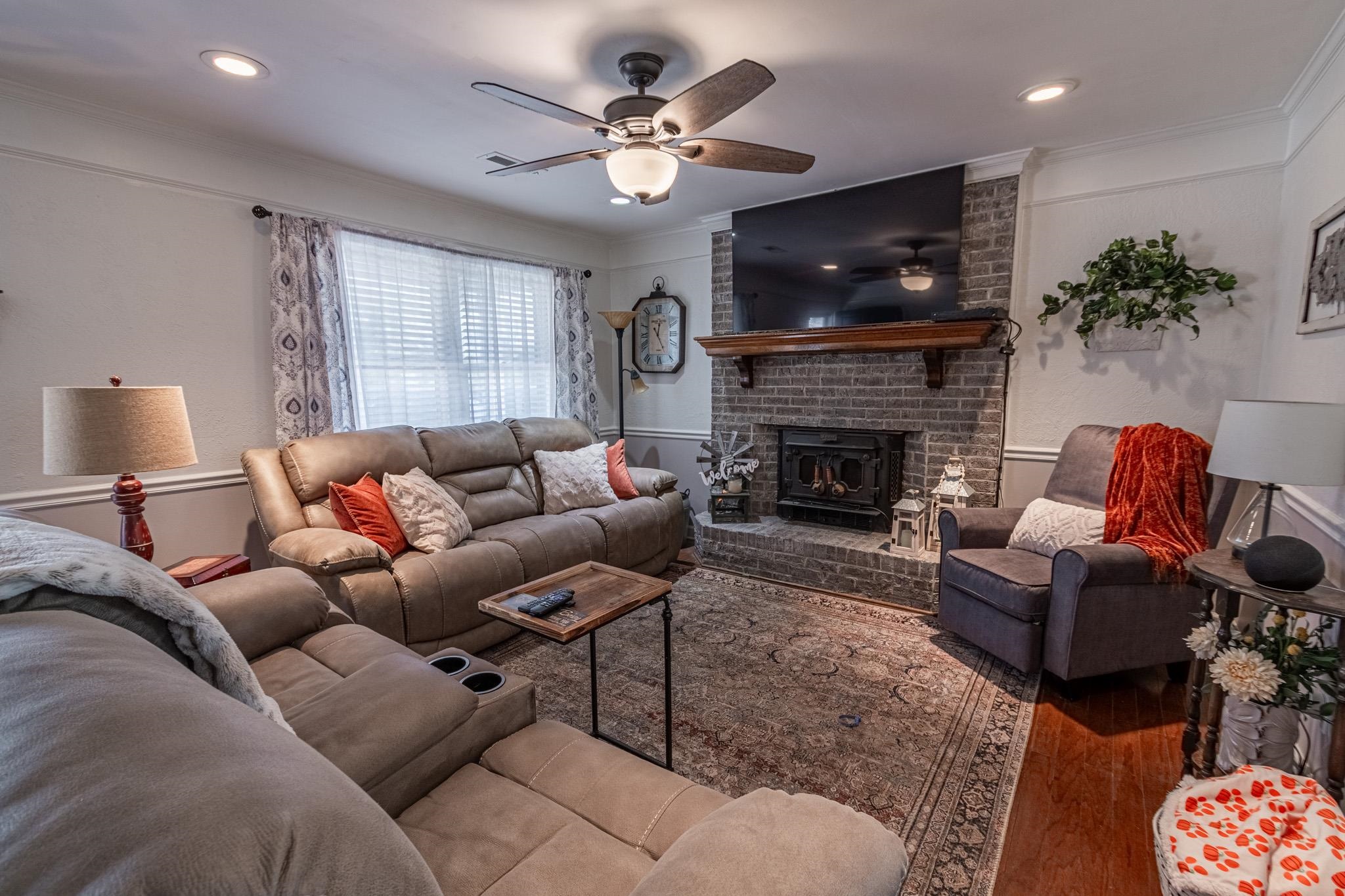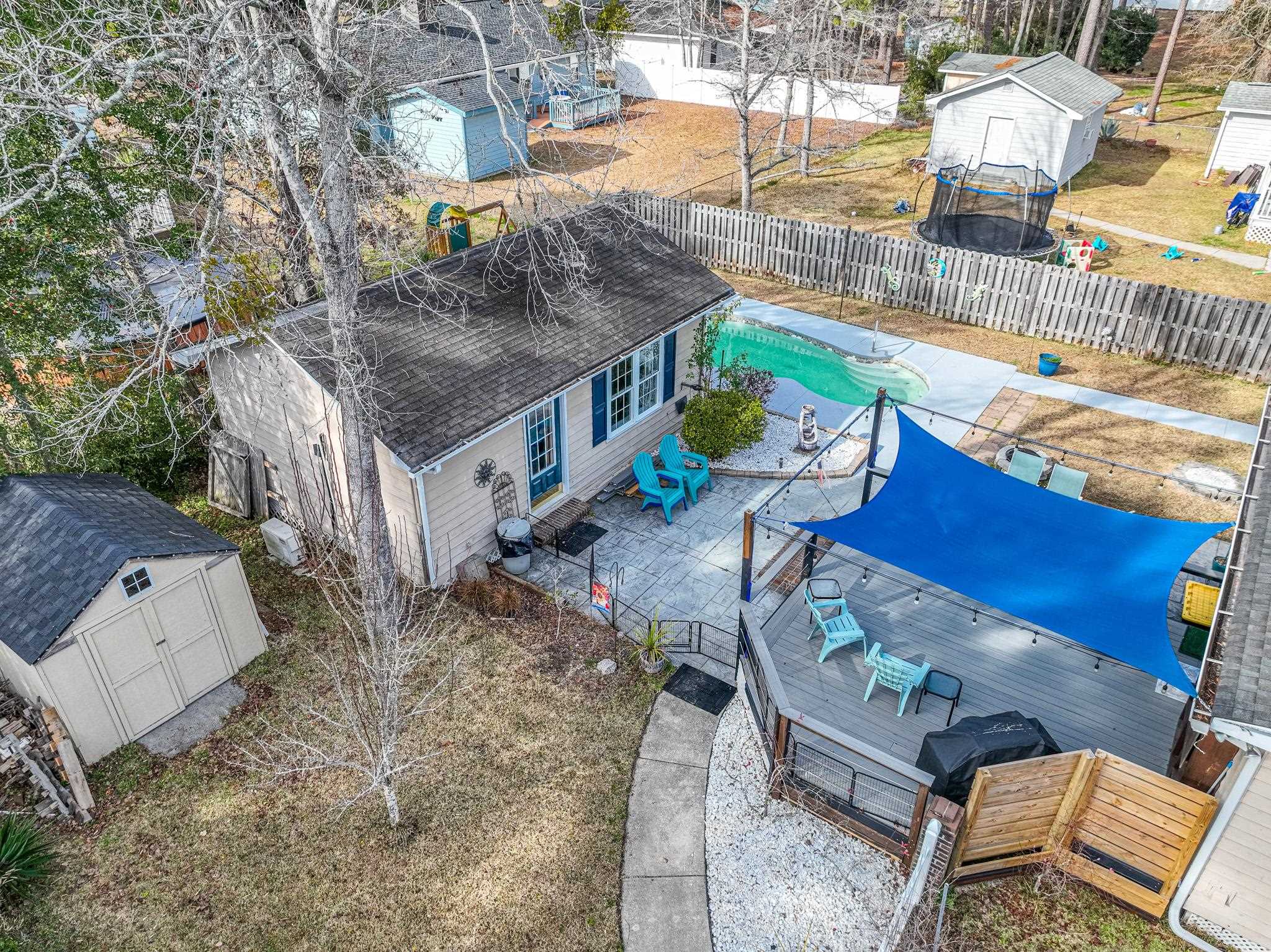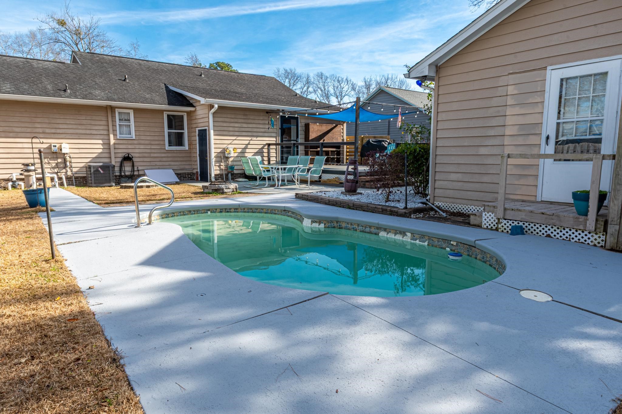 Welcome to this charming three bedroom, two bath home with private pool and pool house located in the Country Manor community of Myrtle Beach—featuring NO HOA restrictions! Large covered front porch that adds great curb appeal and outdoor living space. The inviting living room showcases a charming brick, wood-burning fireplace and ceiling fan, creating a warm and comfortable gathering space. The kitchen is well-appointed with stainless steel appliances, white cabinetry, a pantry, breakfast bar, and a dedicated dining area. A conveniently located laundry room sits off the kitchen for added functionality. The primary bedroom includes a ceiling fan, walk-in closet, and a private bath with vanity and shower. Two additional bedrooms feature ceiling fans and share an updated hall bath with vanity and tub/shower combination. Step outside to a fully fenced backyard designed for relaxation and entertaining, complete with a spacious deck featuring new Trex decking, a firepit, pool house with mini-split system, detached storage building, and a private in-ground pool. Country Manor is conveniently located near shopping, dining, entertainment, and just a short drive to the beach—making this home an excellent primary residence or coastal retreat. Roof 2014, pool 2017, HVAC 2019, Trex deck 2025, lighting & fans 2019, appliances 2019, new sink 2019, new back door 2025. Crawl Space encapsulated Dec 2025. Square footage is approximate and should be verified by buyers.