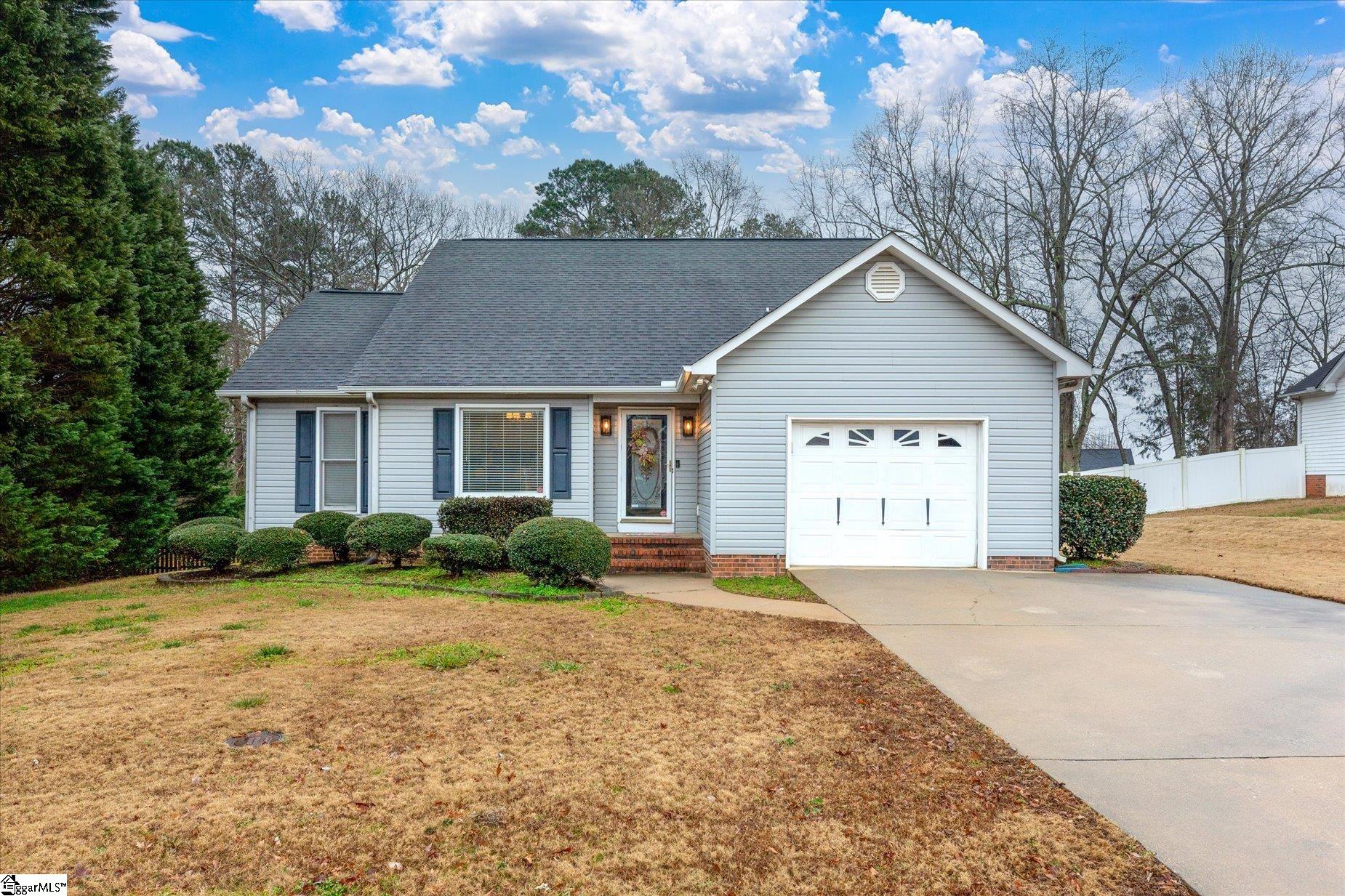 Welcome home! Great 3/2 Plus Large flex Room with view to below. Vaulted ceilings make this home seem larger than it appears. Tremendous parklike view from screened porch or deck makes you feel like you are in the country in this sweet home nestled perfectly between Five Forks shopping and Main Street Simpsonville. Inside, all 3 bedrooms on main with two full baths. Cozy wood-burning fireplace in super large living room. Kitchen is also large and holds dining area comfortably. New in home: fresh paint, new carpet, new water heater, new deck boards. Screened porch is where you will spend many months of the year! Beautiful outdoor living with fenced yard, view of the lake and extra large outbuilding with electricity for the hobbyist. Call for appointment today!