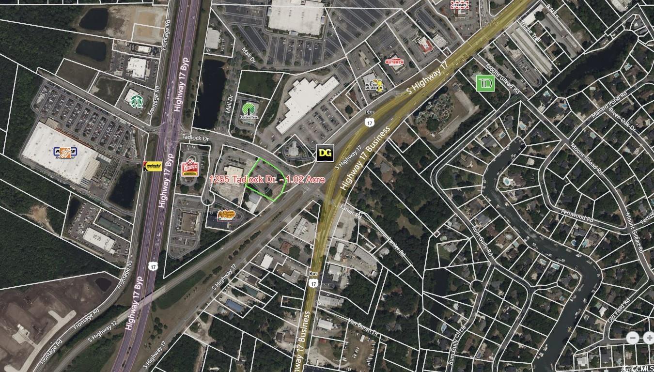 Prime Site Situated between Hwy 17 Business and Bypass Split at Tadlock Drive. This commercial site is situated in the highly developed Inlet Square Mall area. Highway Commercial zoning, which affords many commercial uses. Estimated 200' feet of Road Frontage on Hwy 17 Business. Surrounded by National Brands such as Mellow Mushroom, Wendy's, Hotel, Home Depot, Neighborhood Walmart, Starbucks Cracker Barrel, Inlet Square Mall (Mall redevelopment starting 2023).
