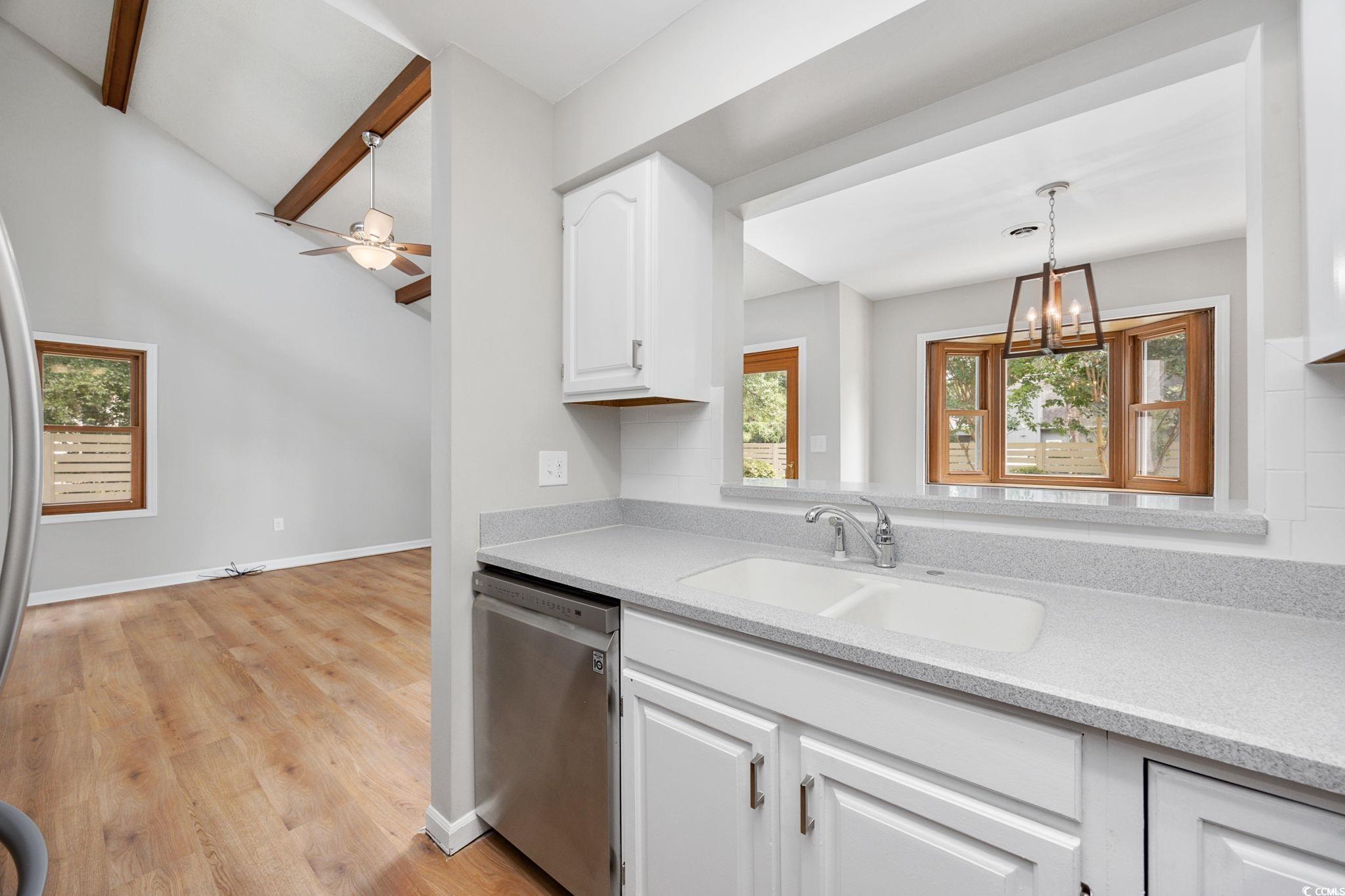 Two blocks north of Main Street and east of Hwy 17 business, this house shows like a builder's model. Located on the corner of 2nd Avenue N and Ash Street, it's been beautifully refurbished and updated, including smooth ceilings in all rooms but the vaulted great room (which also features a masonry fireplace and a loft). There is new LVP flooring throughout, updated kitchen with brand new stainless steel Whirlpool appliances, a new garbage disposal, and a new water heater. Both baths have been totally remodeled and updated. The hall bath has a new tile floor, commode, vanity, sink, lighting, and ceramic surround in the new steel tub/shower. The master bath is completely updated as well. In addition to the new tile floor, vanity, sink, commode, and lighting, the tub has been replaced with a new walk in shower with ceramic tile floor and surround, accessed thru a sliding glass barn door. The house has been repainted inside and out. Most of the light fixtures have been updated, and all ceiling fans are new and have remote controls (controls for bedroom fans are on the closet shelf closest to the door. The great room remote is on the mantel). The irrigation system has been updated with new sprinkler heads and a new control panel. The lawn has been re-sodded with centipede grass. This is one of the largest lots in Tilghman Woods, with room for a pool in the backyard if wanted. Surprisingly private for such a central location, the house is protected from public view by a wooden privacy fence on 2nd Ave N and Ash Streets. Easy ocean access is provided thru a private gate that opens onto 2nd Ave N. The HOA in this neighborhood is voluntary and is used only to maintain the common areas. Long and short term rentals are allowed. This house has been a private residence most of its life and is ideal as either a primary residence, a beach retreat, or an investment property. The home is located in an X flood zone, which means low flood insurance costs. Don't miss this opportunity to own a home in an established neighborhood close to Main St, close to the ocean, close to shopping, entertainment, and some of the finest dining on the Grand Strand.