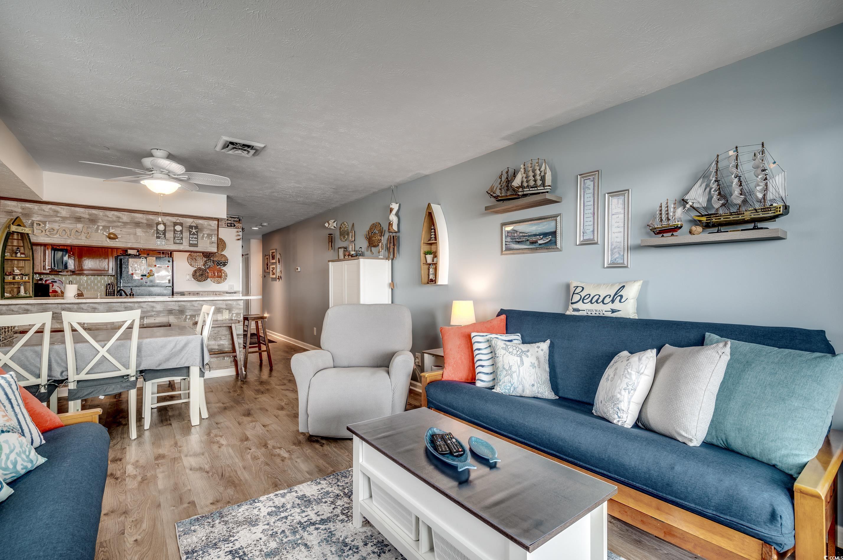 Experience coastal living in this end-unit oceanfront condo at 203 SandDollar. Located just north of the Garden City Pier, this fully furnished 2-bedroom, 2-bath retreat offers direct beach access, breathtaking views, and a perfect mix of comfort and convenience. Inside, the bright open floor plan features luxury vinyl plank flooring throughout. The kitchen has been refreshed with painted white cabinets, solid-surface countertops, a breakfast bar, and updated appliances—ideal for casual dining or entertaining. The primary suite includes a ceiling fan and ensuite bath with a tub/shower combo, while the guest bedroom has easy access to a refreshed hall bath. Step out onto your private oceanfront balcony and take in stunning sunrise views of the pier and shoreline. Additional features include a foyer entry, in-unit washer/dryer, and private ground-level storage for all your beach gear. Community amenities include oceanfront pool access through the Kingfisher Inn, plus a spacious sundeck with picnic tables, loungers, and an outdoor shower for convenient beach cleanup. HOA dues cover water, sewer, trash, cable, internet, pest control, landscaping, common area maintenance, and pool service. Each unit has one designated parking space, plus seven shared spaces. The nine-unit complex is both golf cart and motorcycle friendly. Short- and long-term rentals are allowed, providing strong rental potential. This prime location is just steps from the Garden City Pier’s fishing, dining, arcade, and live music, and minutes to Murrells Inlet’s MarshWalk and Myrtle Beach attractions, golf, shopping, and the airport. Whether you’re searching for a vacation home, rental investment, or full-time oceanfront escape, 203 SandDollar delivers. Explore the 3D Virtual Tour here: www.bit.ly/203SandDollar.