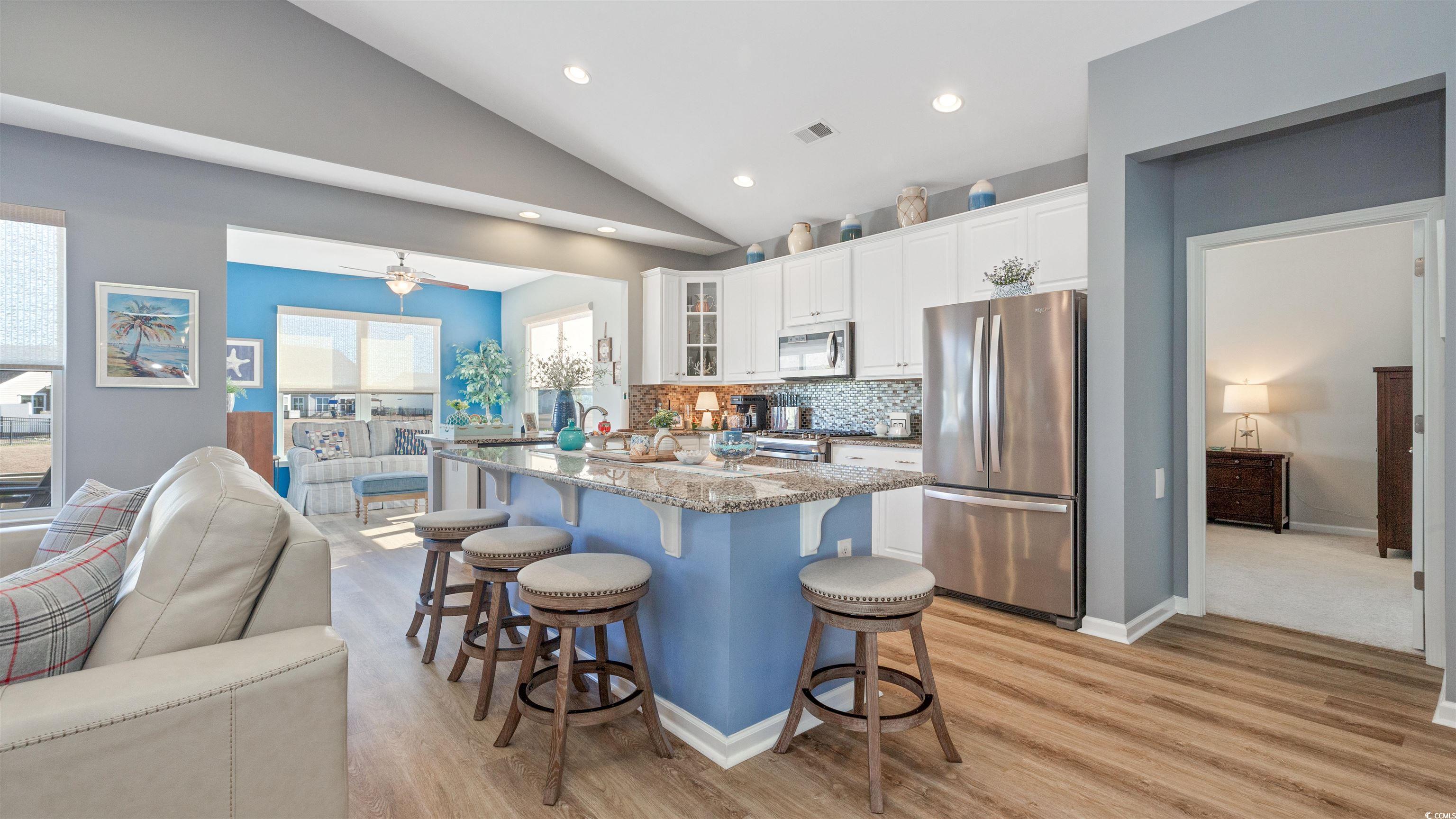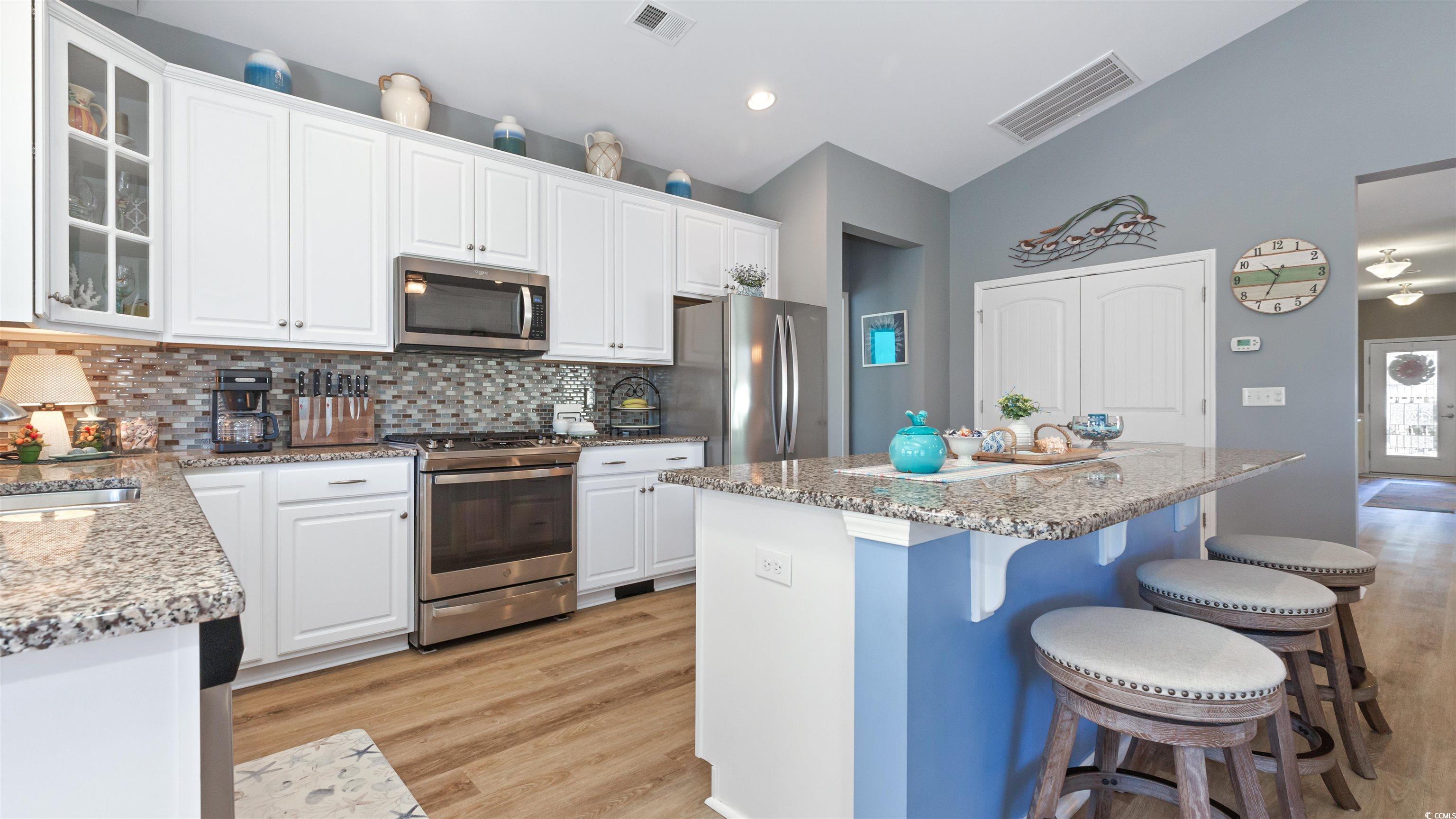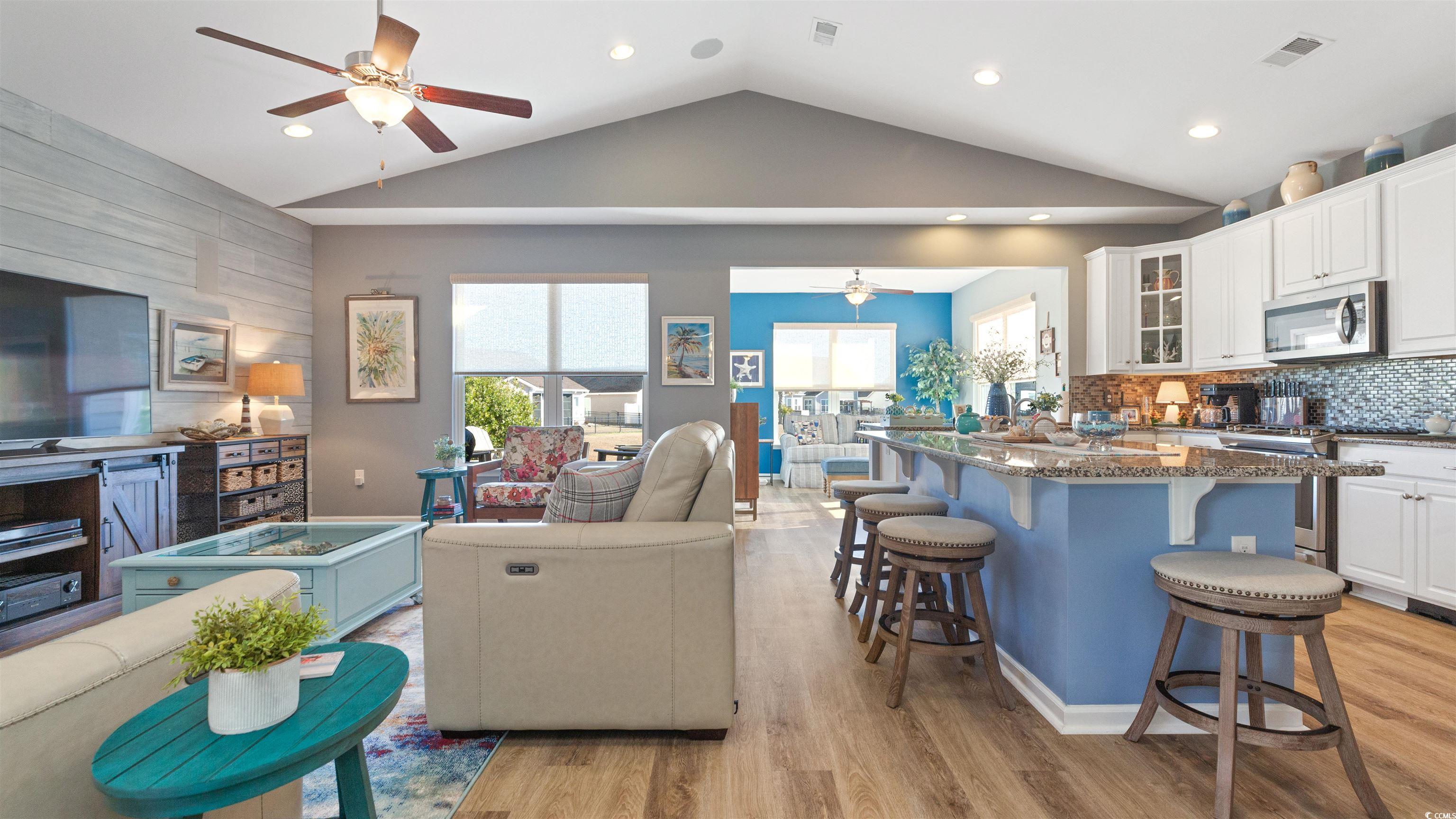 Welcome to Bella Vita, where living well isn’t just a phrase, it’s a lifestyle. This stunning 3-bedroom, 2-bath waterfront home, built in 2018, blends modern comfort with effortless coastal charm. Designed with an open-concept floor plan, the home features luxury vinyl LVP flooring, a striking shiplap accent wall in the living area, stunning wainscoting detail, and beautifully painted walls throughout. The spacious kitchen is the heart of the home, showcasing granite countertops, a large island, stainless steel appliances, and a generous pantry—perfect for entertaining or everyday living. Built-in stereo speakers enhance the living space, while the split-bedroom layout offers added privacy for guests or family. Retreat to the primary suite, complete with his-and-her sinks, a walk-in closet, and a serene spa-like bath. Step outside to enjoy peaceful water views from the stamped concrete outdoor space, enhanced by custom hurricane shutters and window coverings for both style and peace of mind. Residents of Bella Vita enjoy access to a fitness center and clubhouse with a full kitchen, all while being close to everything Myrtle Beach has to offer—shopping, dining, entertainment, and the beach. This is more than a home—it’s La Bella VITA! CIAO